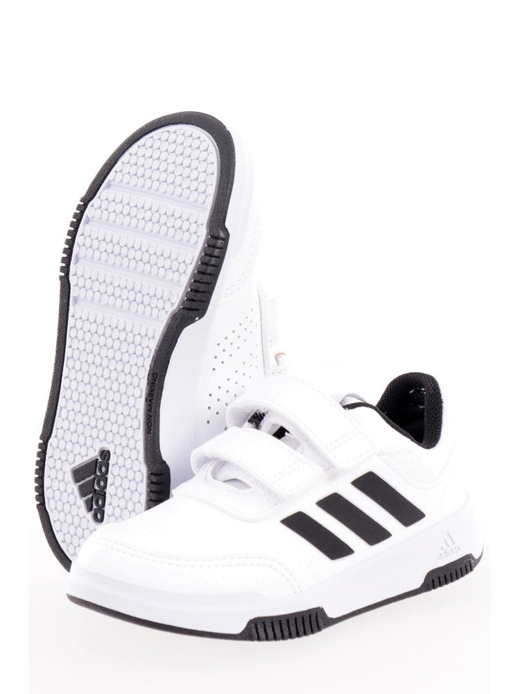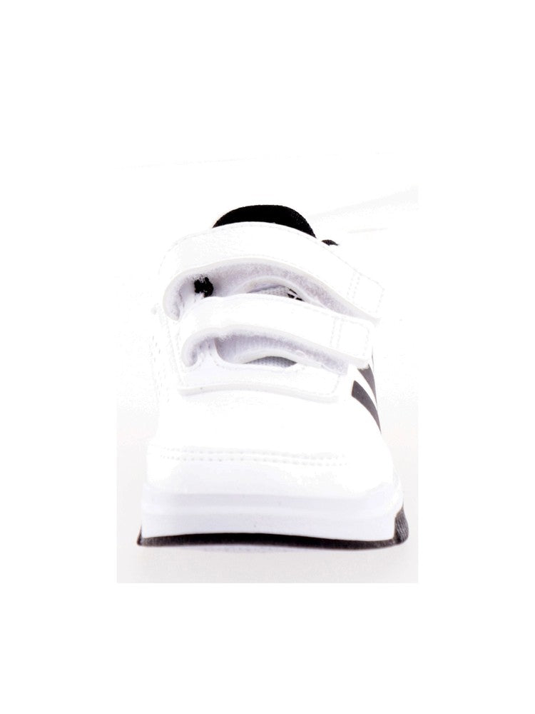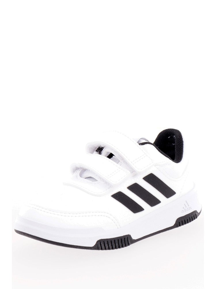 Scarpe Adidas bianche da bambino, modello Tensaur Sport 2.0 GW19. Queste sneakers Adidas bianche hanno la tomaia in mesh, la suola in gomma e il sotto suola con battistrada a pallini. Sul davanti di queste Tensaur Sport troviamo la chiusura con velcro, le iconiche 3Stripes ai lati della scarpa e il logo del brand a contrasto colore.