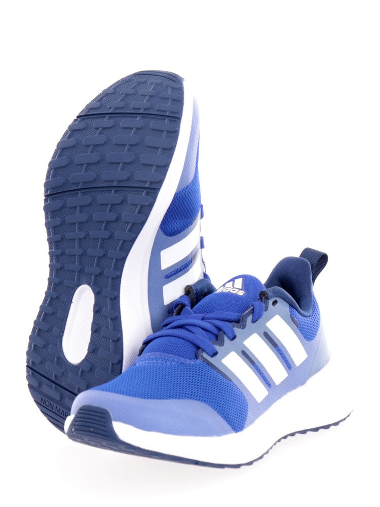 Scarpe Adidas blu da bambino con lacci, modello FortaRun 2.0 HP54. Queste scarpe da running Adidas blu hanno la tomaia in tessuto traspirante con inserti in mesh, la suola in gomma e il battistrada con texture geometrica. Sul davanti di queste sneakers Adidas troviamo la classica chiusura a lacci, le iconiche 3Stripes ambo i lati, la linguetta posteriore che agevola l'entrata del piede e il logo del brand a contrasto colore.