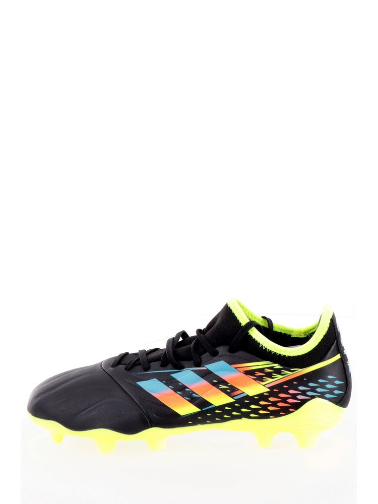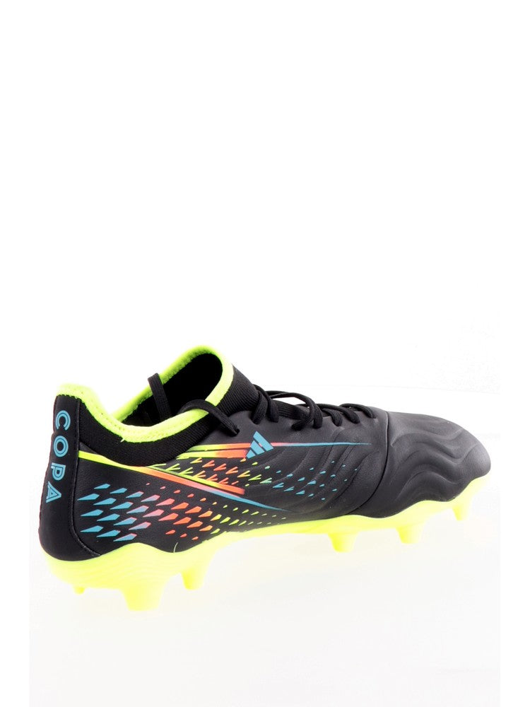 Scarpe da calcio Adidas nere e gialle Copa Sense.3. Queste scarpe da calcio Adidas hanno la tomaia in mesh, la classica chiusura con lacci, la struttura avvolgente per dare il massimo supporto al piede, il calzino interno e la suola in TPU che le rende ideali per le superfici compatte. Logo Adidas al lato e lettering 'Copa' sopra il tallone.