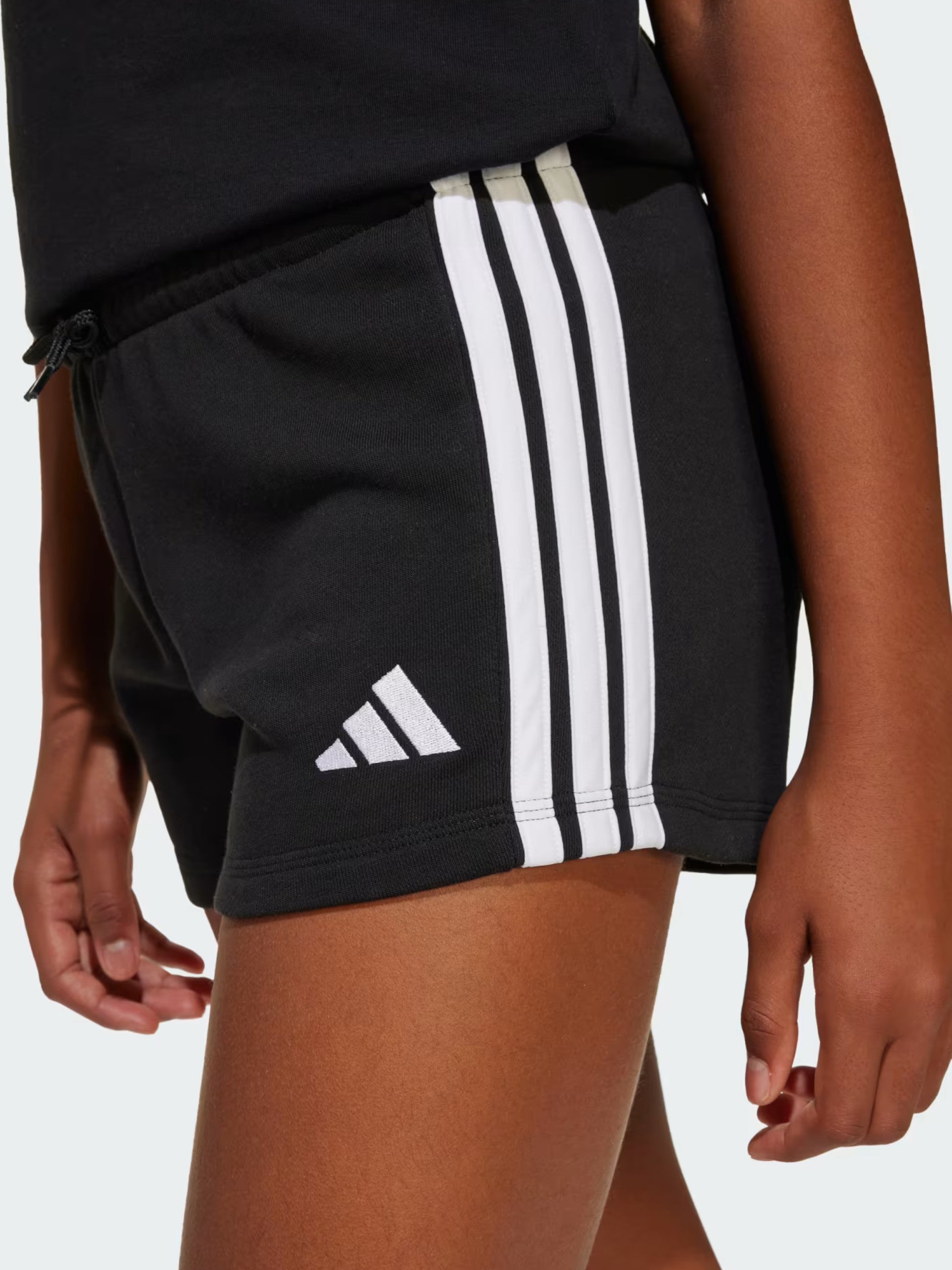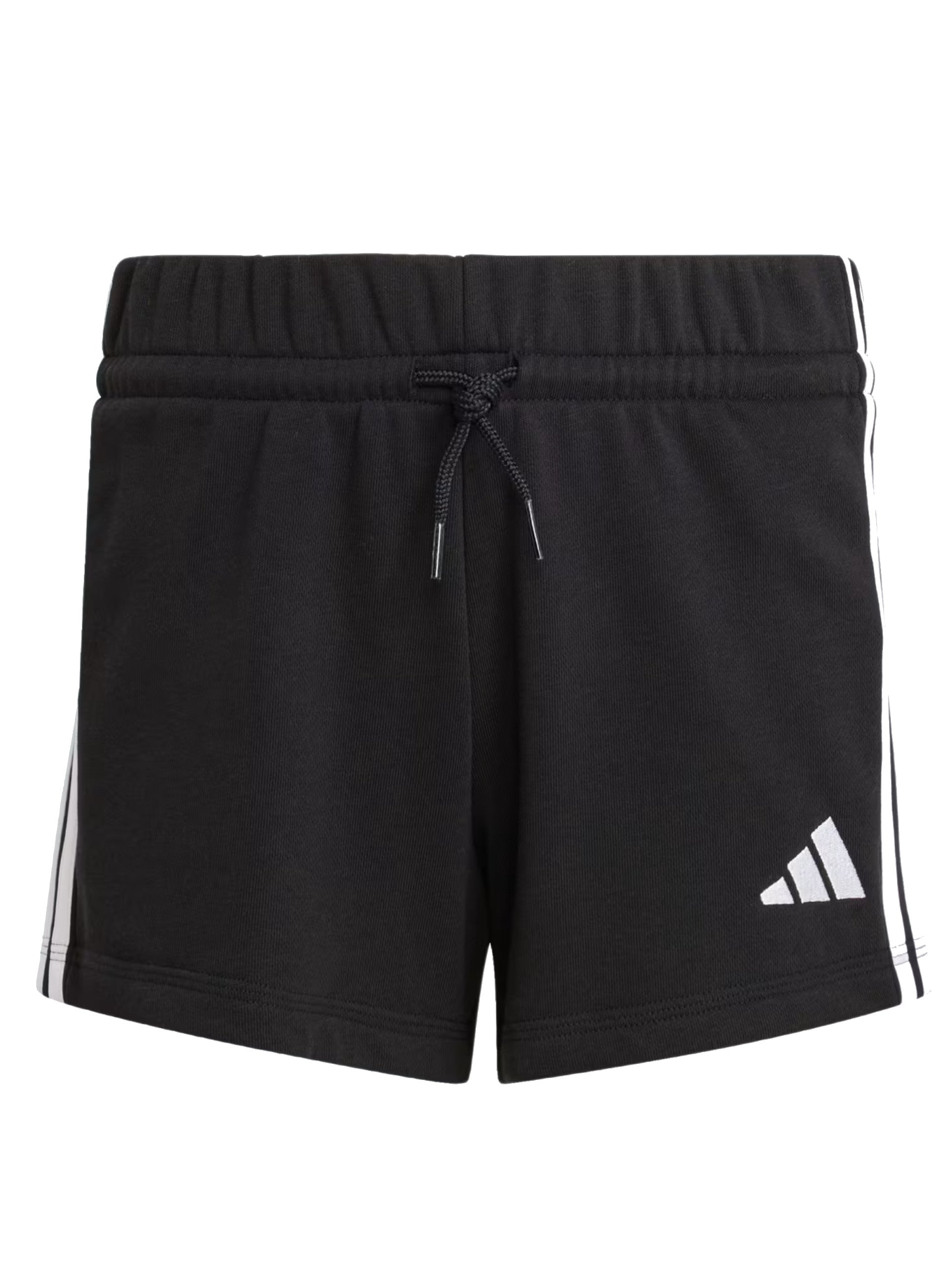 Shorts Adidas neri da bambina 3Stripes JJ3386. Questi pantaloncini Adidas neri hanno la banda elastica sul punto vita regolabile con laccetti, le iconiche 3Stripes ambo i lati e il logo Adidas biancoricamato sul lato sinistro.