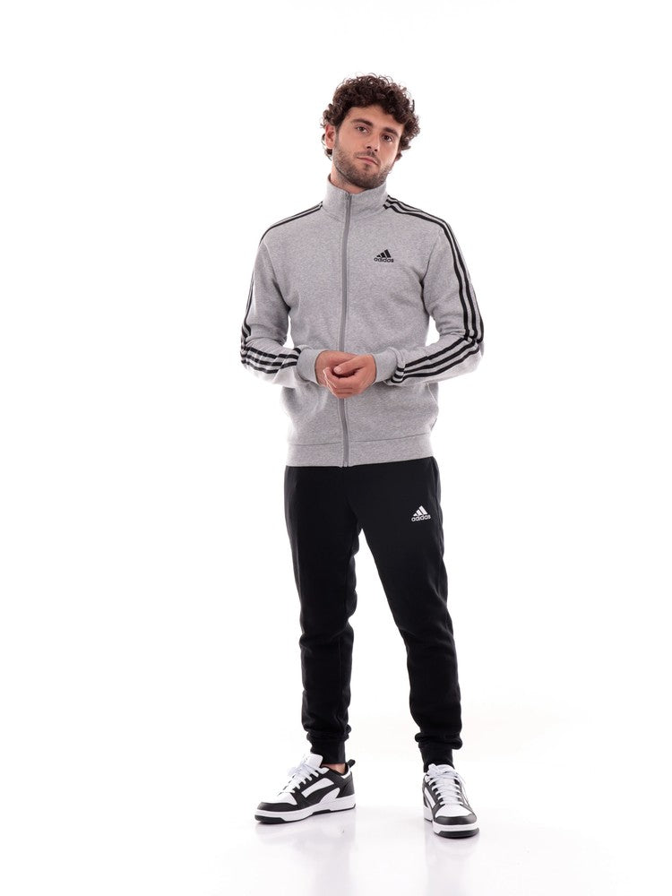 Tuta Adidas Grigia da Uomo composta da felpa a collo alto 3stripes con tasche e pantaloni neri con polsini e tasche.