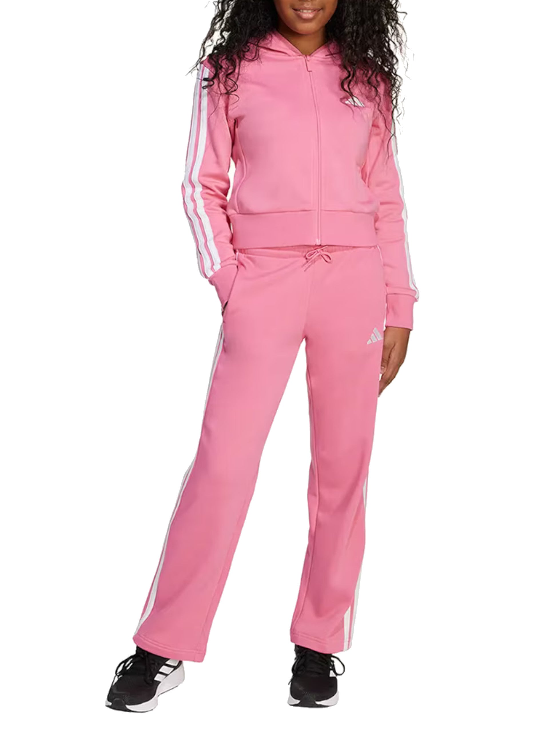 Tuta Adidas rosa da bambina full zip con cappuccio cotone felpato JN2436. La felpa di questa tuta Adidas ha le maniche lunghe, la chiusura full zip, il cappuccio fisso, il logo Adidas ricamato lato cuore, le 3Stripes ambo i lati, polsini e fondo elasticizzati. I pantaloni di questa tuta Adidas hanno la banda elastica sul punto vita regolabile con laccetti, le iconiche 3Stripes ambo i lati, due tasche laterali aperte e il logo Adidas bianco ricamato.