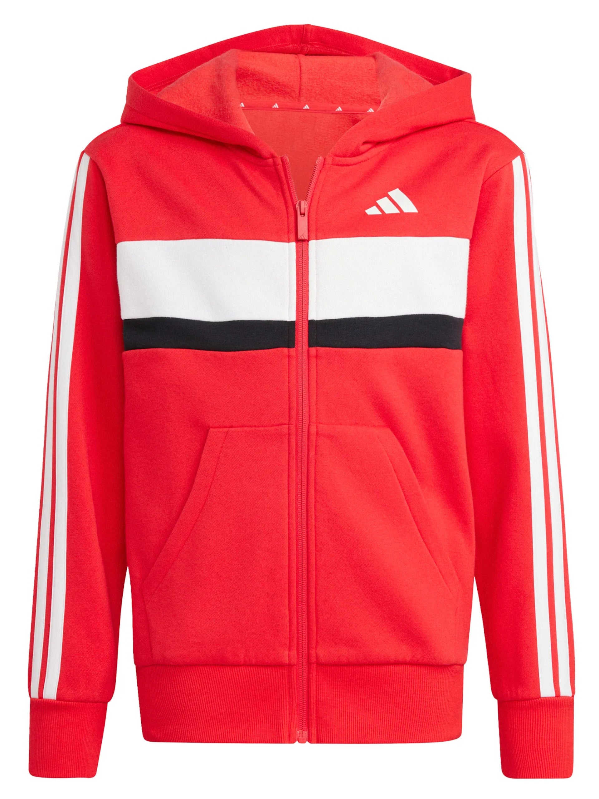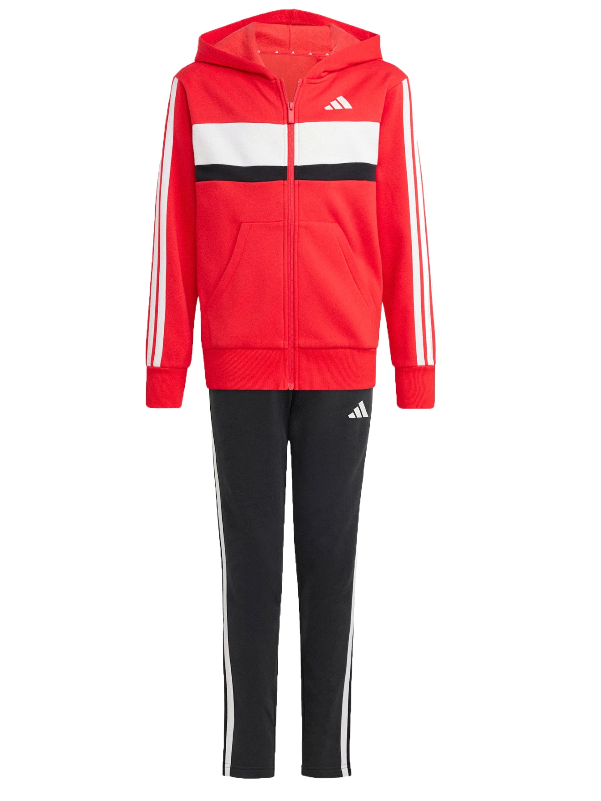 Tuta Adidas Rossa da bambino in cotone felpata con felpa logo stampato bianco . Questa tuta rossa e nera Adidas bambino JC7522 con cappuccio e tasche è composta da felpa Adidas bambino in cotone felpato con tasche,full zip e pantaloni con vita elastica e polsini sul fondo.