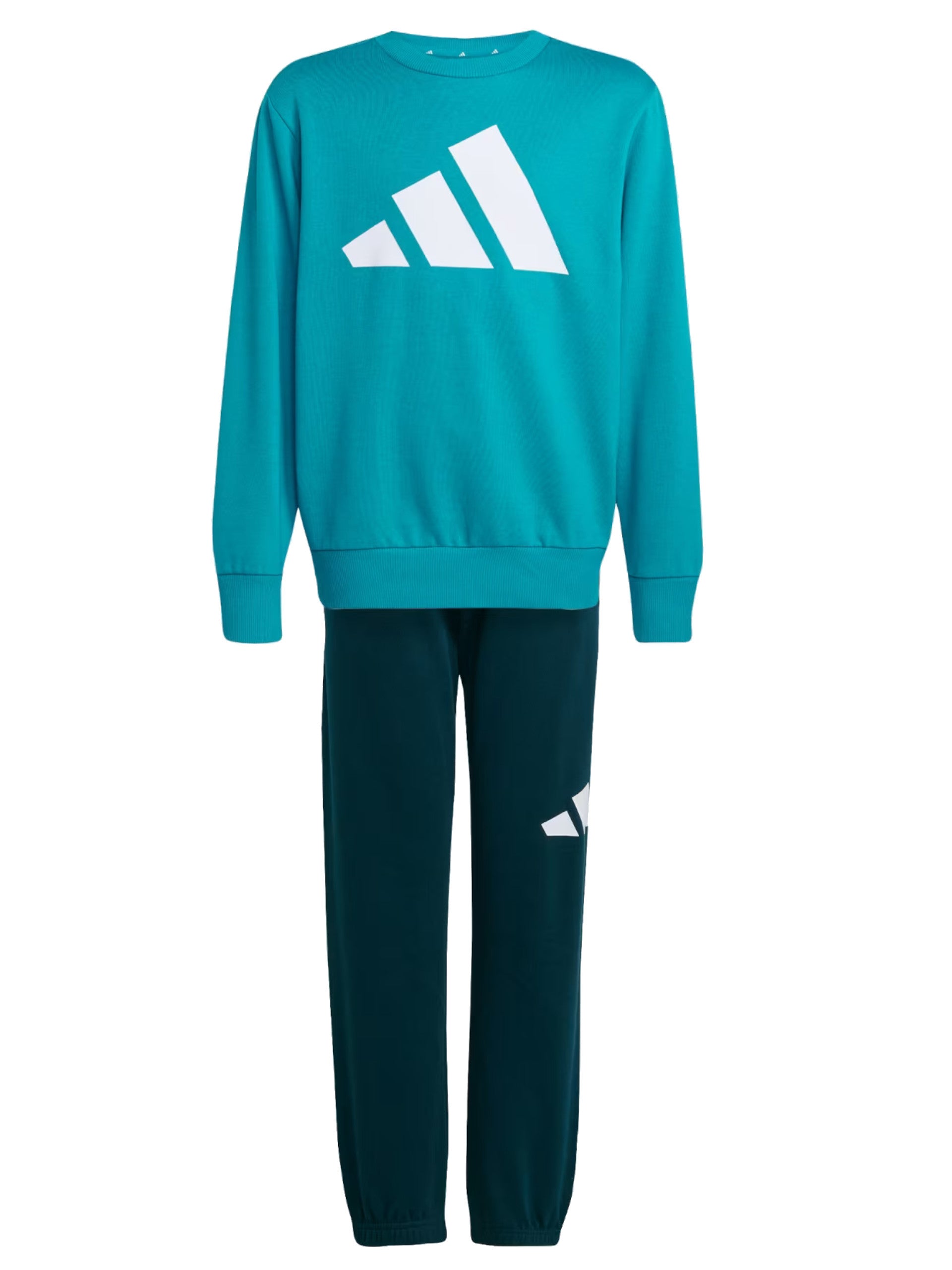 Tuta Adidas verde da bambino felpata maxi logo JV9938. La felpa di questa tuta Adidas ha le maniche lunghe, la maxi stampa Adidas bianca, polsini e fondo elasticizzati. I pantaloni di questa tuta Adidas hanno la banda elastica sul punto vita regolabile con laccetti, due tasche laterali aperte, polsini elasticizzati e il logo Adidas bianco stampato.