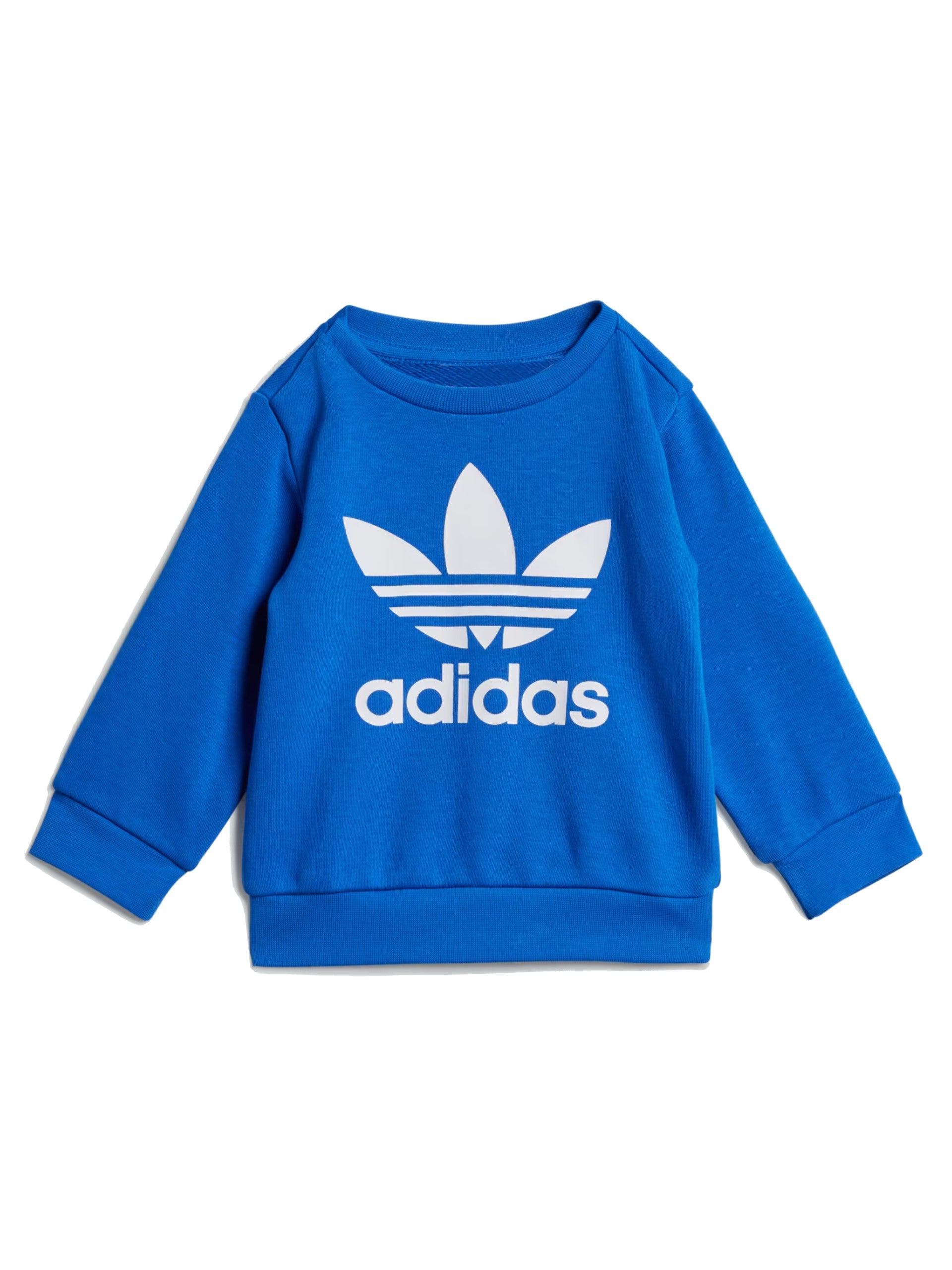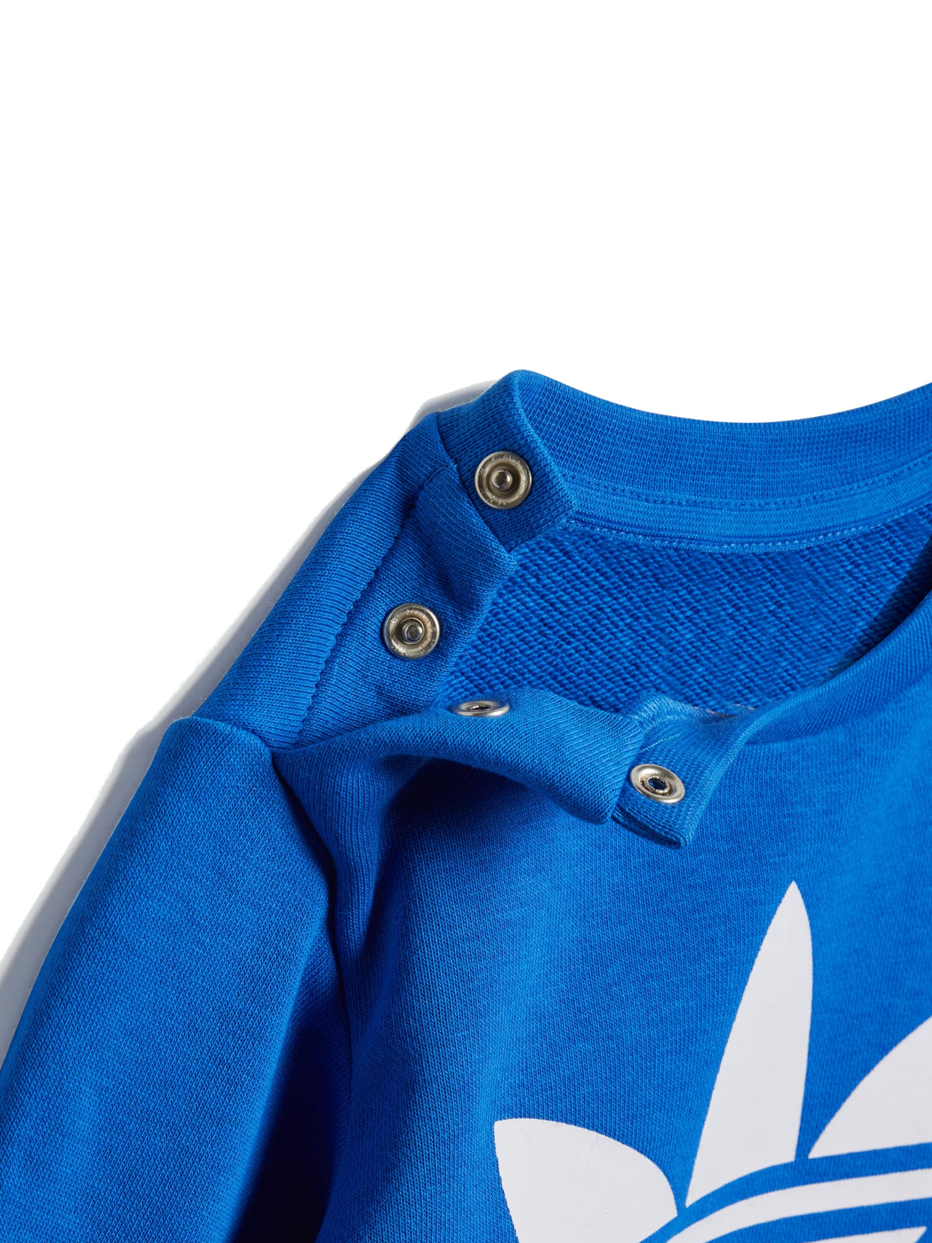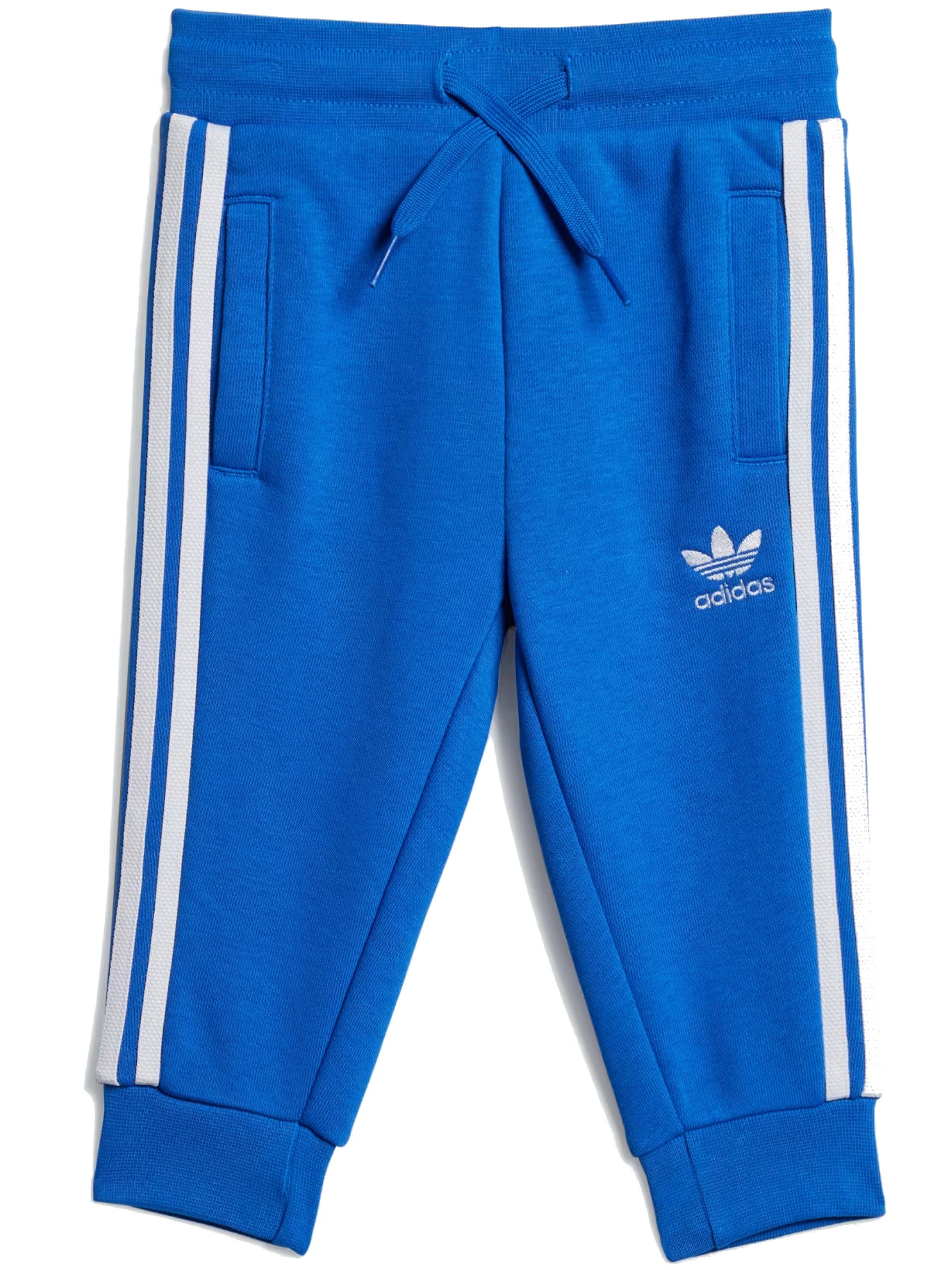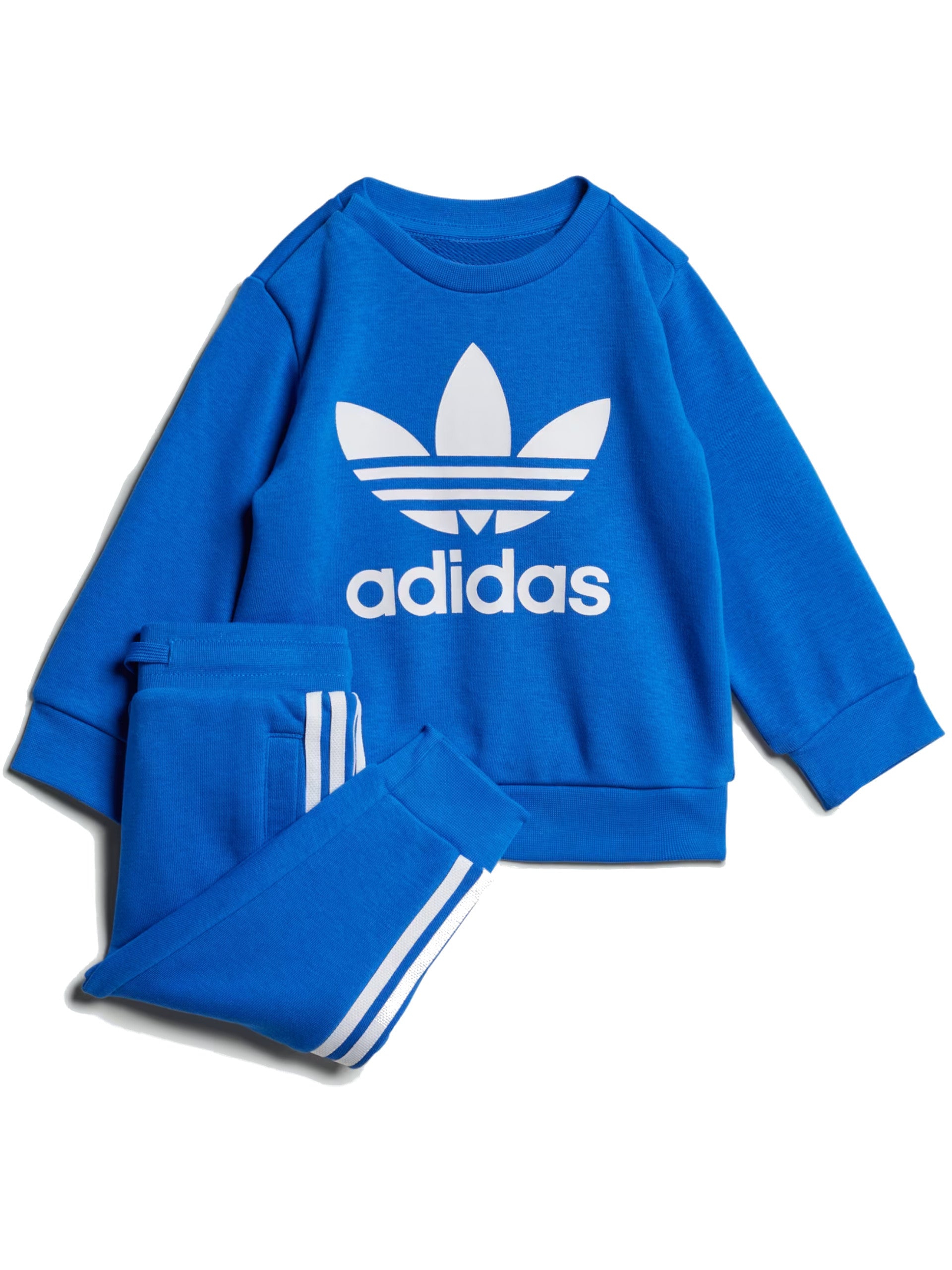 Tuta Adidas blu Kids Originals IX5151. La felpa di questa tuta Adidas ha le maniche lunghe, la maxi stampa Adidas Originals bianca, polsini e fondo elasticizzati. I pantaloni di questa tuta Adidas hanno la banda elastica sul punto vita regolabile con laccetti, le iconiche 3Stripes ambo i lati, due tasche laterali aperte, polsini elasticizzati e il logo Adidas Originals bianco ricamato.