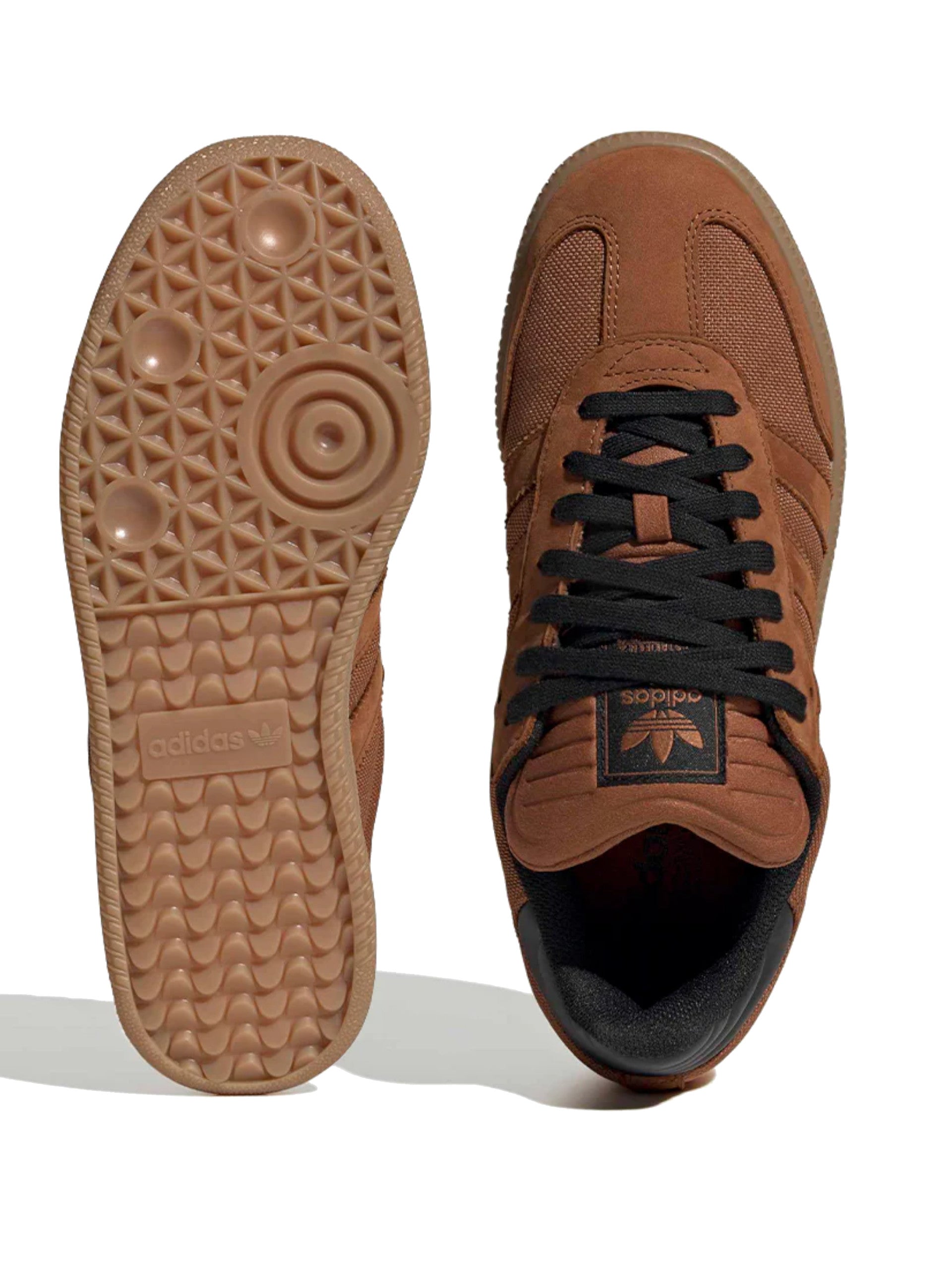 Scarpe Adidas Samba XLG marroni. Queste sneakers Adidas Samba hanno la tomaia realizzata in pelle, la suola in gomma e la soletta logata rimovibile. Sul davanti di queste Samba troviamo la chiusura con lacci, le iconiche 3Stripes ambo i lati e il lettering 'Samba' a contrasto colore.