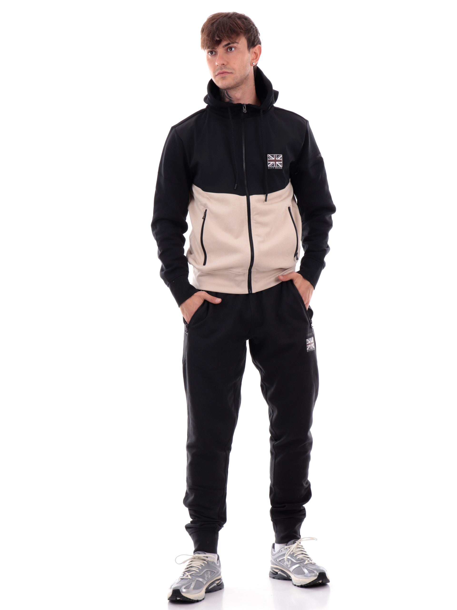 Felpa tecnica Admiral nera e beige da uomo full zip con cappuccio AD3091. Questa felpa Admiral nera ha il cappuccio regolabile con lacceti, la chiusura full zip centrale, due tasche laterali con zip,la bandiera del 'Regno Unito' sul cuore a contrasto colore, polsini e fondo elasticizzati.