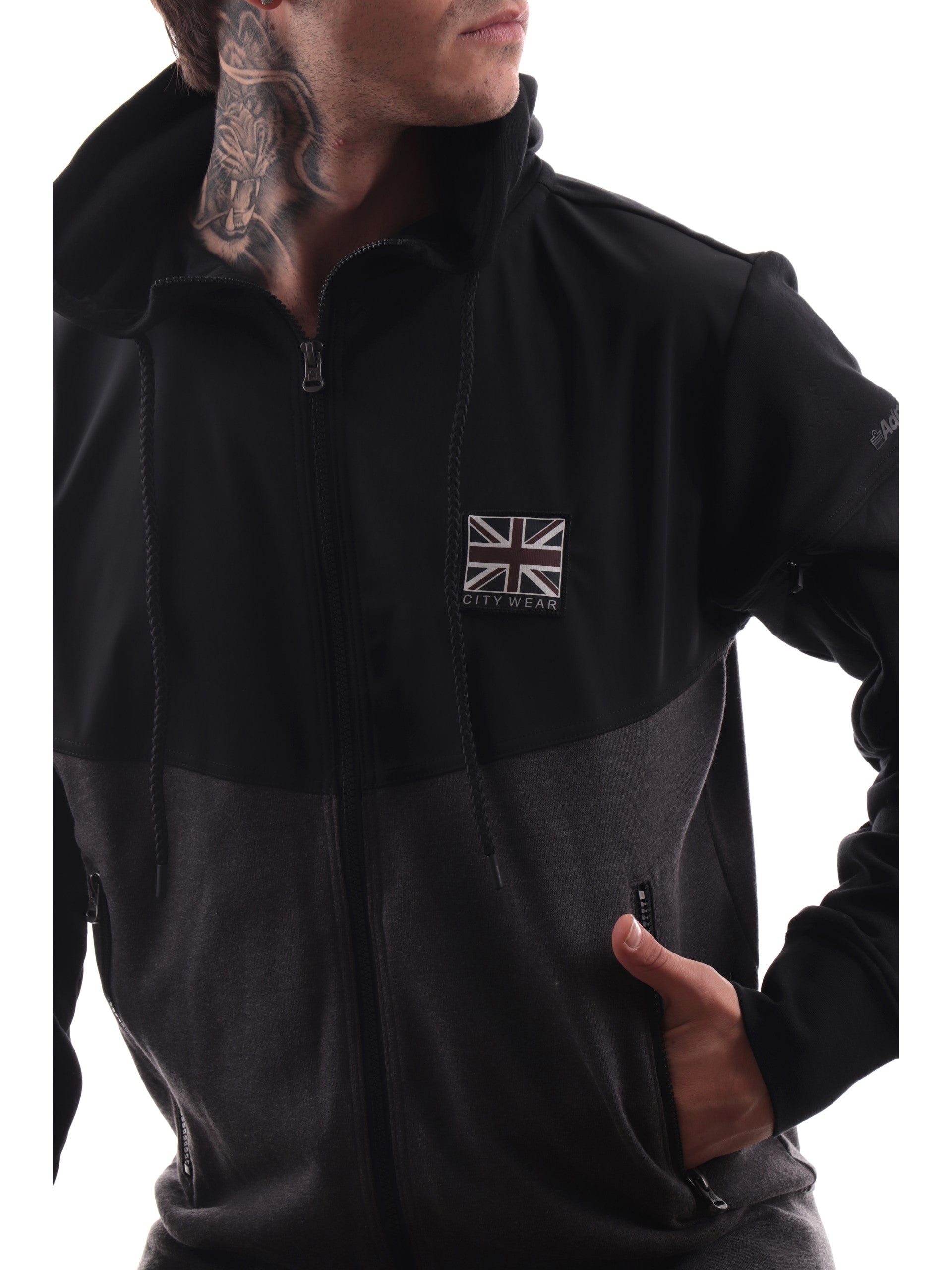Felpa tecnica Admiral nera e grigia da uomo full zip con cappuccio AD3091. Questa felpa Admiral nera ha il cappuccio regolabile con lacceti, la chiusura full zip centrale, due tasche laterali con zip, la bandiera del 'Regno Unito' sul cuore a contrasto colore, polsini e fondo elasticizzati.