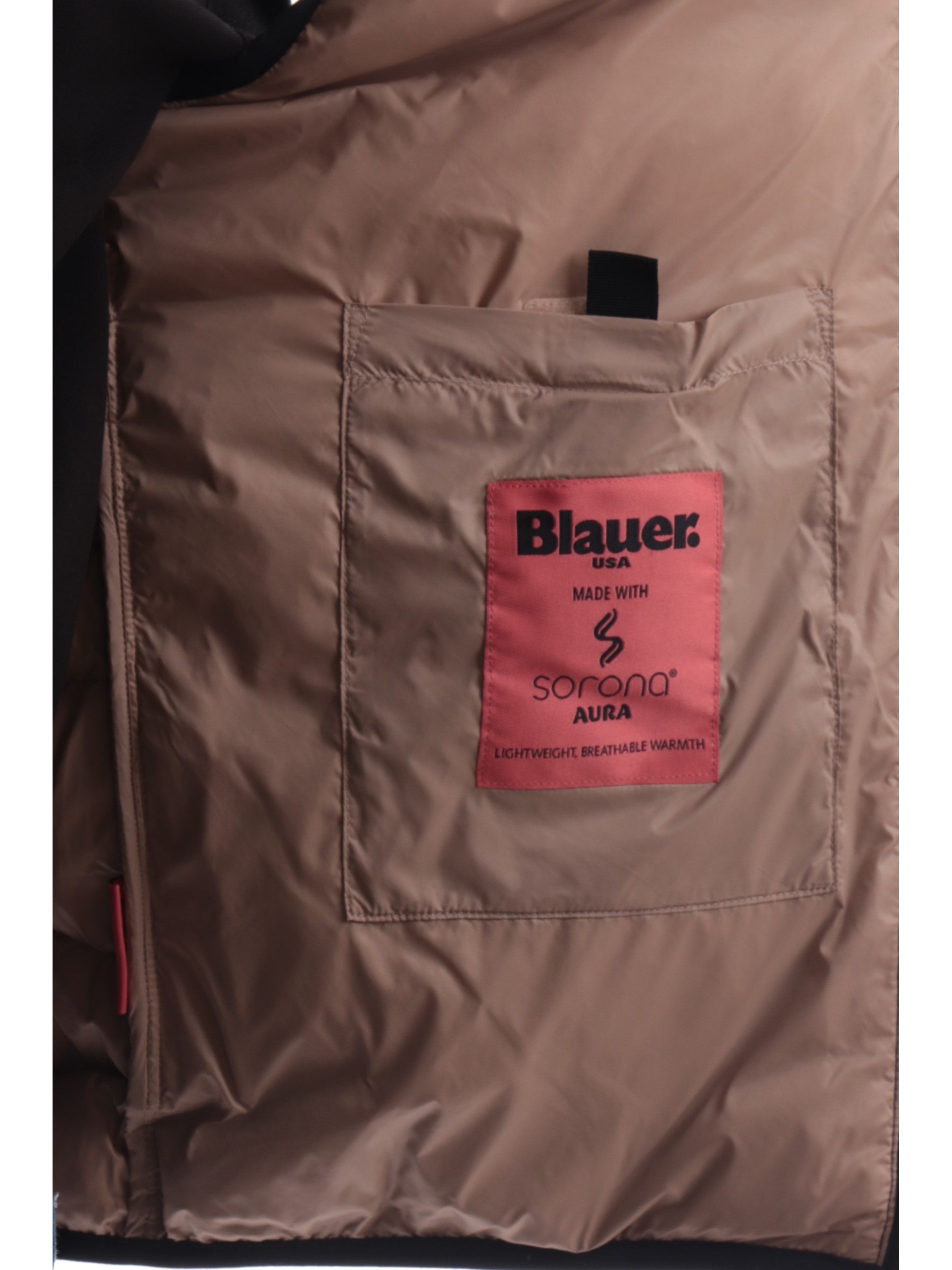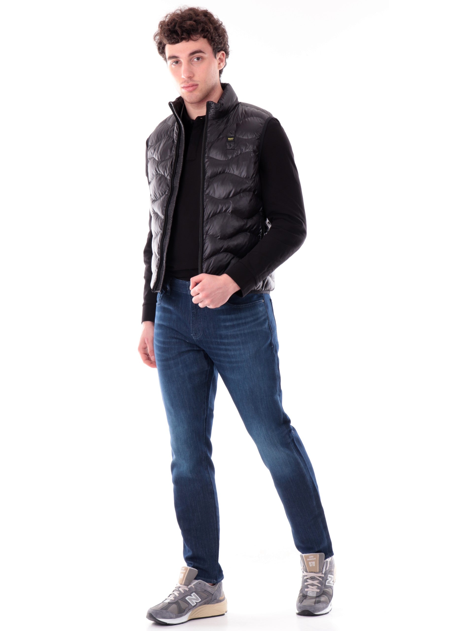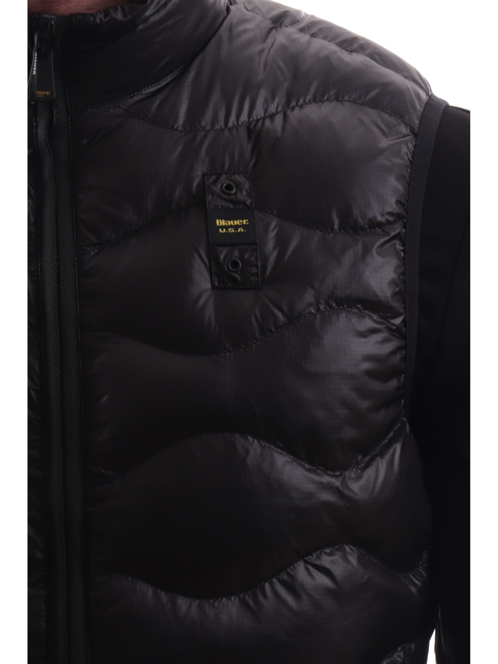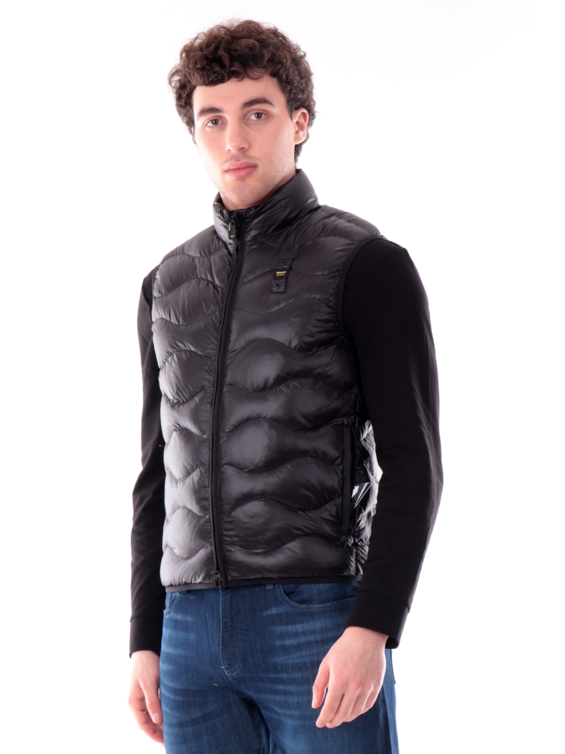 Gilet Blauer a onde nero da uomo Danny. Questo gilet Blauer nero, perfetto per la primavera, completa con stile ogni outfit, è caratterizzato da chiusura a zip con doppio cursore, tasche laterali conzip,fondo regolare, due tasche interne e logo Blauer applicato a lato cuore