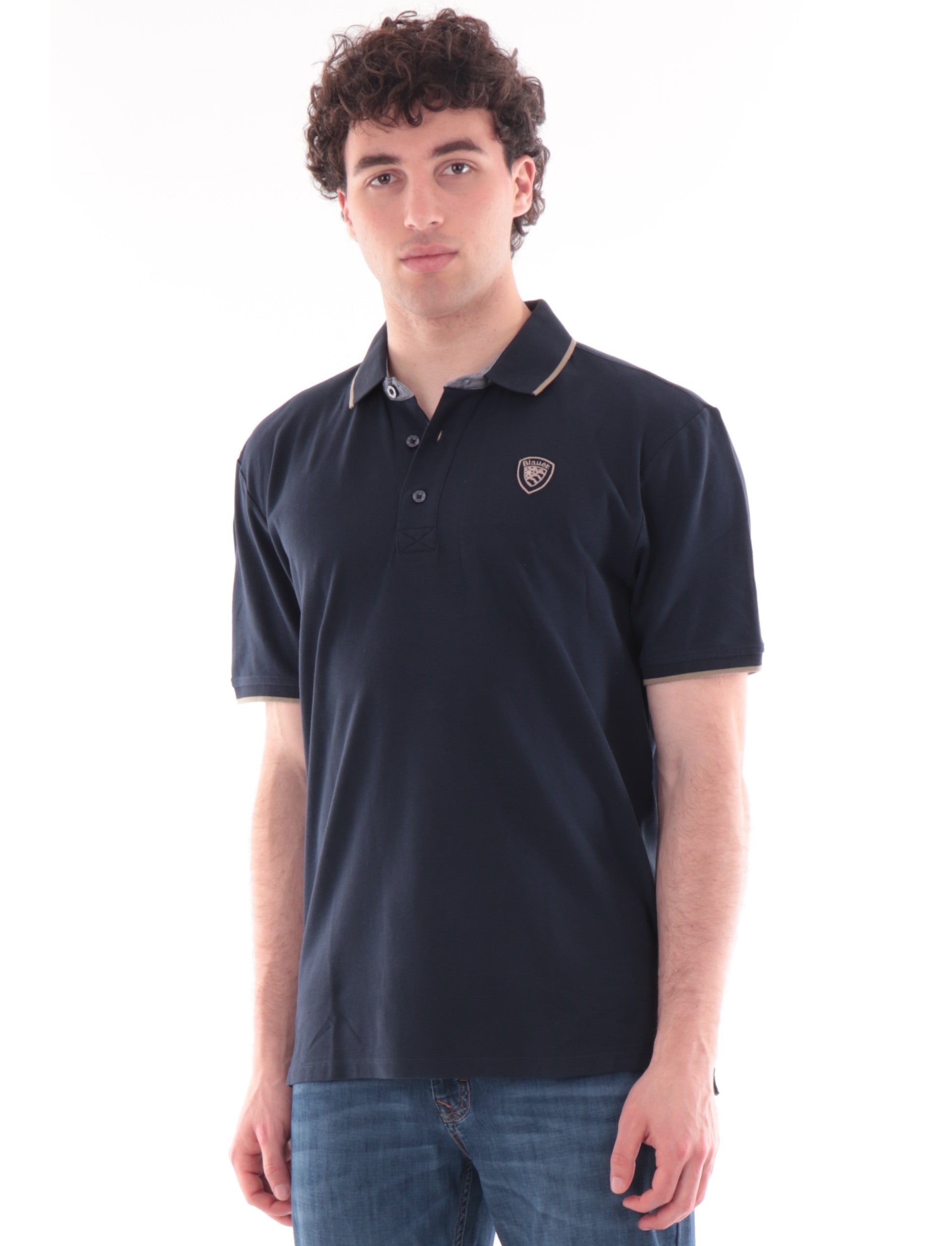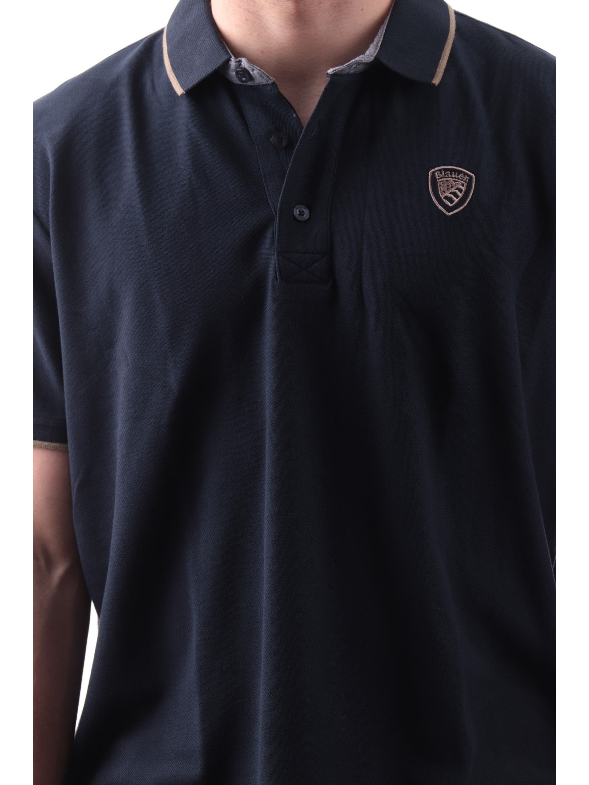 Polo Blauer blu da uomo Damon. Questa polo Blauer realizzata morbido cotone elasticizzato, è caratterizzata dal colletto classico con riga, chiusura con tre bottoni, maniche corte, fondo regolare e il logo applicato a lato cuore. La composizione in cotone rende questa polo morbida al tatto e comoda da indossare