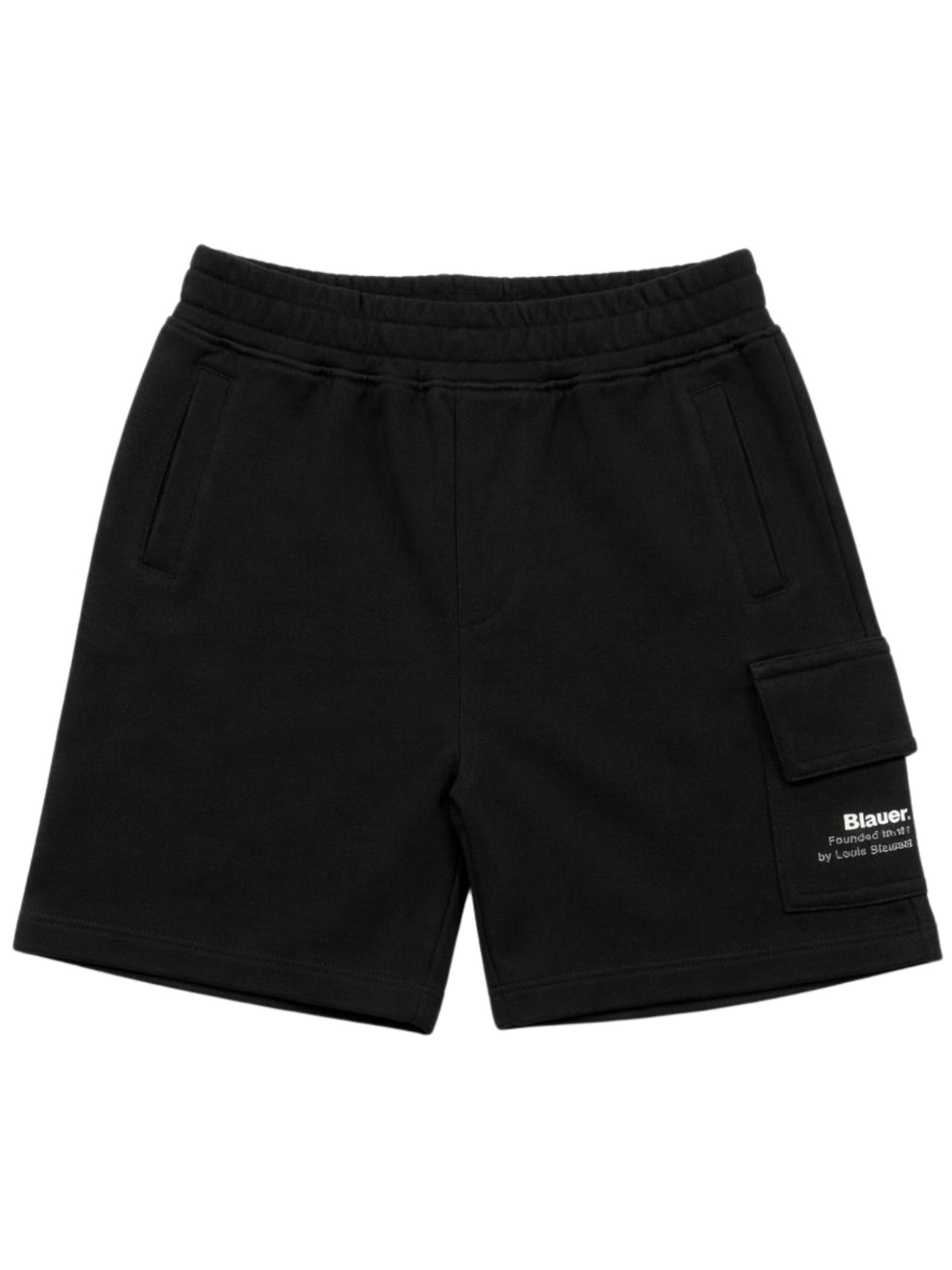 Shorts cargo tuta nera Blauer da bambino Knowlton, Questo pantaloncino tuta, realizzato 100% in puro cotone, perfetto per un look sia sportivo e sia casual ed è perfetto per l'estete, è caratterizzato dalla banda elastica sul punto vita regolabili con lacci, due tasche laterali aperte, due tasche con patta altezza gionocchio di cui una ricamata la scritta del brand