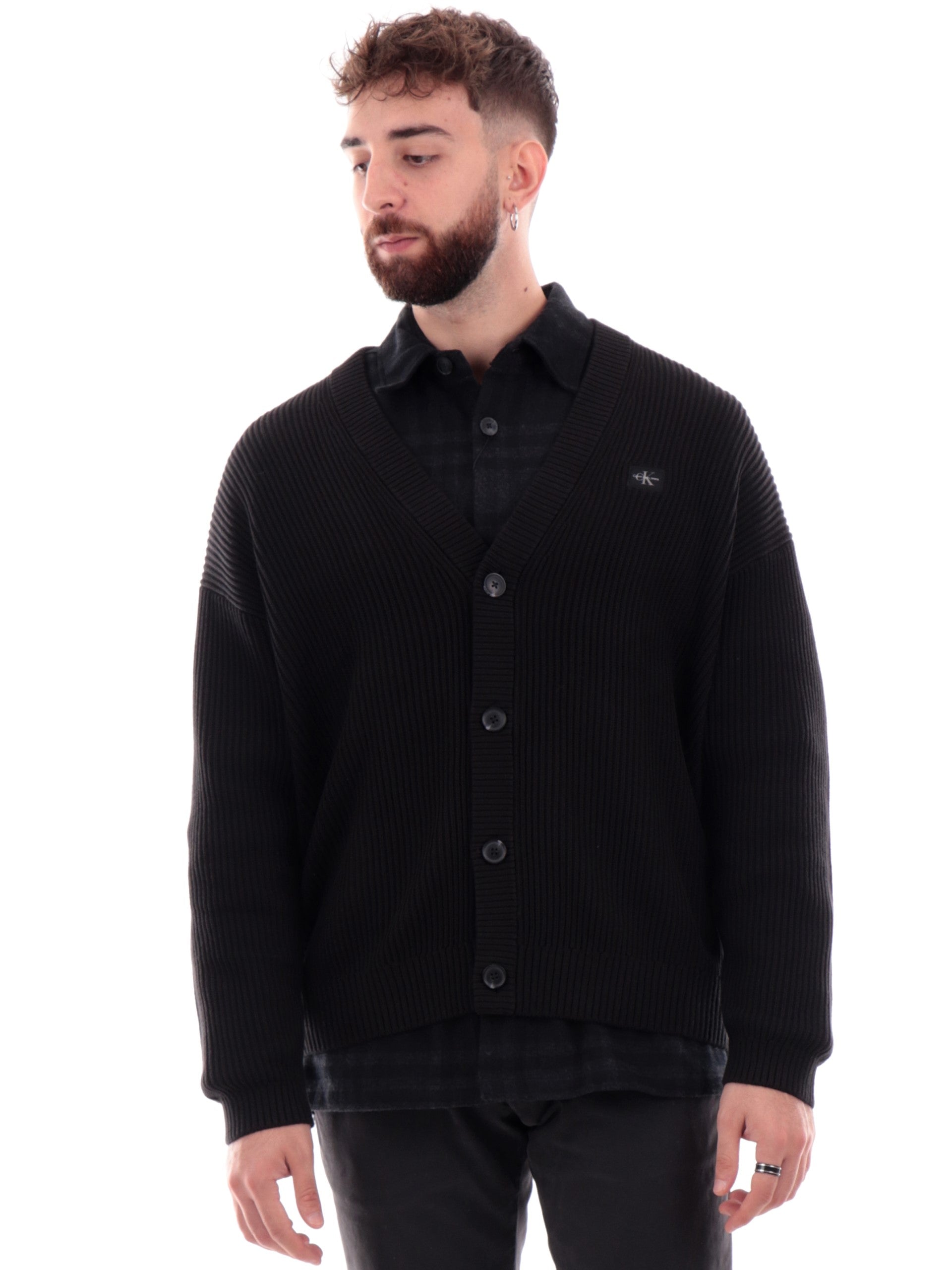 Maglione cardigan Calvin Klein nero da uomo scollo a V J30J326201, realizzato in 100% puro cotone. Questo cardigan Calvin Klein nero ha lo scollo a V, la chiusura con bottoni centrale, il patch del brand cucito sul cuore, polsini e fondo elasticizzati.