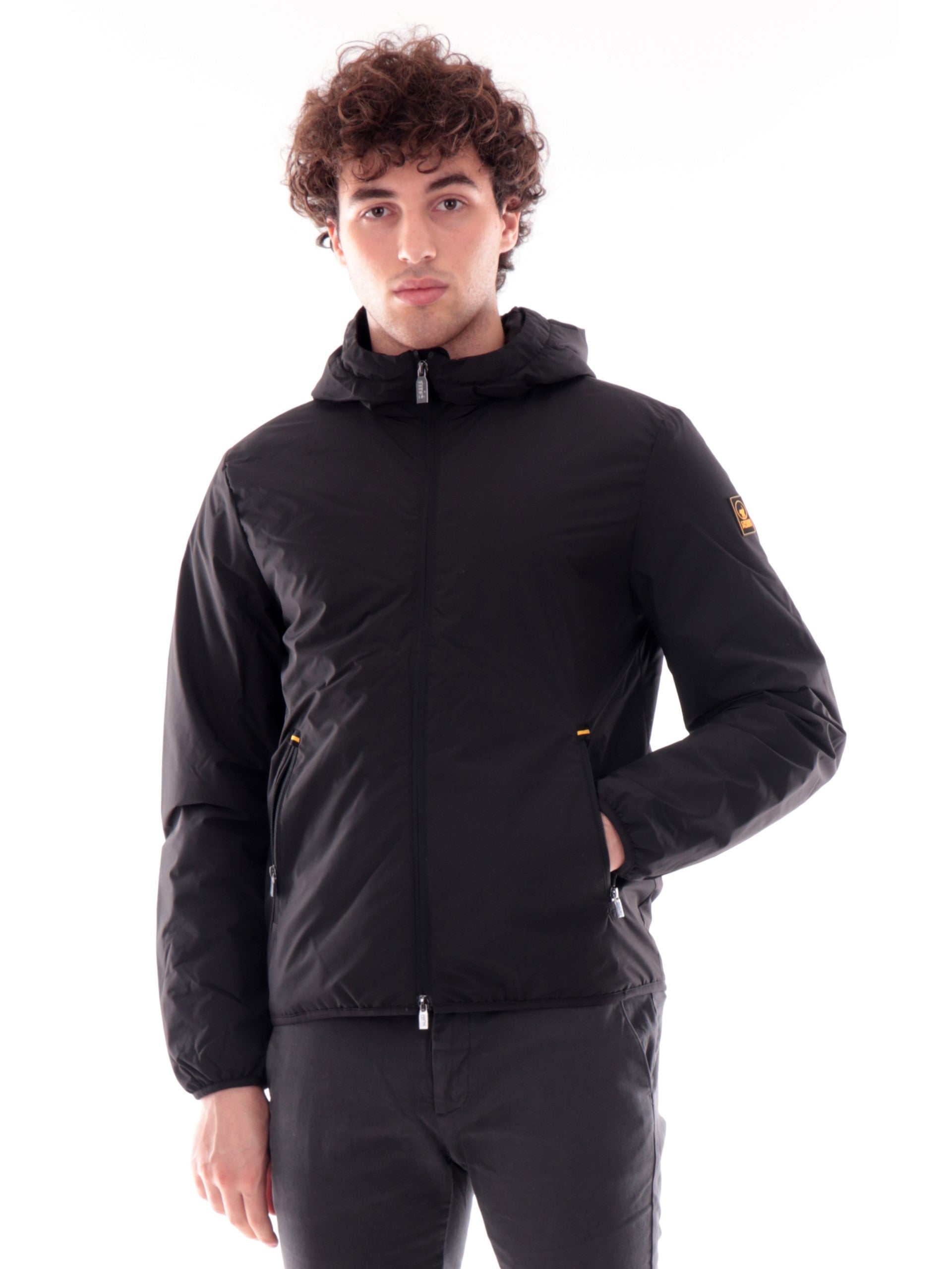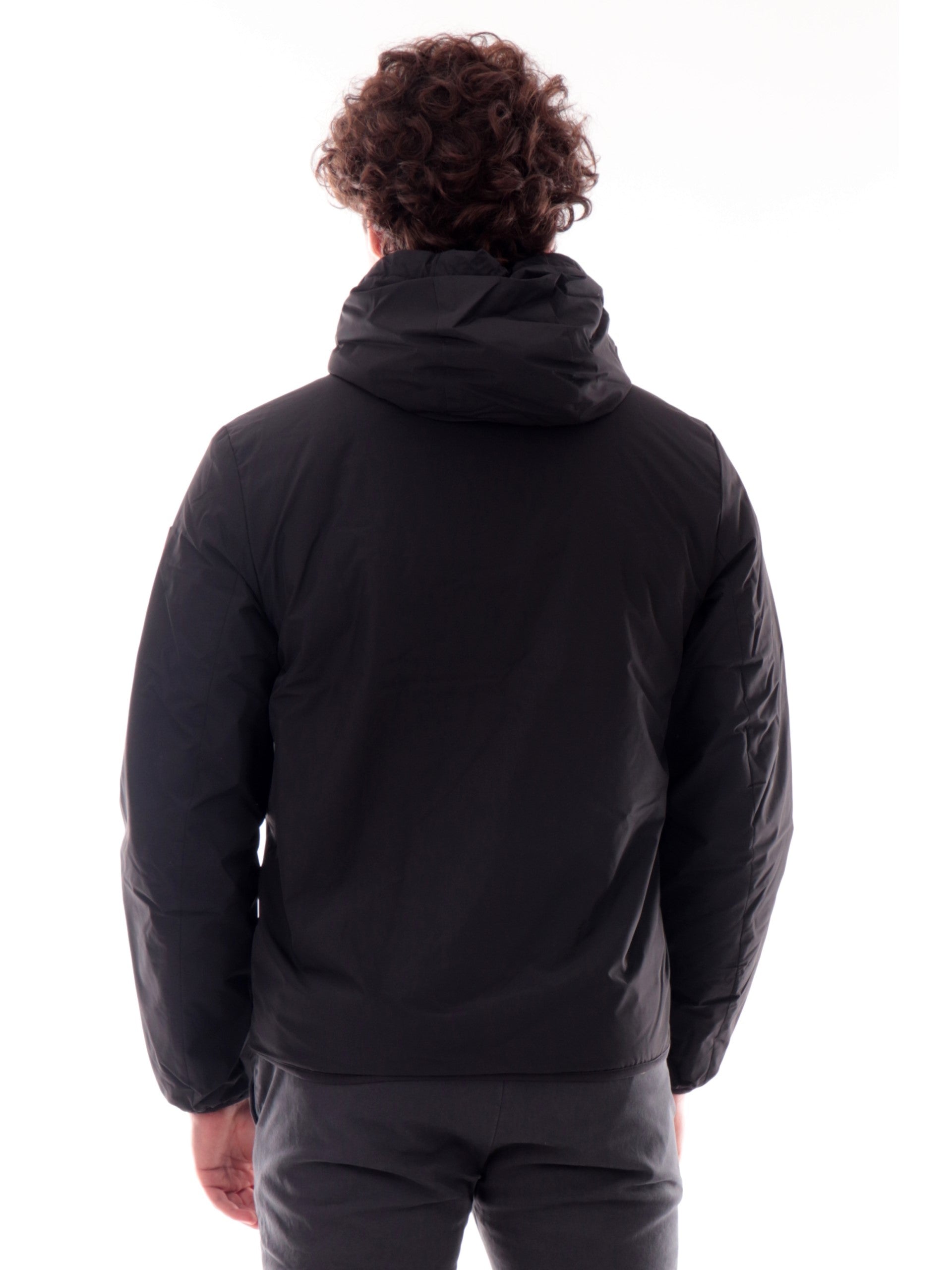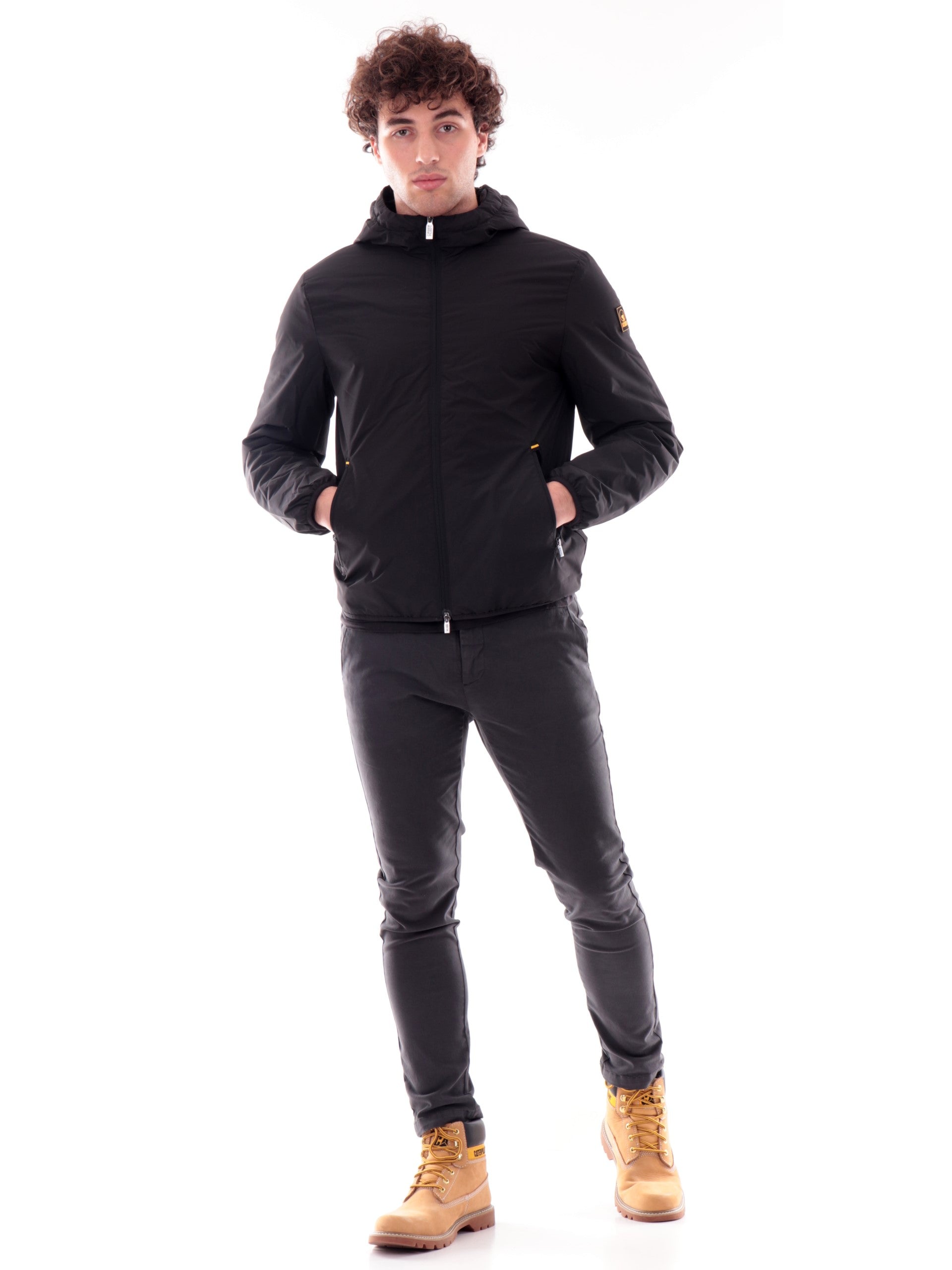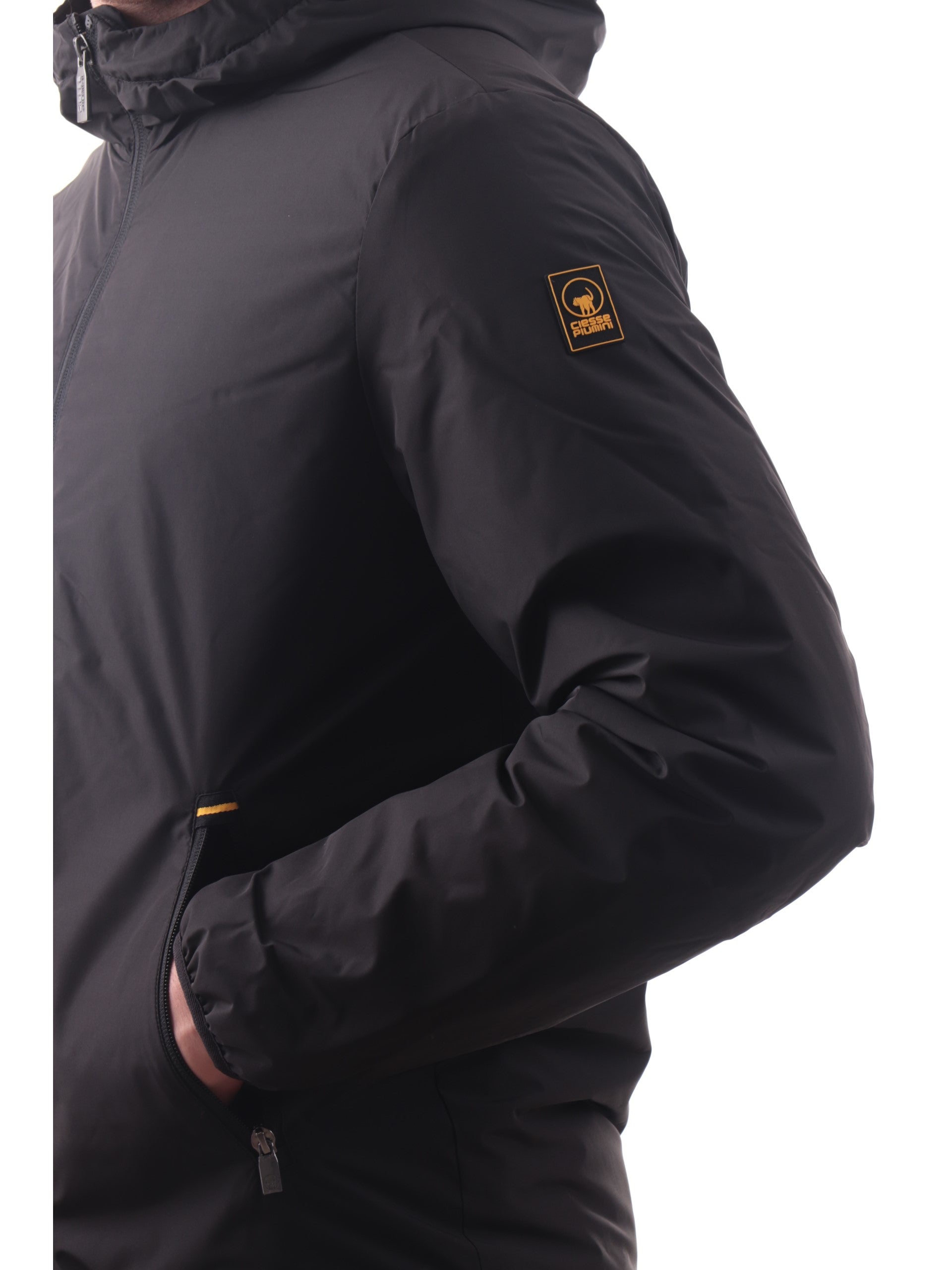 Piumino Ciesse nero da uomo PETER. Questo giubbino Ciesse nero da uomo è realizzato da un tessuto liscio e impermeabile perfetto per le giornate piovose, ed è caratterizzato da cappuccio fisso, chiusura full zip con doppio cursore, due tasche laterali con zip, una tasca interna con zip, polsini e fondo elasticizzati e il logo del brand applicato sulla manica sinistra