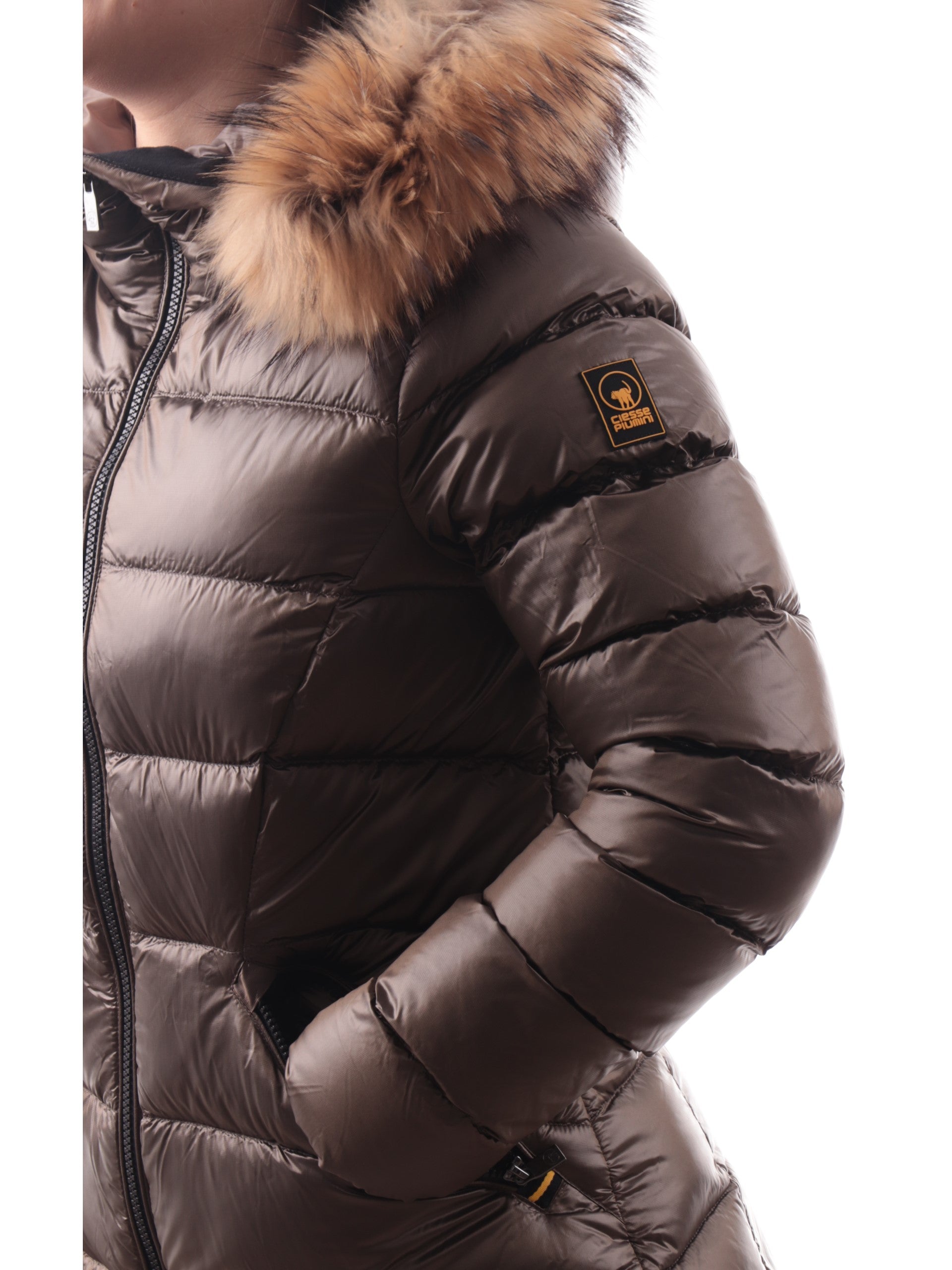 Piumino Ciesse Piumini da donna marrone modello Rangi real fur con imbottitura in piuma naturale. Questo Piumino Ciesse donna con cappuccio in pelliccia ha la chiusura centrale full zip in metallo con doppio cursore logato, tasche laterali con cerniera, polsini con elastico . Il logo patch gommato è applicato sull braccio sinistro. Giacca donna Ciesse Piumini con texture morbida e leggermente lucida trapuntata . Il piumino donna Ciesse Rangi si adatta a una varietà di look confermando lo stile intramontabile Ciesse.