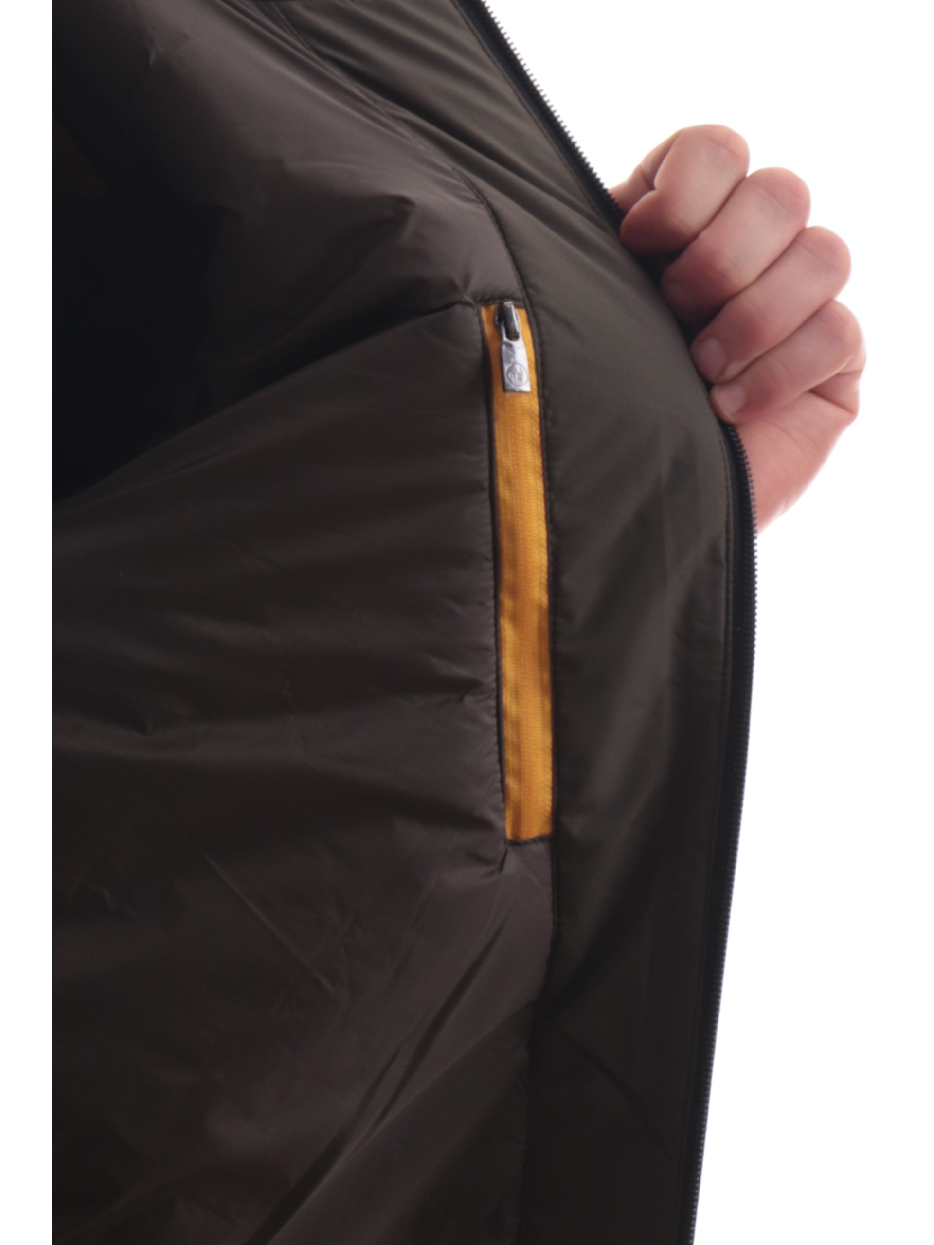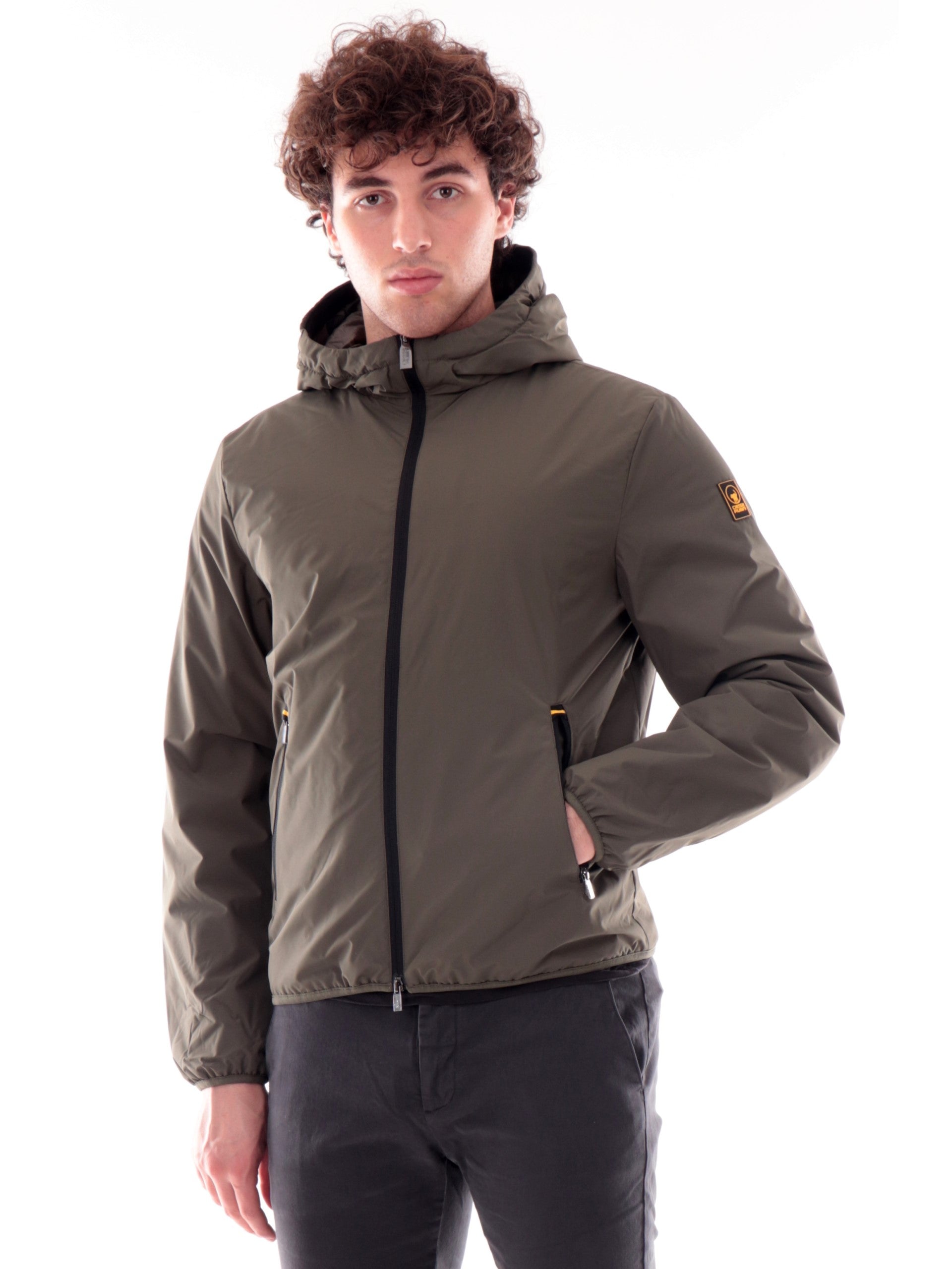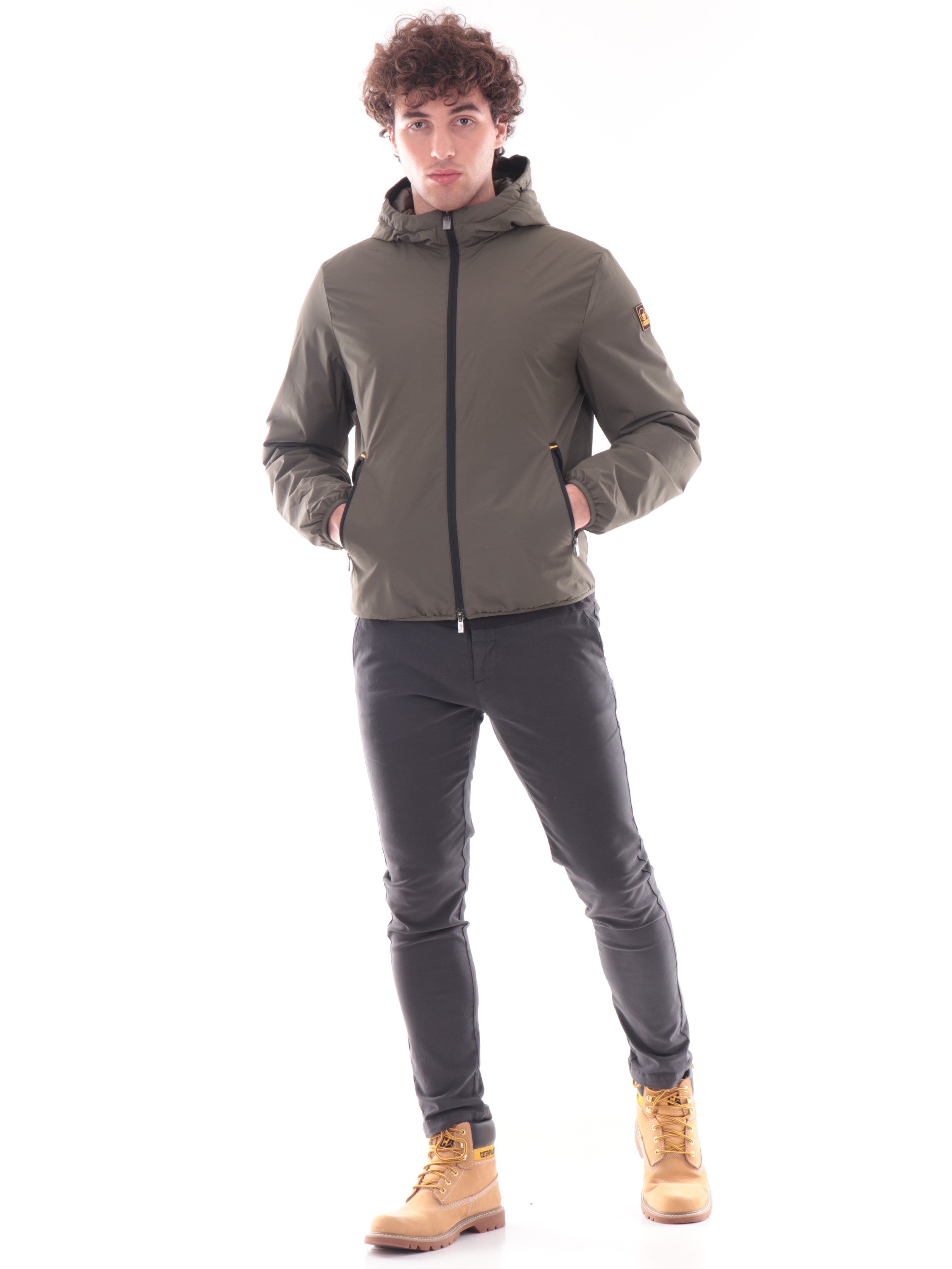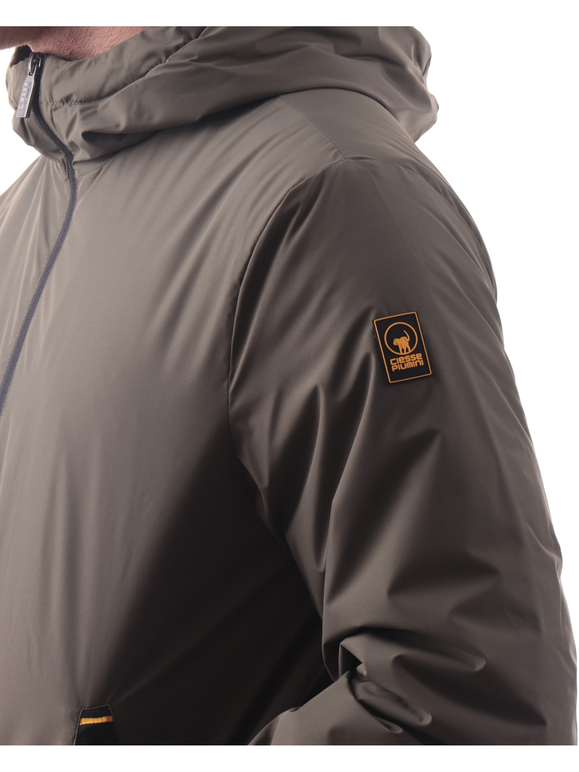 Piumino Ciesse verde da uomo PETER. Questo giubbino Ciesse verde da uomo è realizzato da un tessuto liscio e impermeabile perfetto per le giornate piovose, ed è caratterizzato da cappuccio fisso, chiusura full zip con doppio cursore, due tasche laterali con zip, una tasca interna con zip, polsini e fondo elasticizzati e il logo delbrand applicato sulla manica sinistra