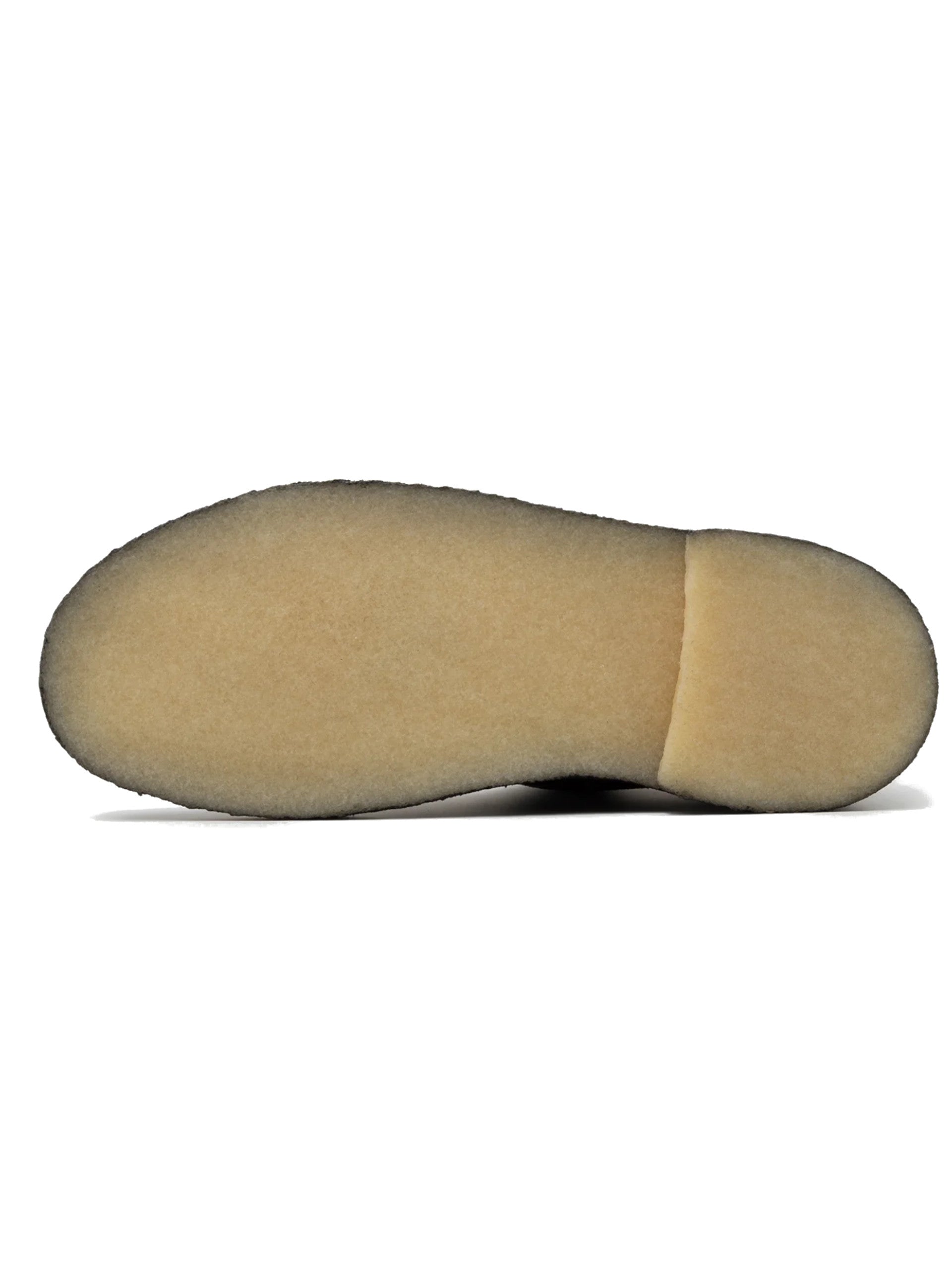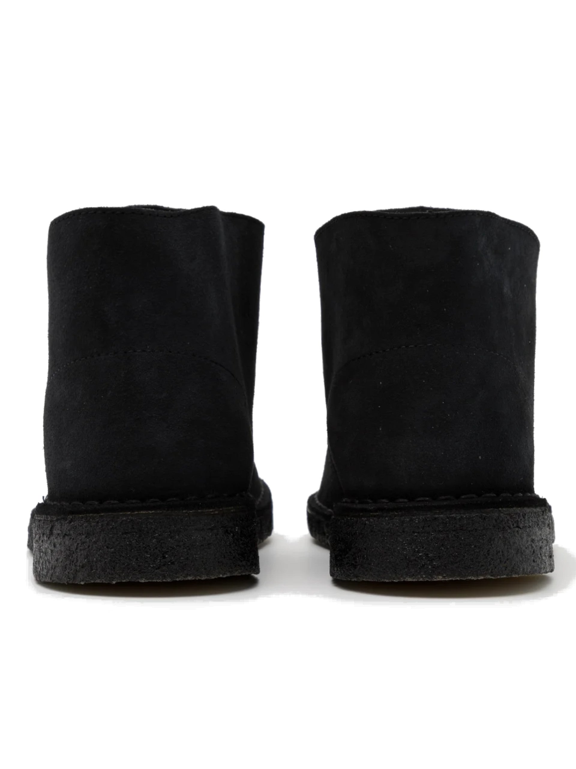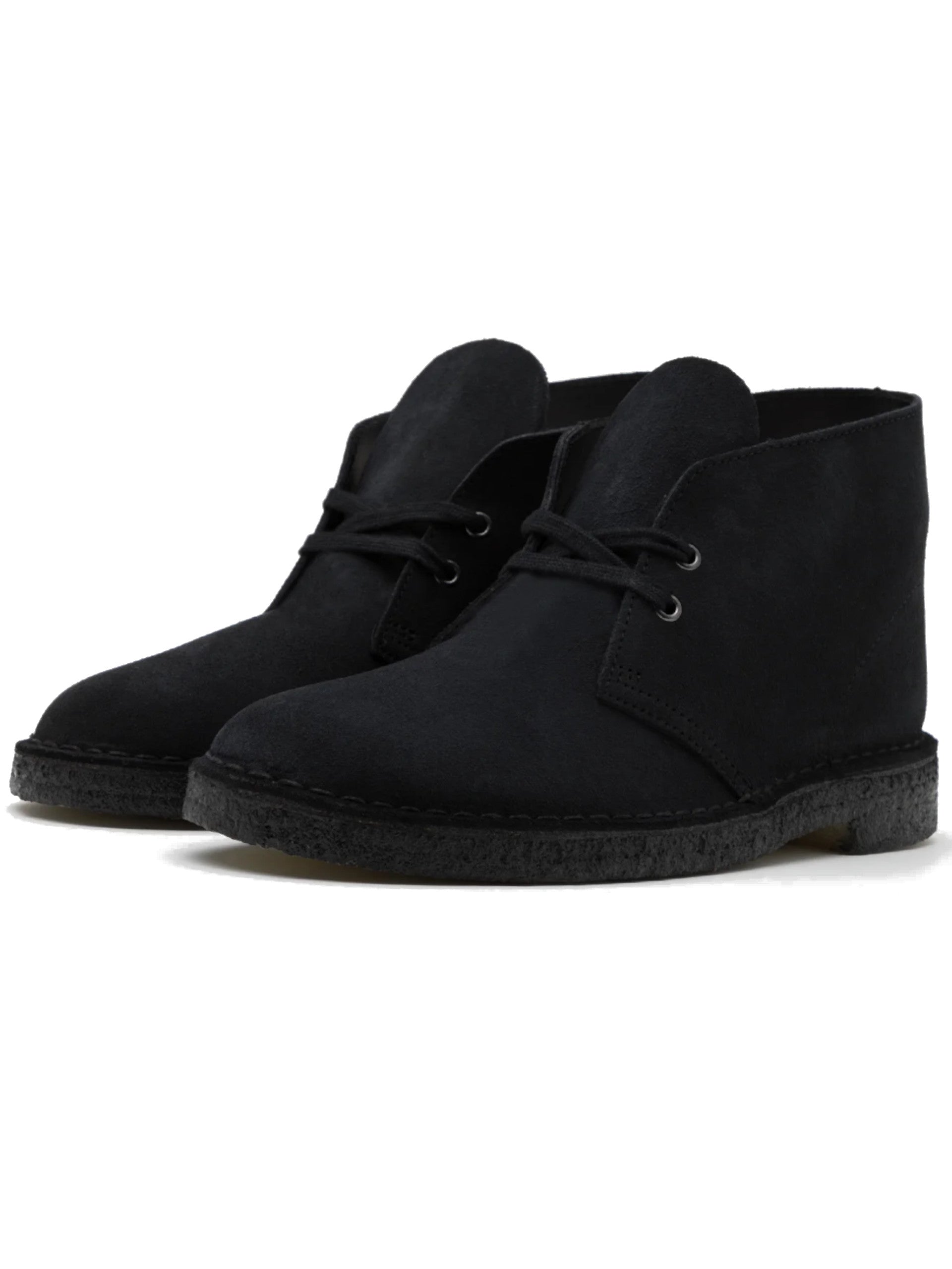 Scarpe Clarks Desert Boot nere da uomo in pelle suede 26155480. Sul davanti di questi stivali Clarks troviamo una comoda chiusura a lacci, la suola in crêpe proveniente da fonti sostenibili completa la silhouette unica di questa calzatura, inconfondibile ed eternamente iconica.