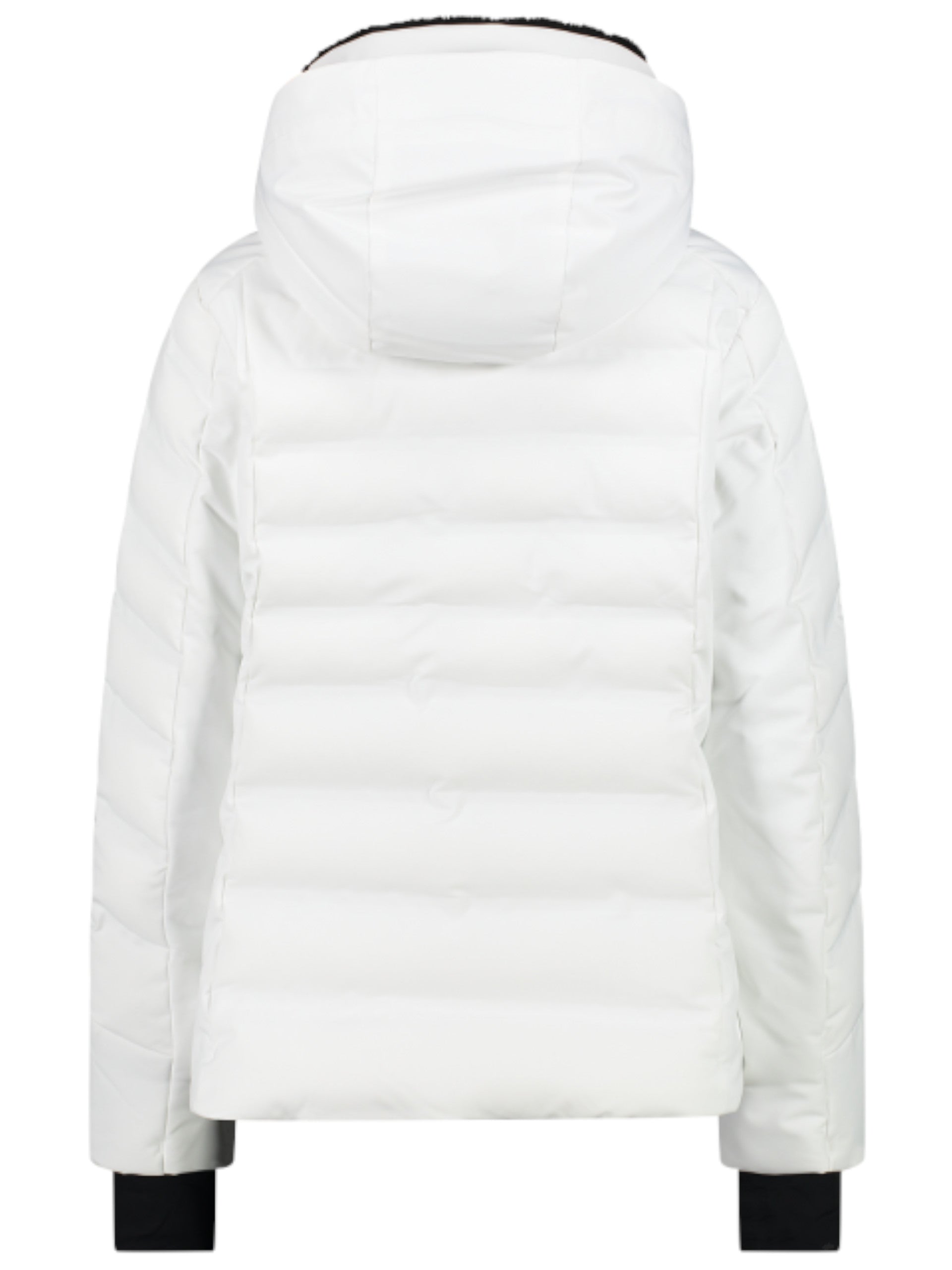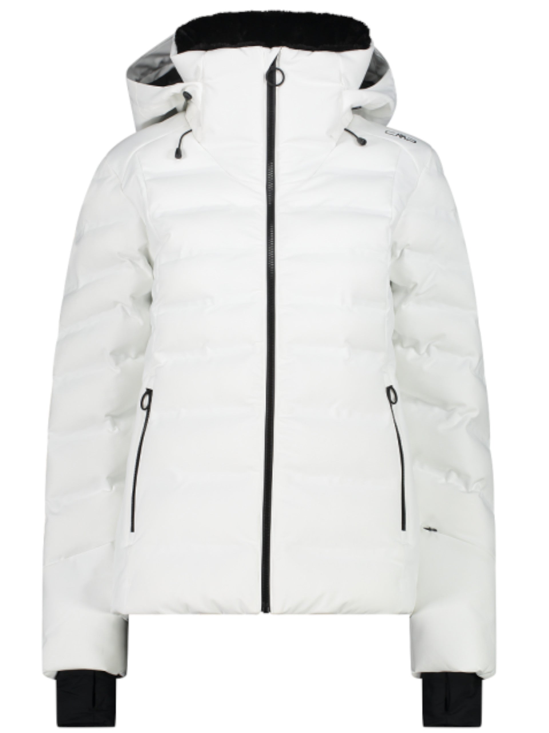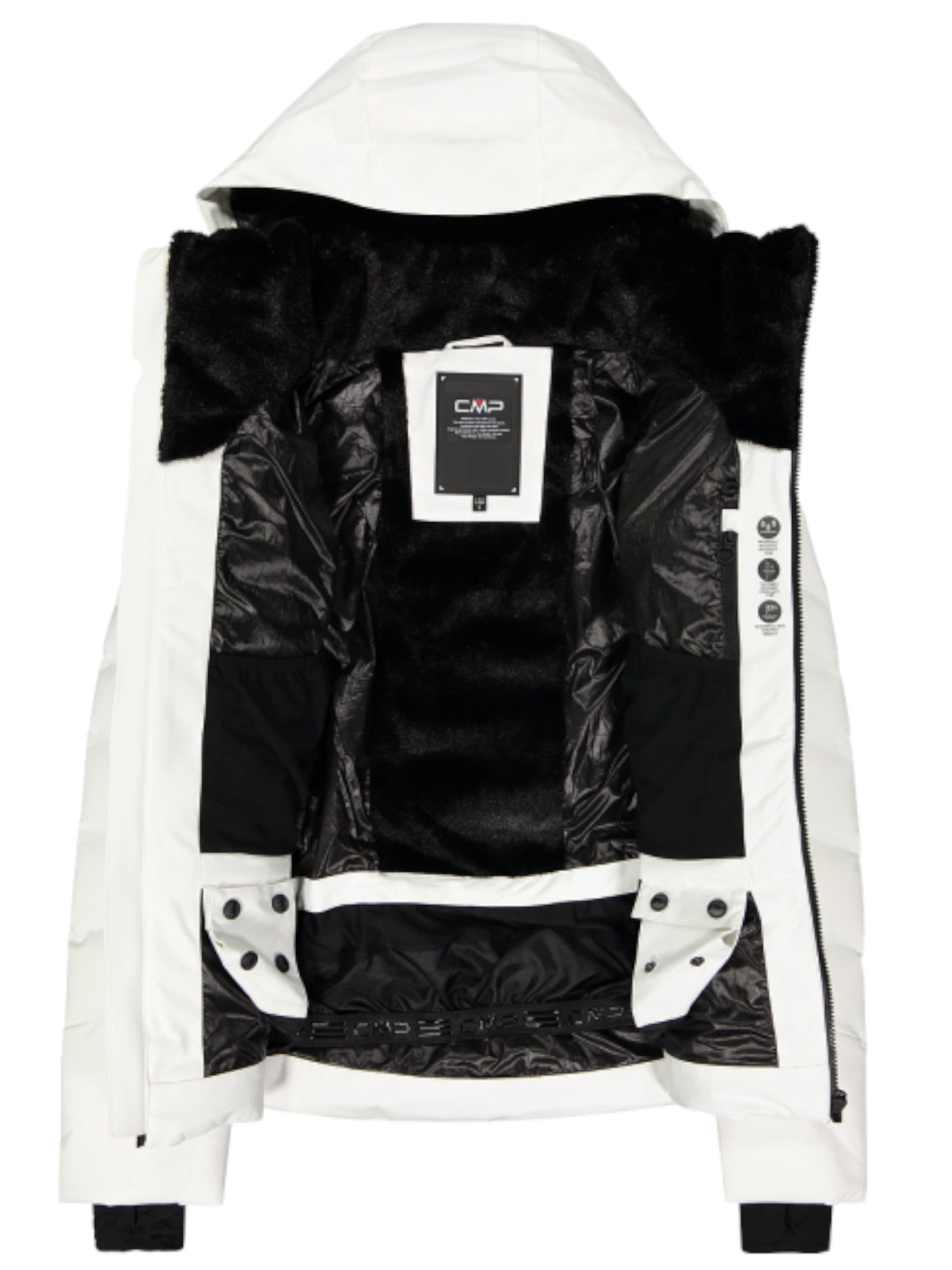 Giacca da sci bianca CMP da donna Fix Hood. Questa giacca da neve bianca è caratterizzata da numerose caratteristiche tecniche come la ghetta antineve la rendono perfetta per lo sci. La costruzione èseamless, con inserti termosaldati diagonali e un fondo svasato più lungo. Il comfort è assicurato dall'interno schiena e collo in Highloft. Il laminato Clima Protect posto fra i tessuti, unito alle cuciture totalmente nastrate, protegge da vento e pioggia assicurando allo stesso tempo elevata traspirabilità. All'esterno il trattamento idrorepellente impedisce all'acqua di penetrare all'interno. Coulisse sul fondo e cappuccio fisso regolabile, la zip frontale impermeabile con patta antivento interna e garage antisfregamento, i polsini in lycra e le due tasche laterali completano la giacca.