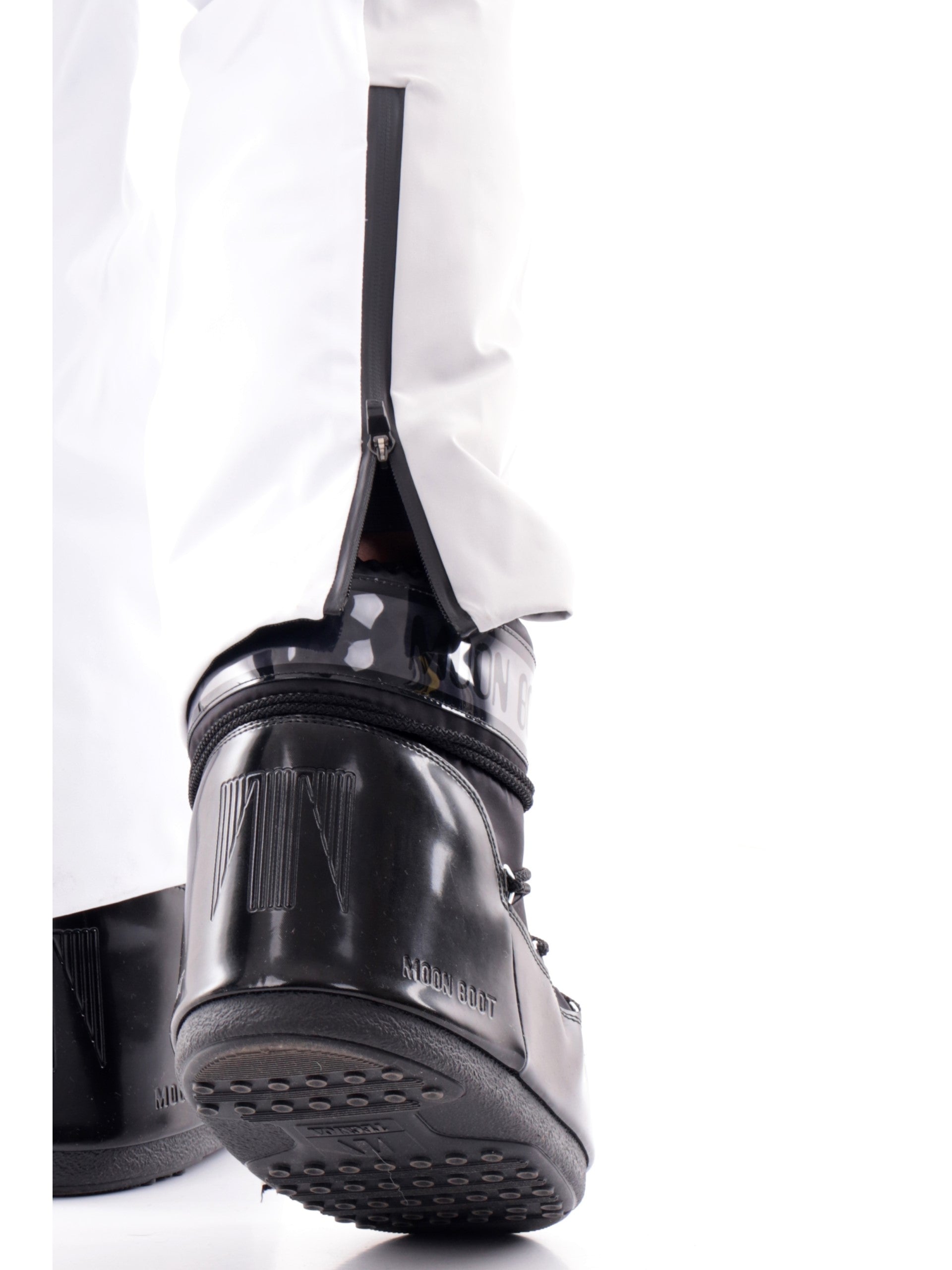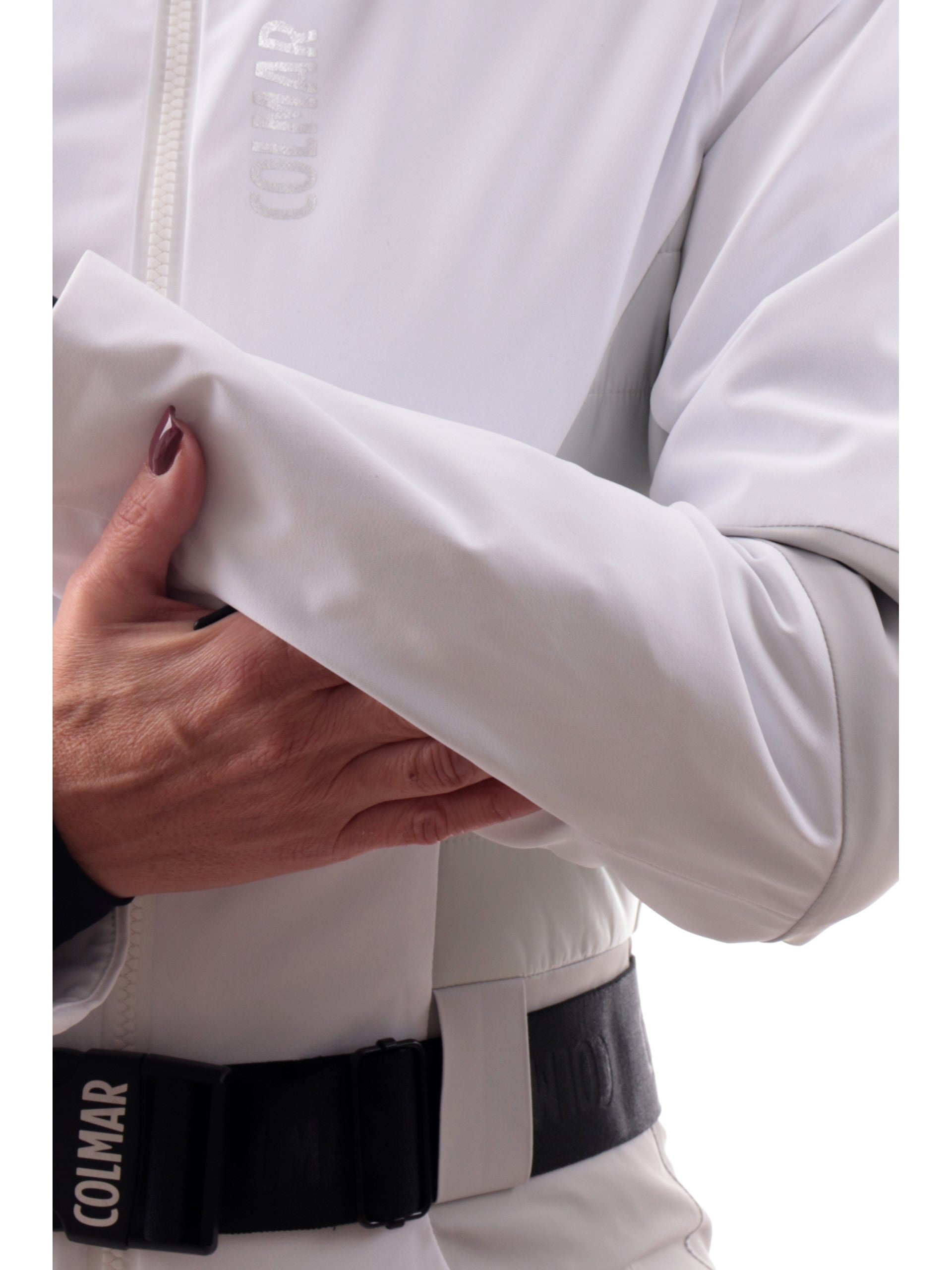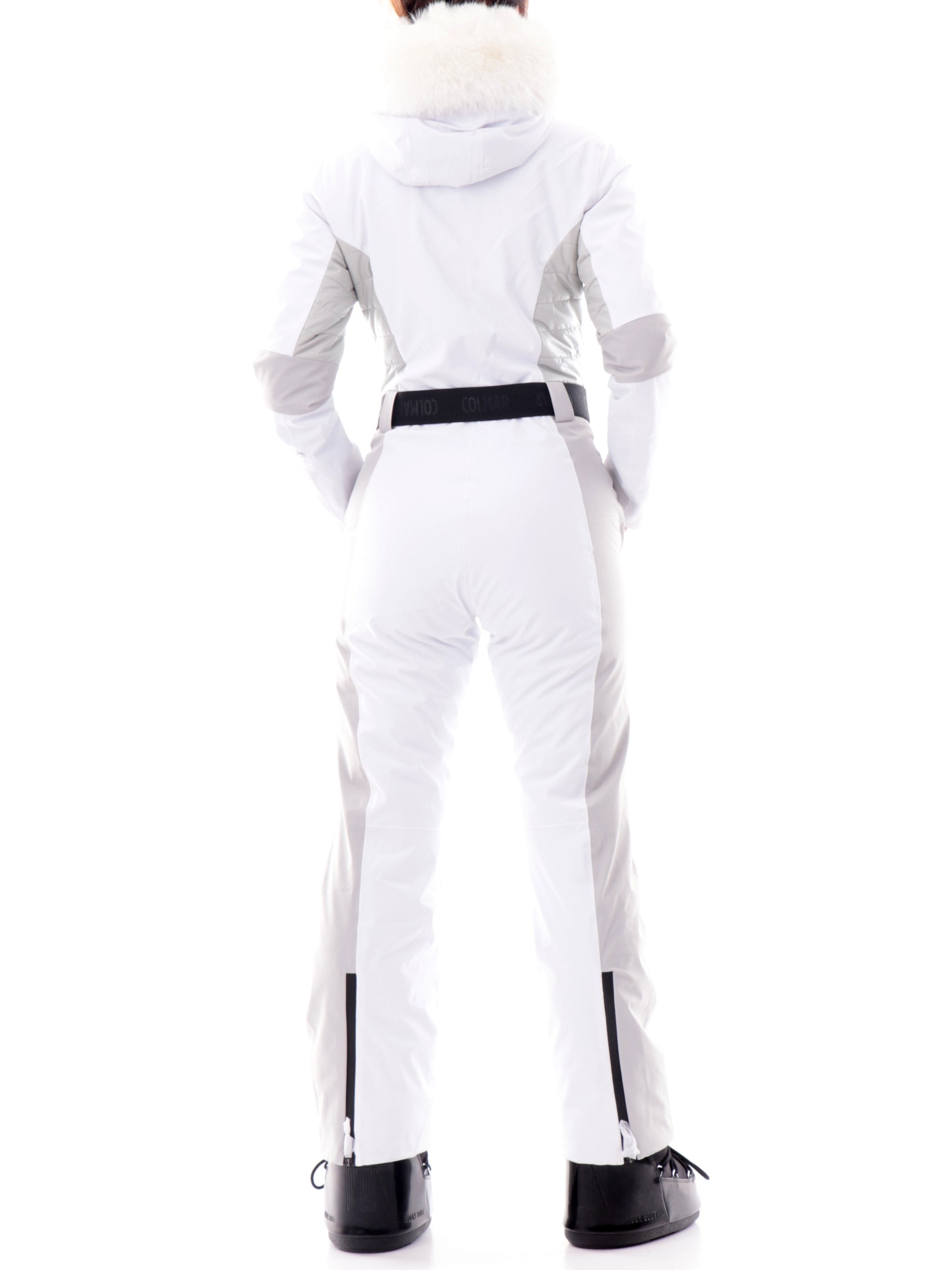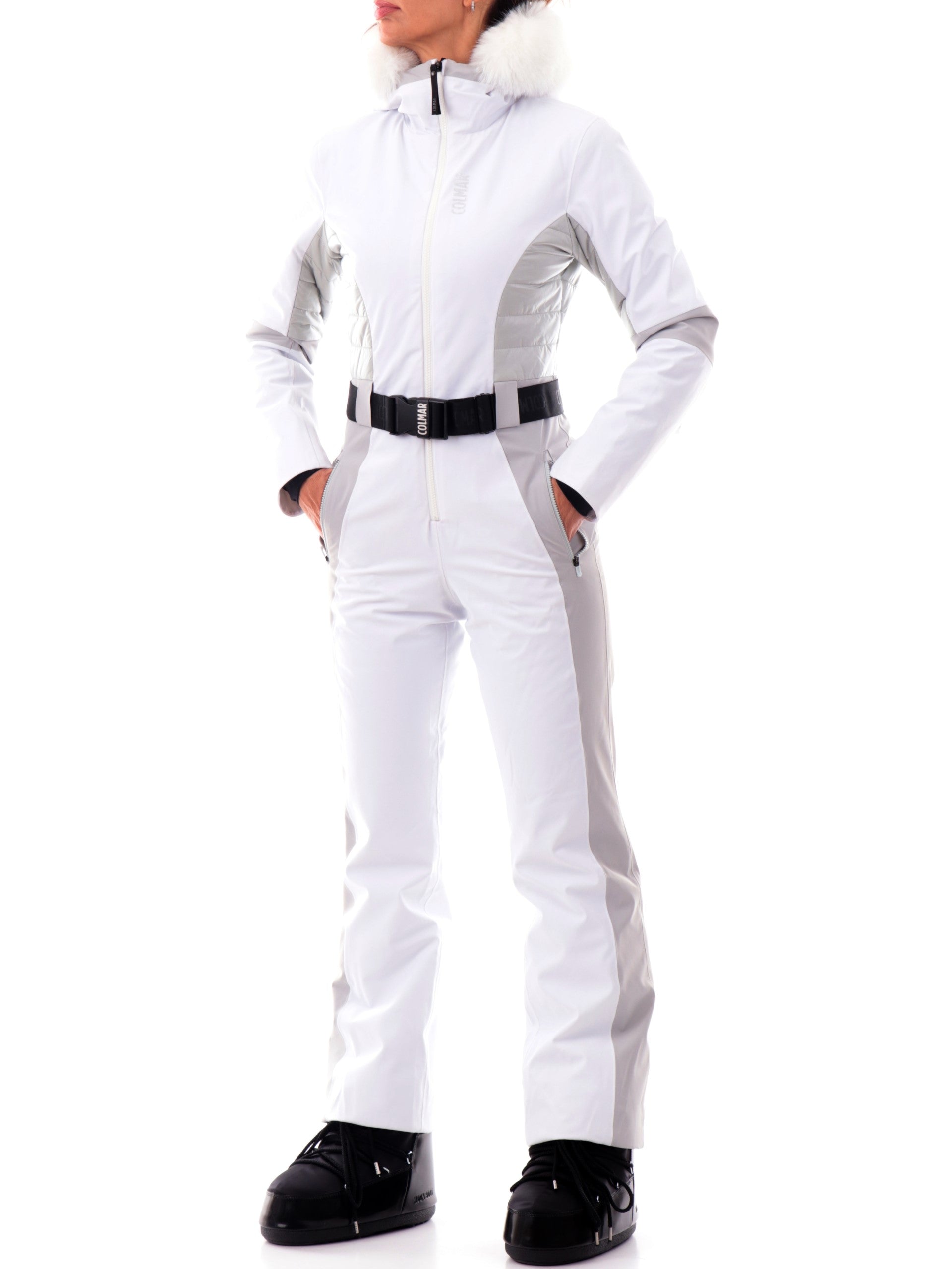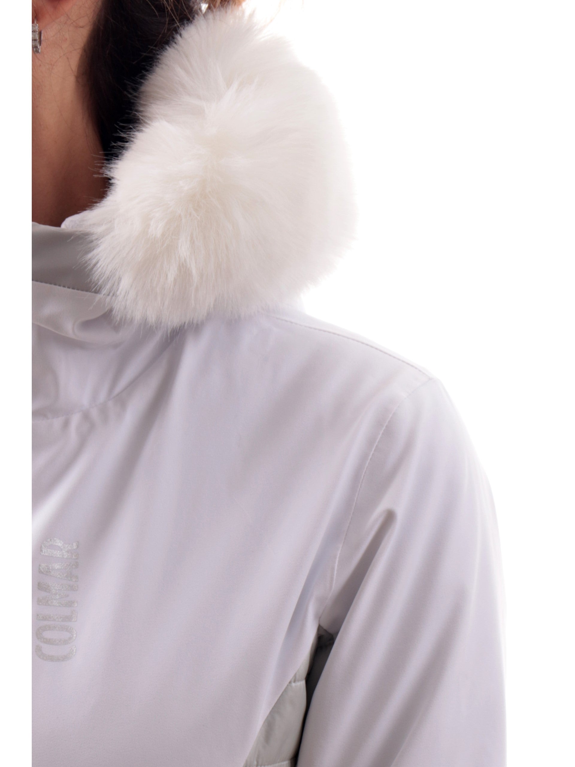 Tuta intera bianca sci da donna Colmar con ecopelliccia removibile. Questa tuta intera Colmar è realizzata in tessuto stretch 4Way impermeabile e traspirante, il calore è garantito dalla fodera con fibre di grafene, che assicura una termoregolazione ottimale. Questa tuta bianca da sci è caratterizzata dal cappuccio fisso regolabile con coulisse con ecopelliccia removibile, chiusura con zip, due tasche latreali con zip, cintura in vita logata, una tasca interna, polsi interni in stretch, fondo gamba regolabile con zip