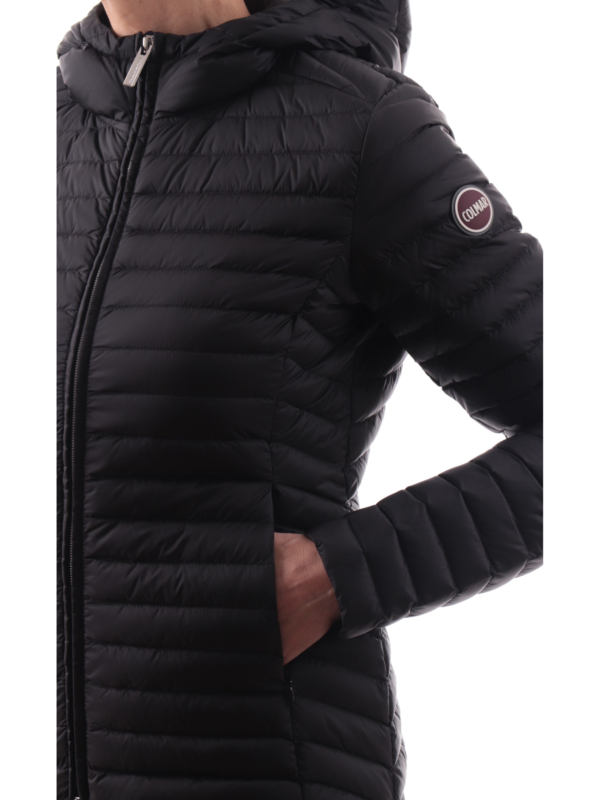 Piumino 100 grammi nero Colmar da donna. Questo piumino Colmar nero ha il cappuccio fisso, la chiusura full zip con doppio cursore, il patch gommato del brand applicato sulla manica sinistra, due tasche laterali con chiusura zip e polsini e fondo regolari. Ideale per le giornate di primavera e le sere d’estate.