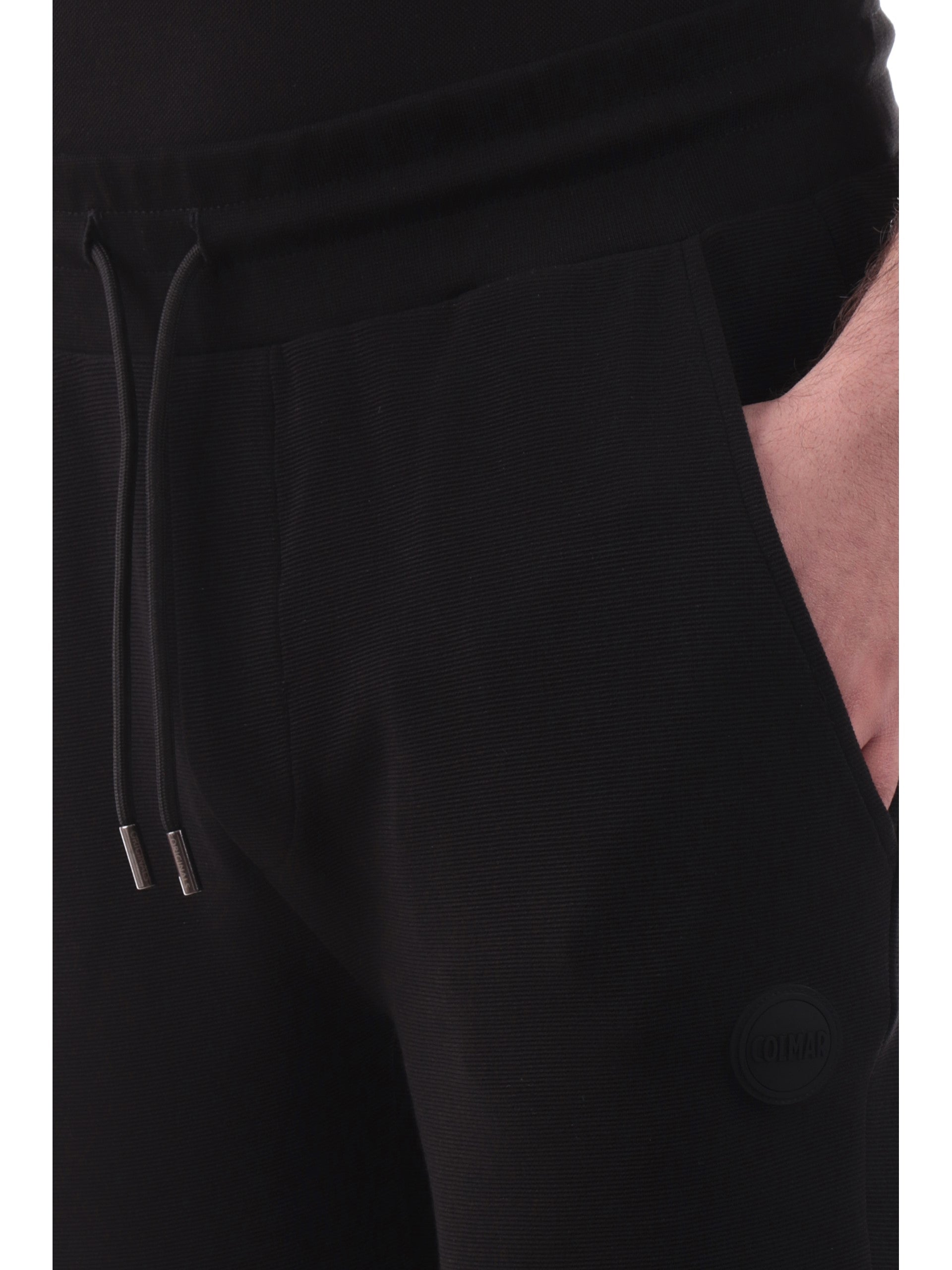 Pantaloni tuta Colmar neri da uomo patch Colmar gommato 6155R1XL. Questi pantaloni sport Colmar hanno la banda elastica sul punto vita regolabile con laccetti, due tasche laterali aperte, una tasca posteriore, polsini elasticizzati e il patch Colmar applicato sul lato sinistro.