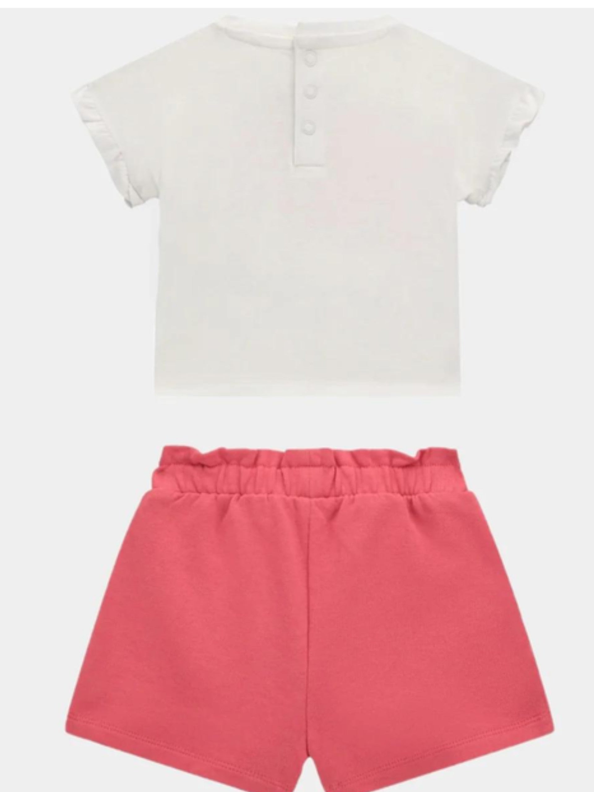 Tuta Guess bianca e fucsia da neonata in cotone A5GG17K6YW4. La maglia di questo completino Guess ha la chiusura con bottone automatico sul lato posteriore e la maxi stampa del brand sul davanti a contrasto colore. I pantaloncini di questo completo Guess hanno la banda elastica sul punto vita regolabile con laccetti, due tasche laterali aperte e il logo Guess a contrasto colore.