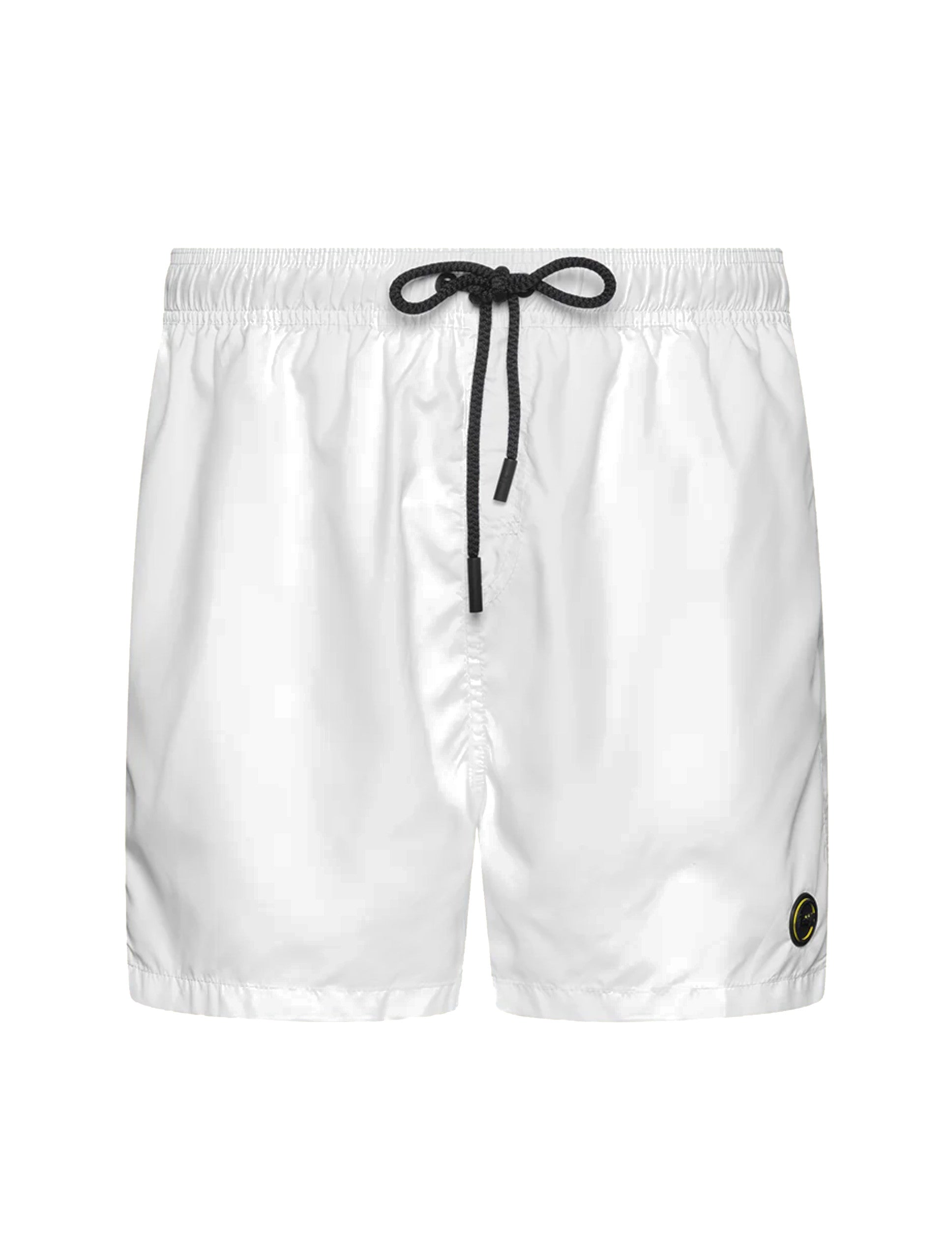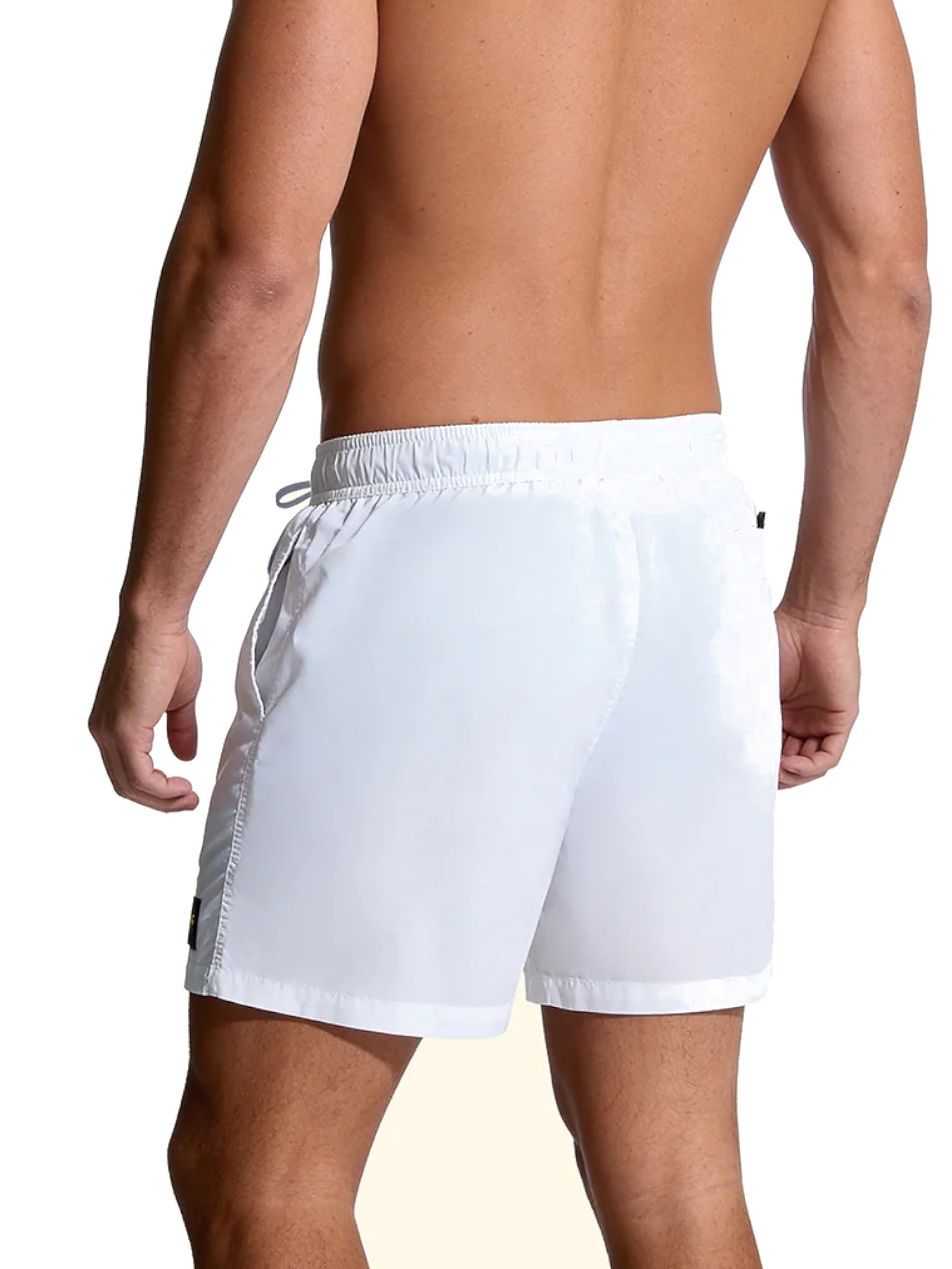 Costume mare Effek bianco da uomo, realizzato in tessuto in grado di asciugarsi in pochissimi minuti. Questo costume Effek bianco ha la banda elastica sul punto vita regolabile con laccetti, la retina interna traspirante, due tasche laterali con zip e il patch del brand applicato sul fondo a sinistra.