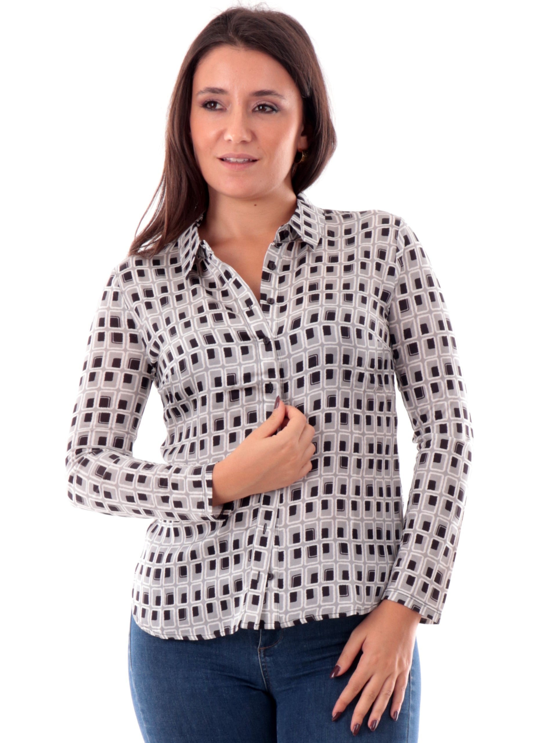 Camicia raso Anis grigia da donna stampa geometrica 255W1436, realizzata in viscosa. Questa camicia donna Anis White ha il colletto alla francese, le maniche lunghe con polsini, la chiusura con bottoni e la stampa geometrica all over. Il doppio tessuto:davanti satin e sul retro viscosa elasticizzata è la caratteristica delle camicie anis.