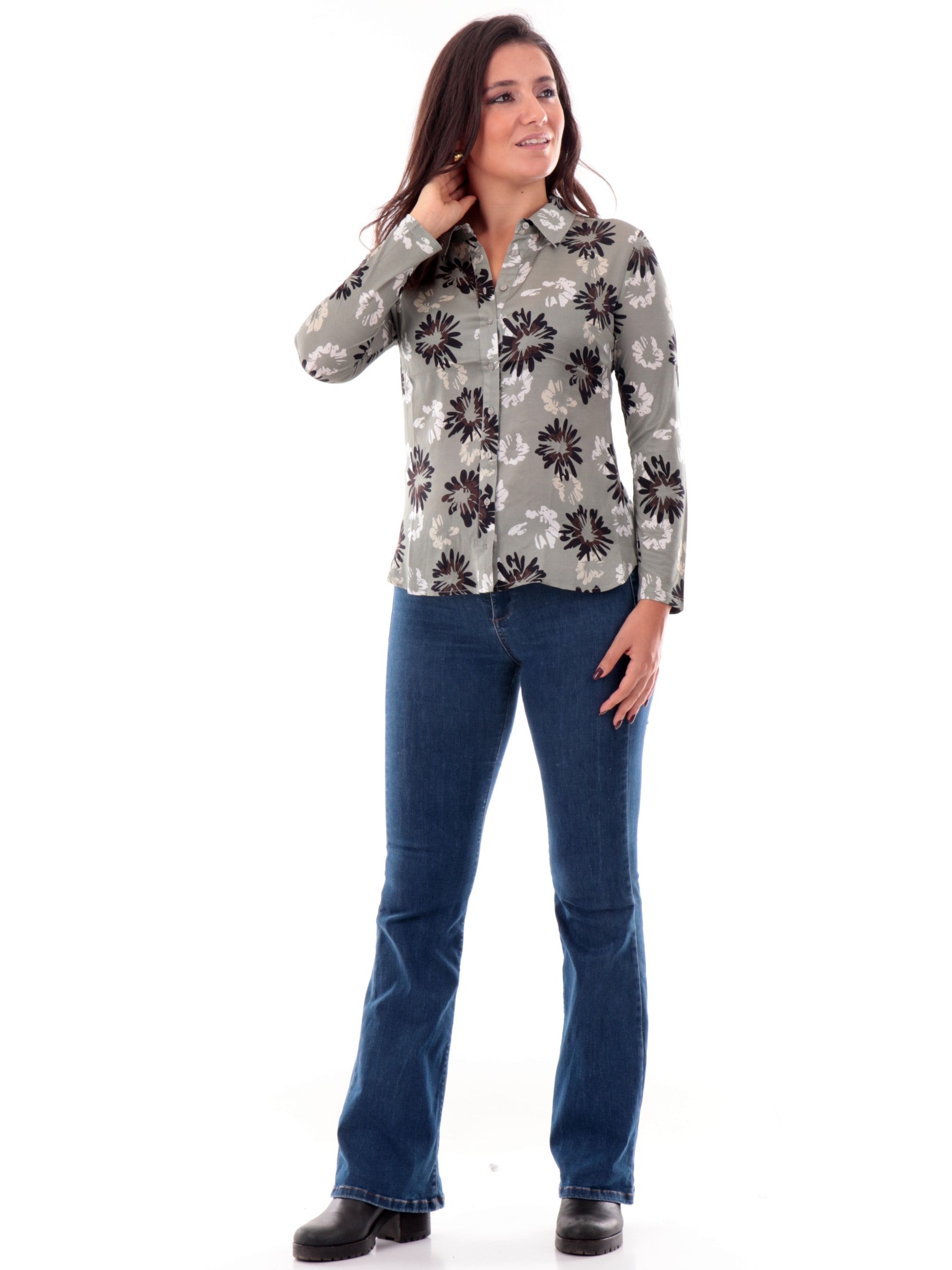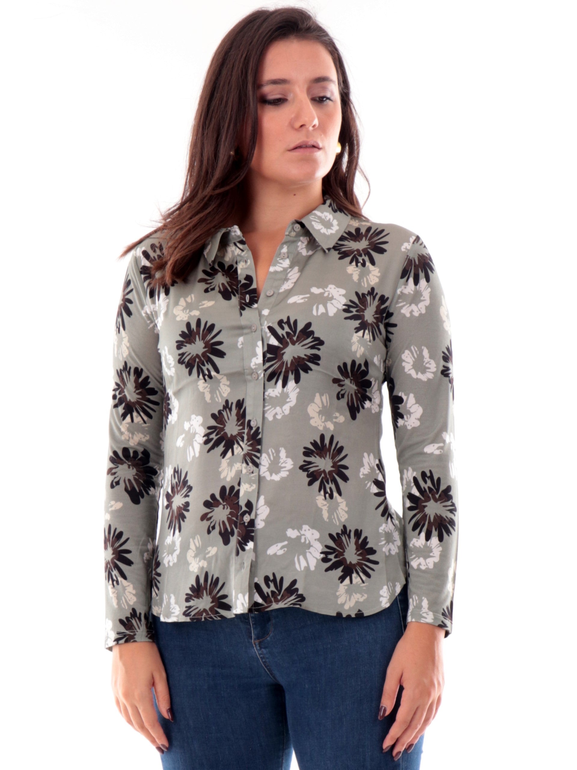 Camicia raso Anis verde da donna stampa fiori 255W1425, realizzata in viscosa. Questa camicia donna Anis White ha il colletto alla francese, le maniche lunghe con polsini, la chiusura con bottoni e la stampa floreale all over.