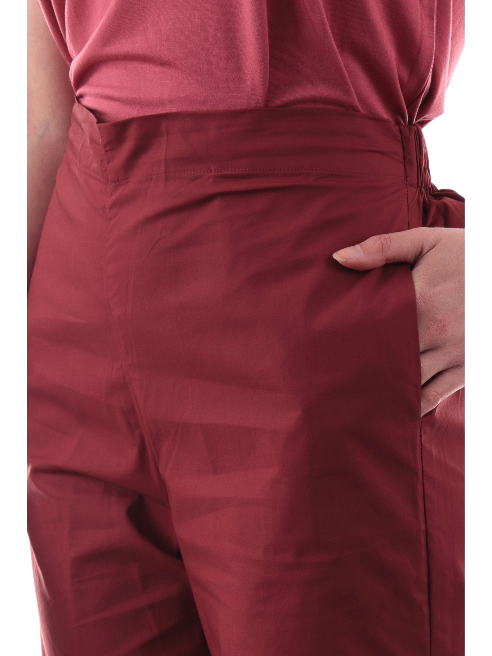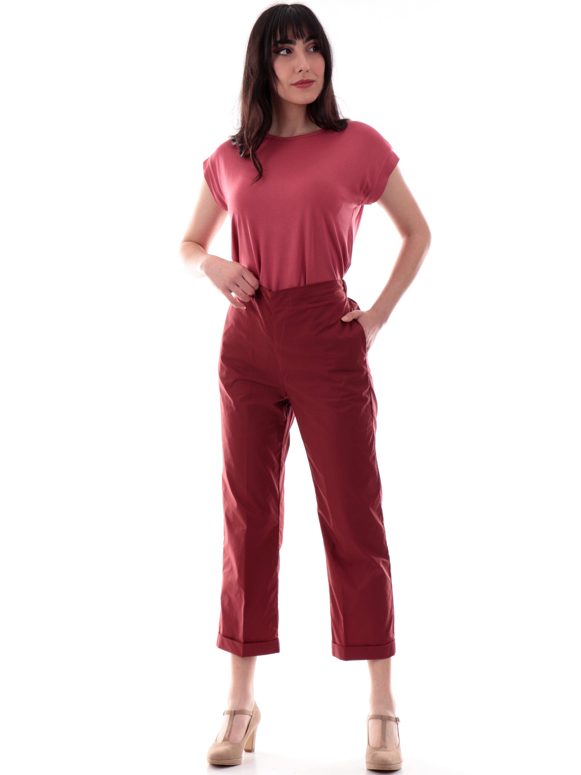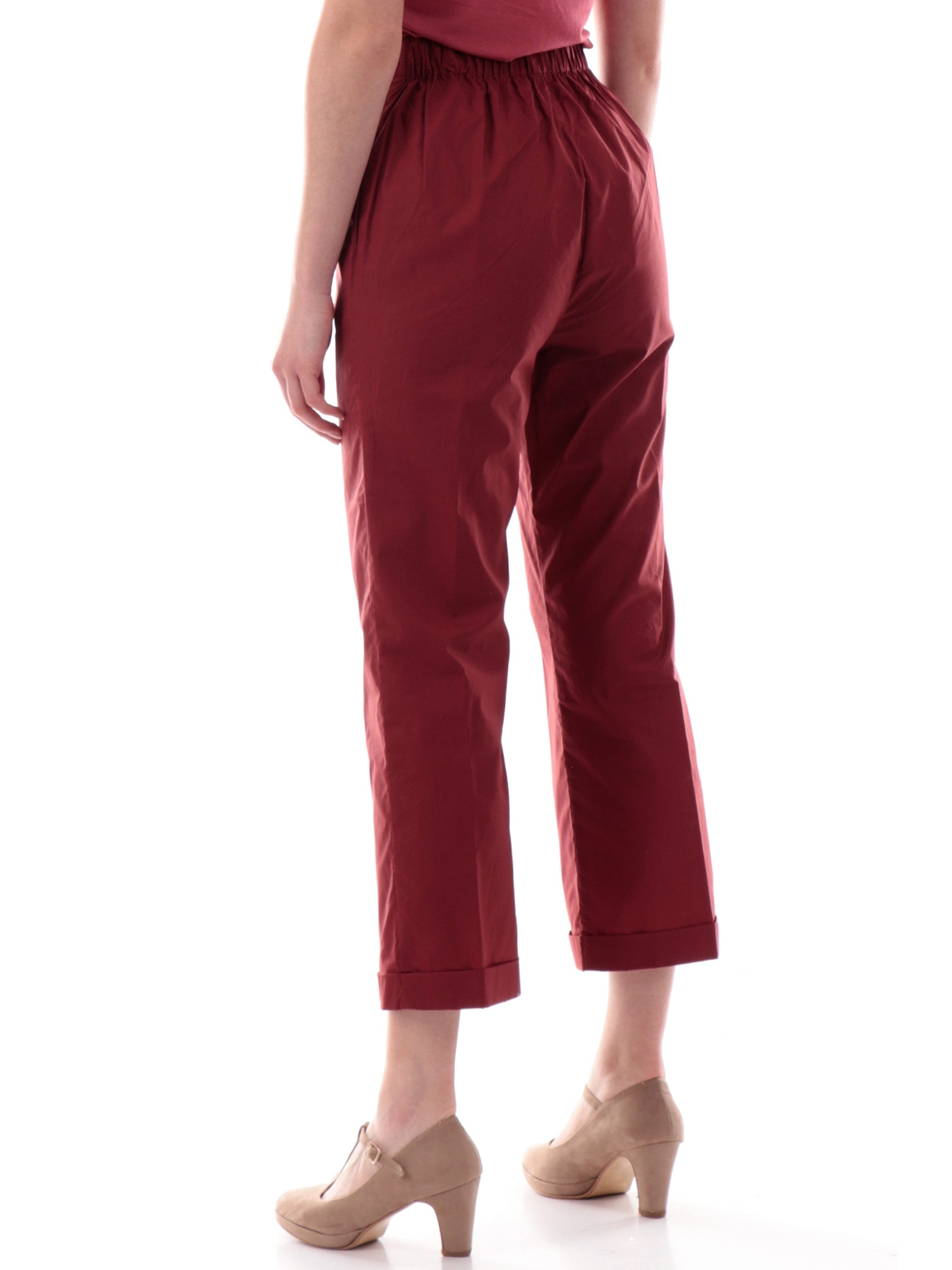 Pantaloni crop Anis bordeaux da donna con banda elastica 251C1260, realizzati in 100% puro cotone. Questi pantaloni Anis White bordeaux hanno la banda elastica sul lato posteriore, due tasche laterali aperte, la vestibilità crop e il fondo con risvolto.