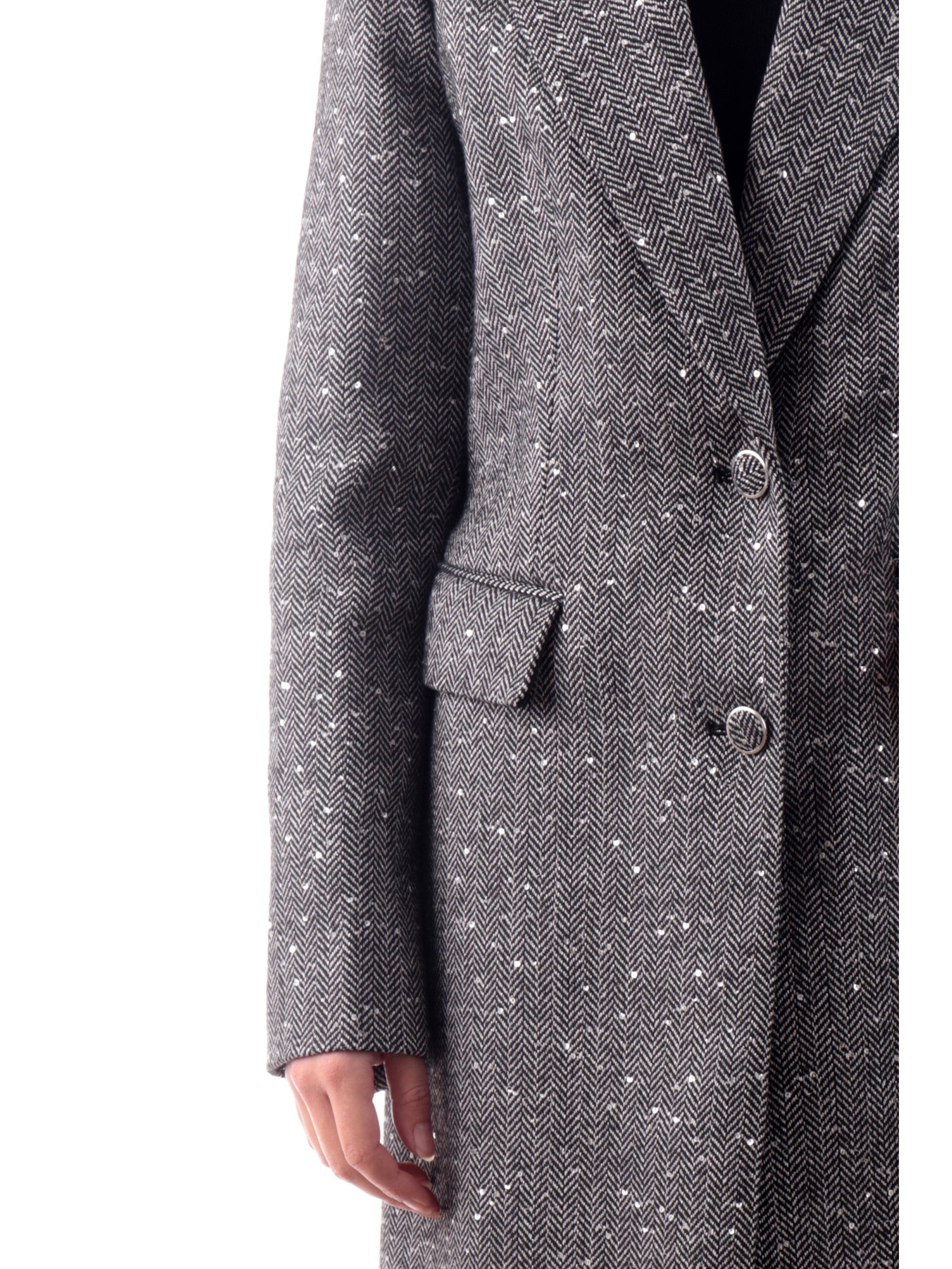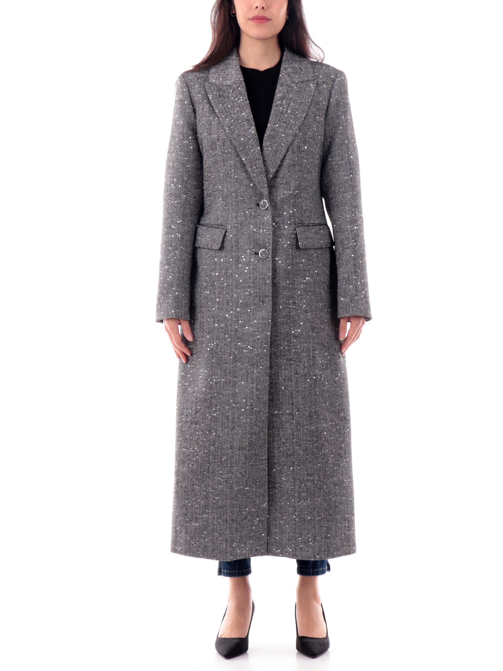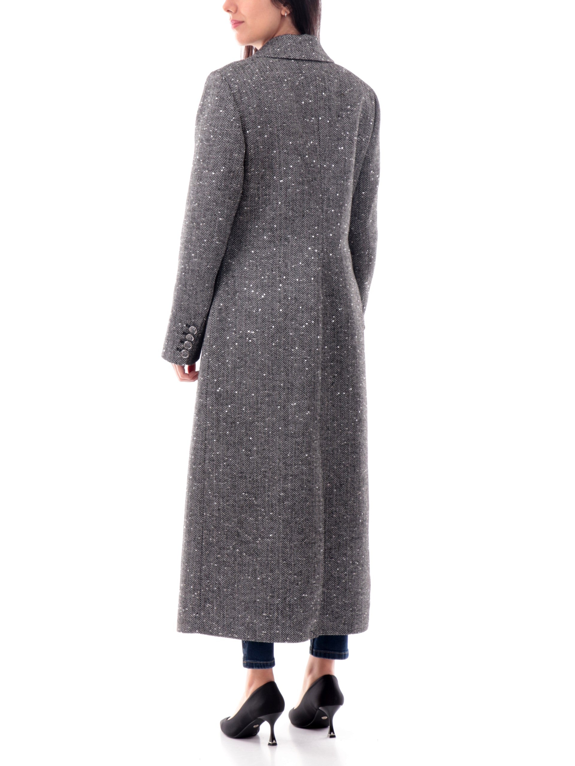 Cappotto lungo grigio Guess da donna con pailletes STEFANIA FITTED COAT. Questo cappotto Guess grigio da donna è realizzato da pailletes che lo rendono ancora più luminoso, chiusura centrale a due bottoni, due tasche laterali con patta e polsini regolabili con bottoni. Questo cappotto Guess è perfetto anche per una serata