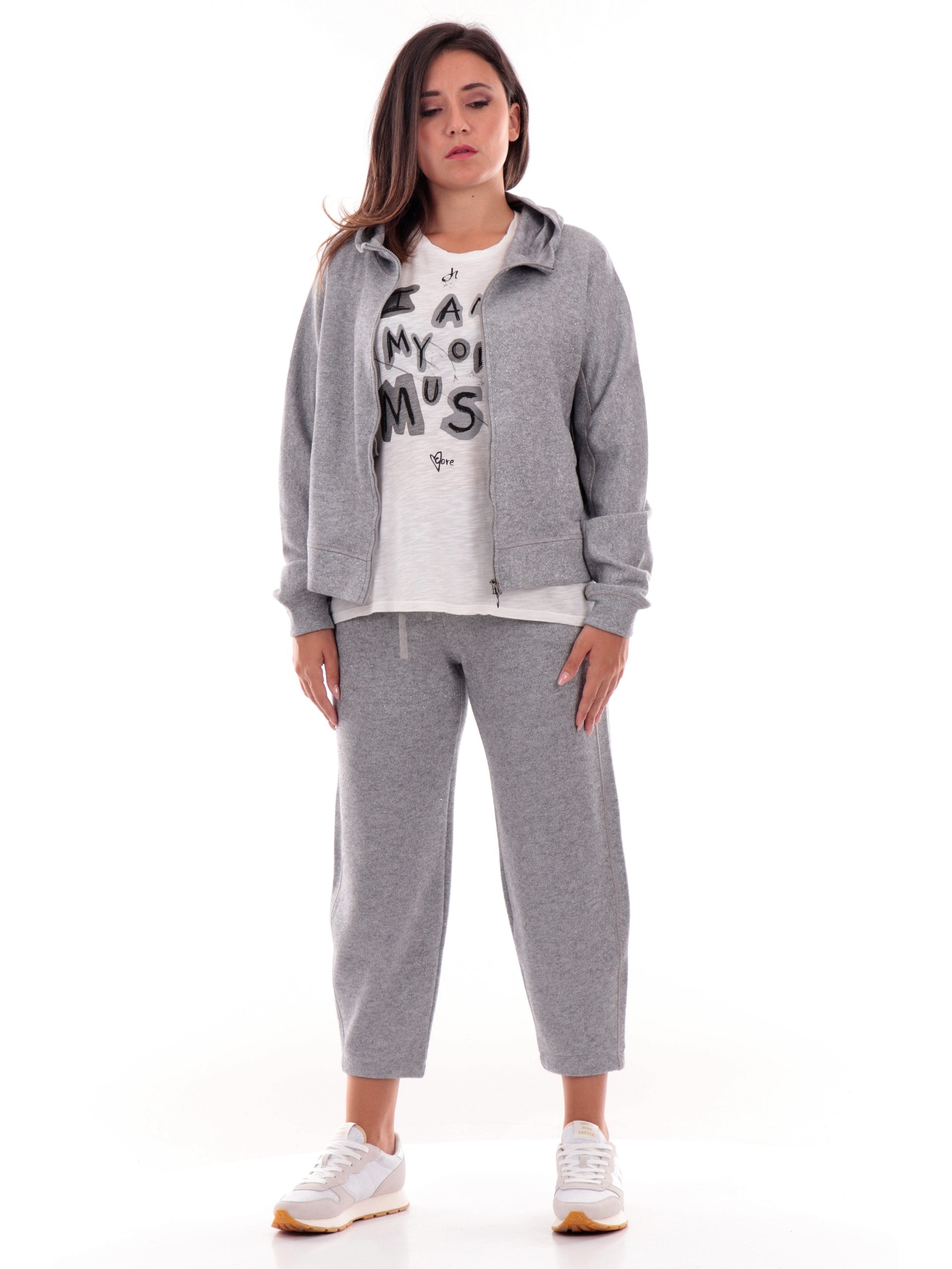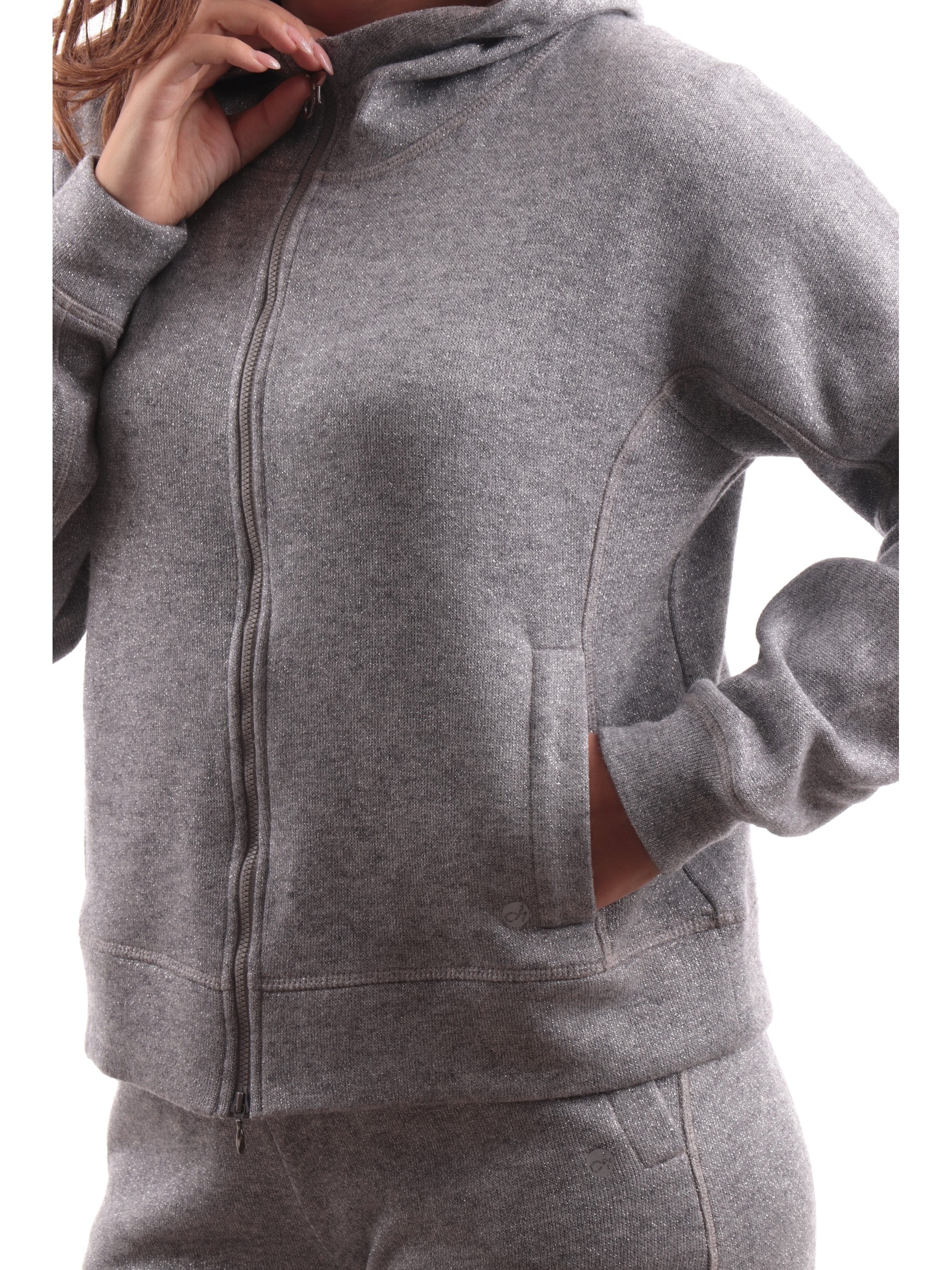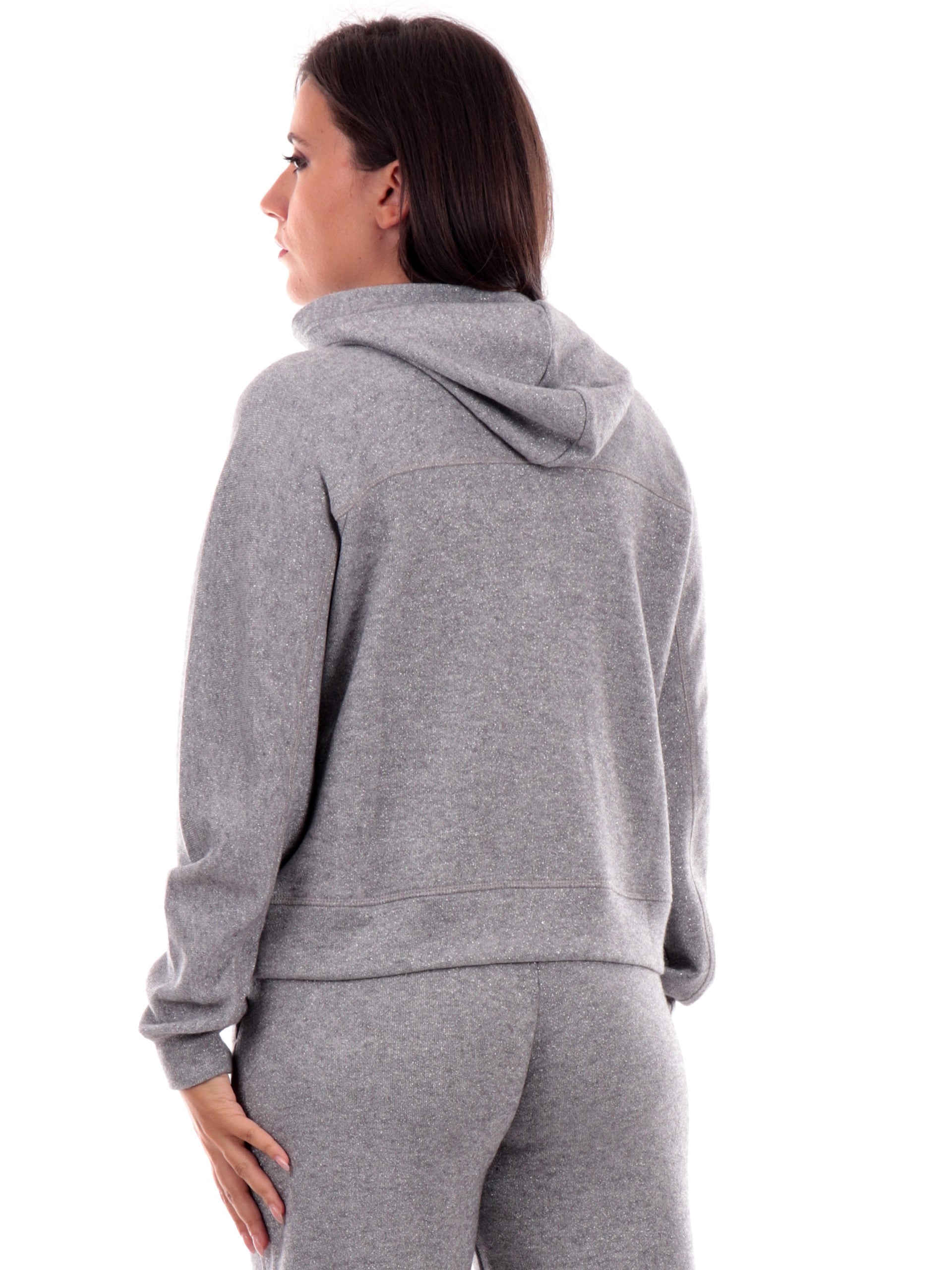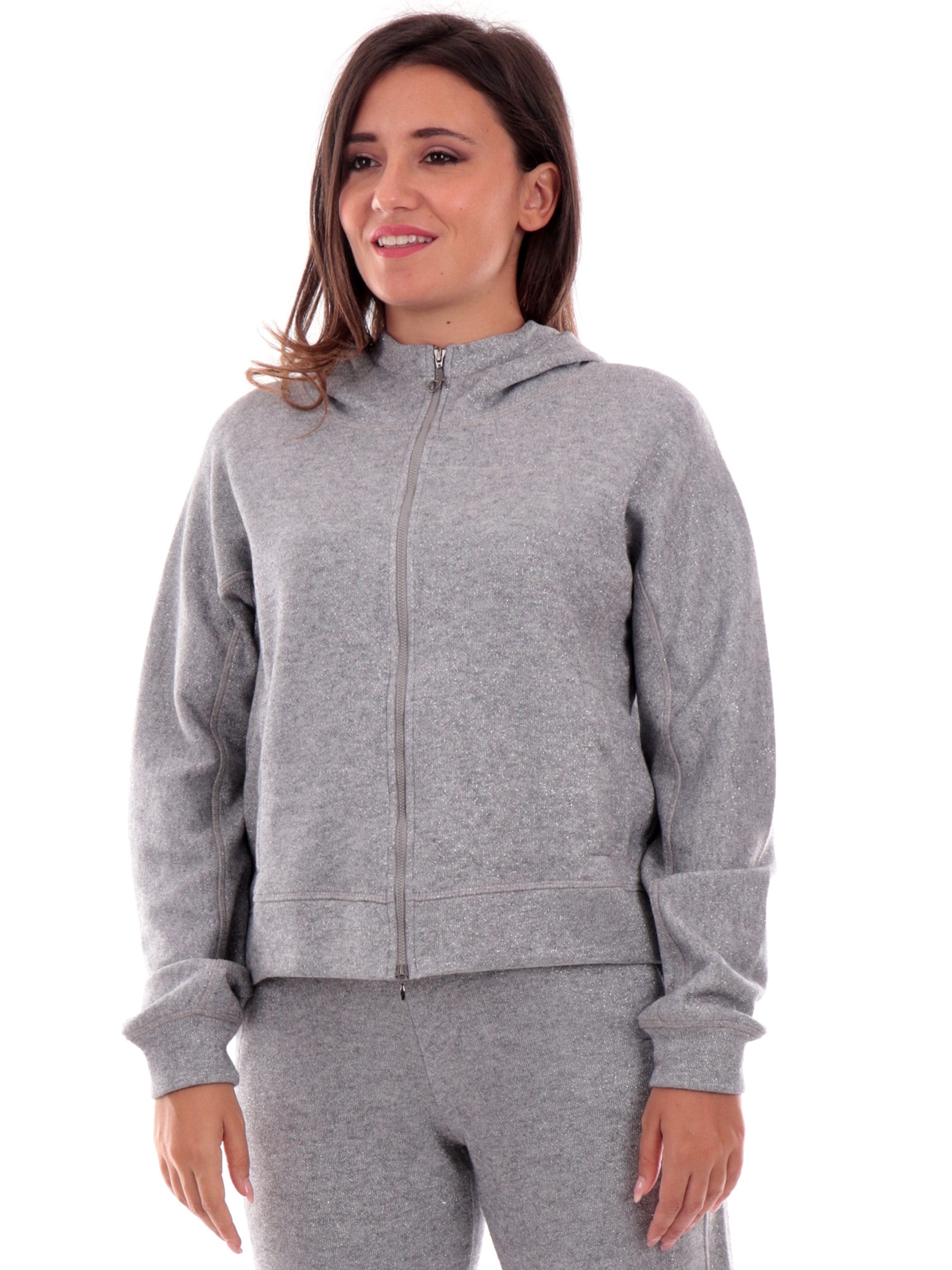 Felpa Deha argento da donna D12054, realizzata in tessuto lurex. Questa felpa Deha argento ha il cappuccio, la chiusura full zip centrale, due tasche laterali aperte, polsini e fondo elasticizzati.