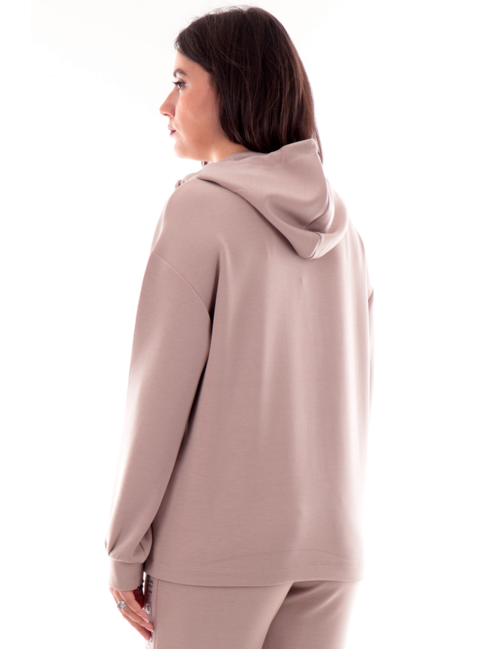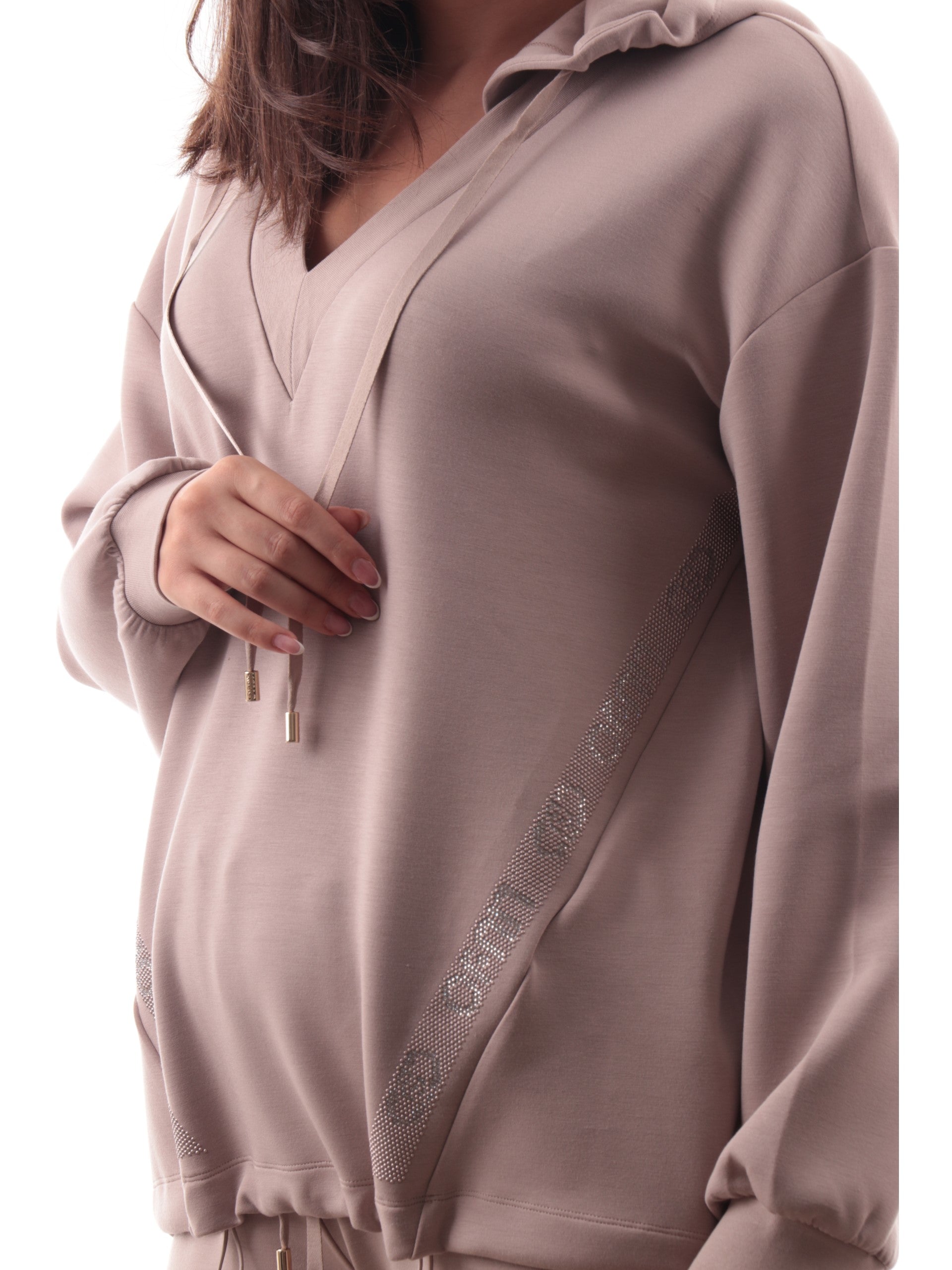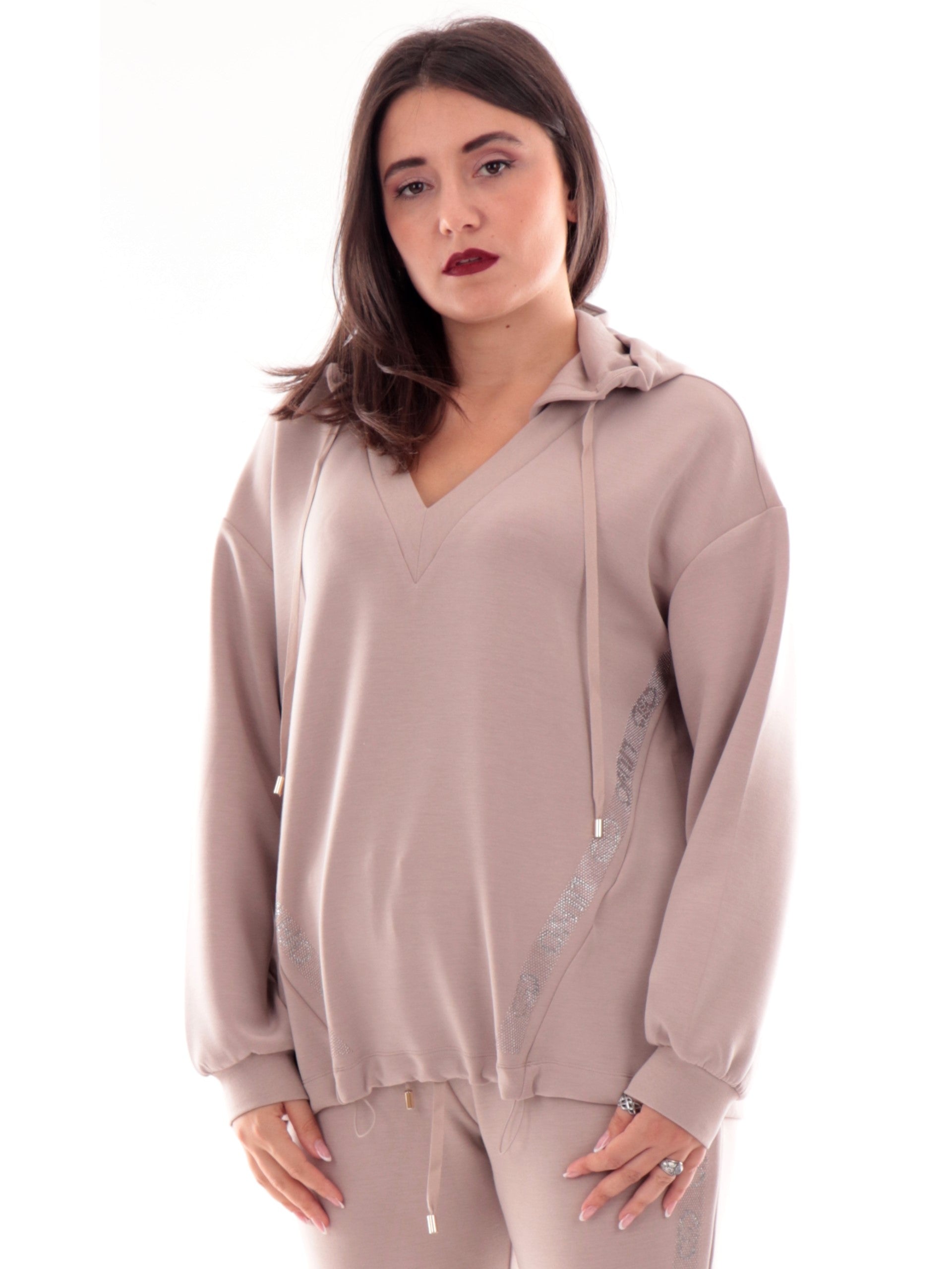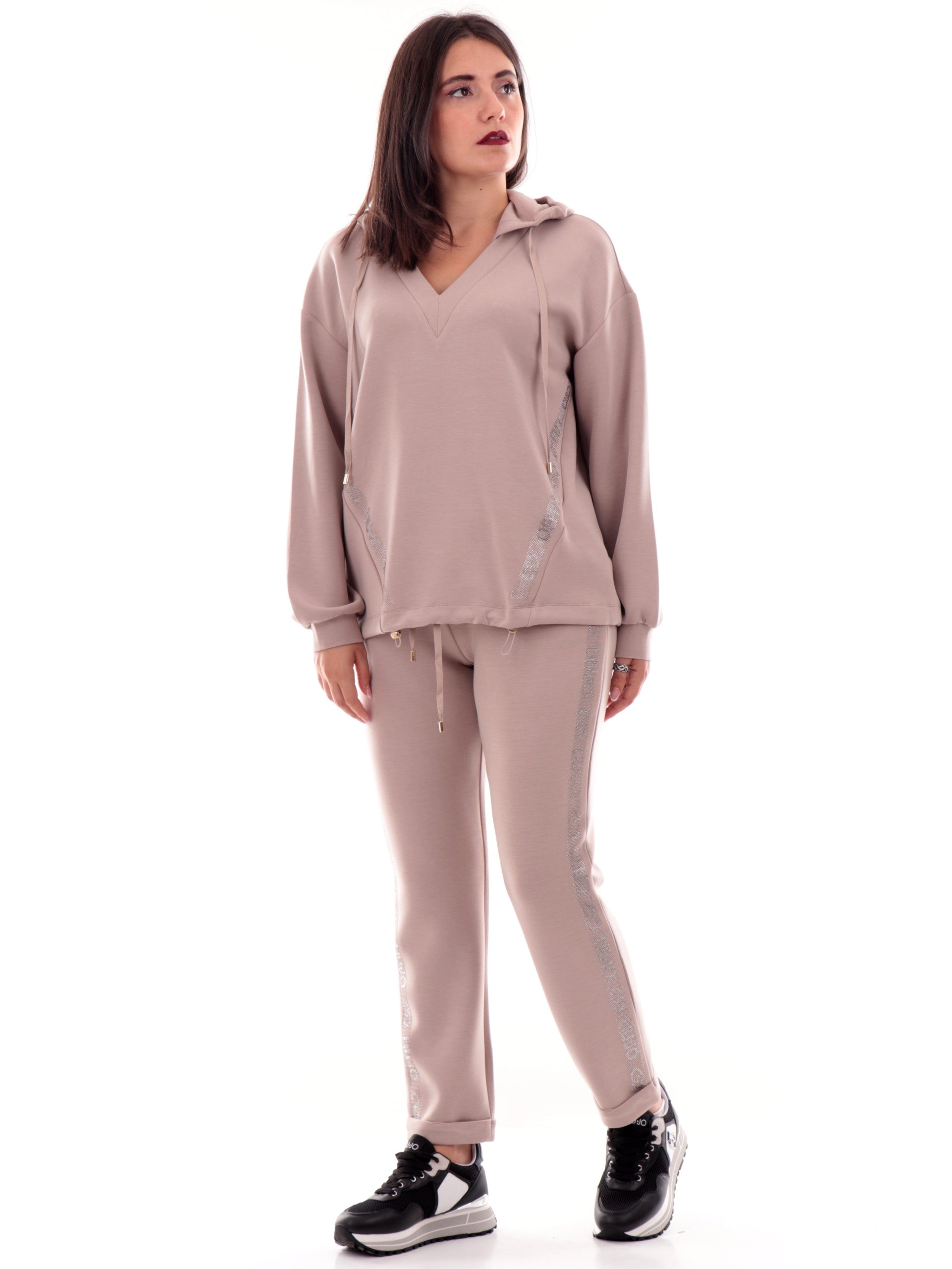 Felpa Liu Jo beige da donna con cappuccio vestibilità morbida TF5091J4616. Questa felpa donna Liu Jo beige ha il cappuccio fisso regolabile con laccetti, lo scollo a V, la vestibilità morbida, il fondo regolabile con coulisse e inserti con strass logati.