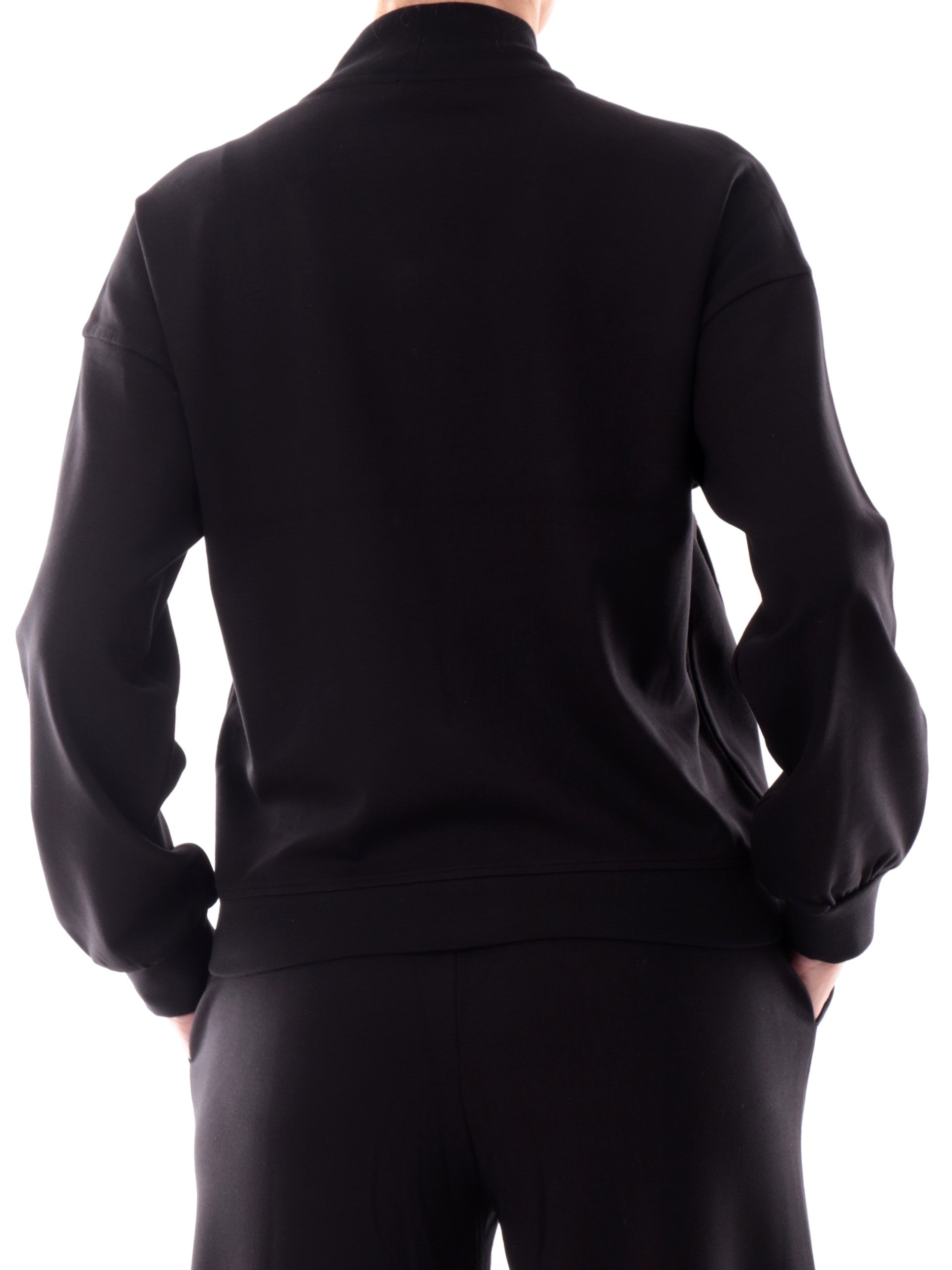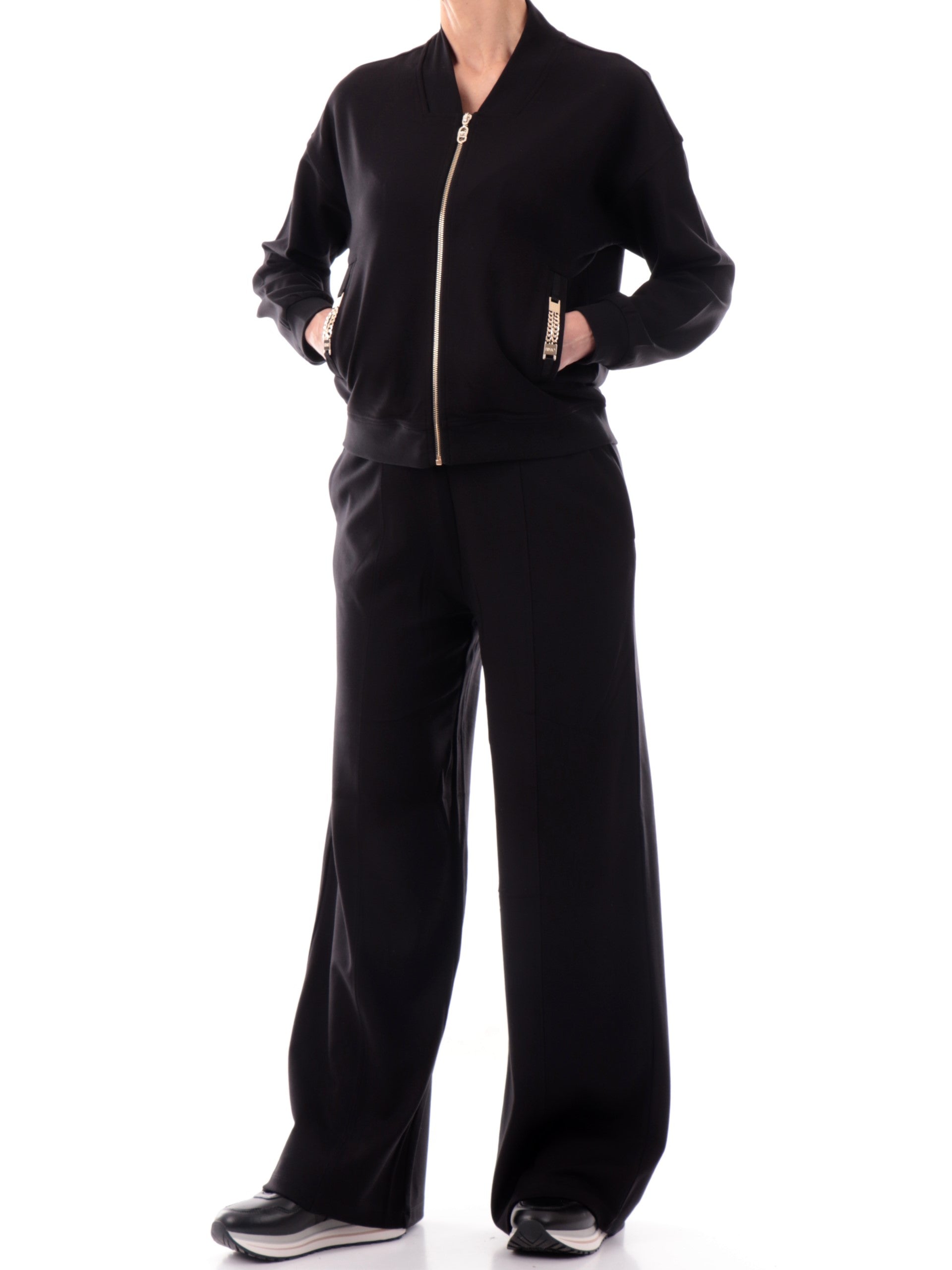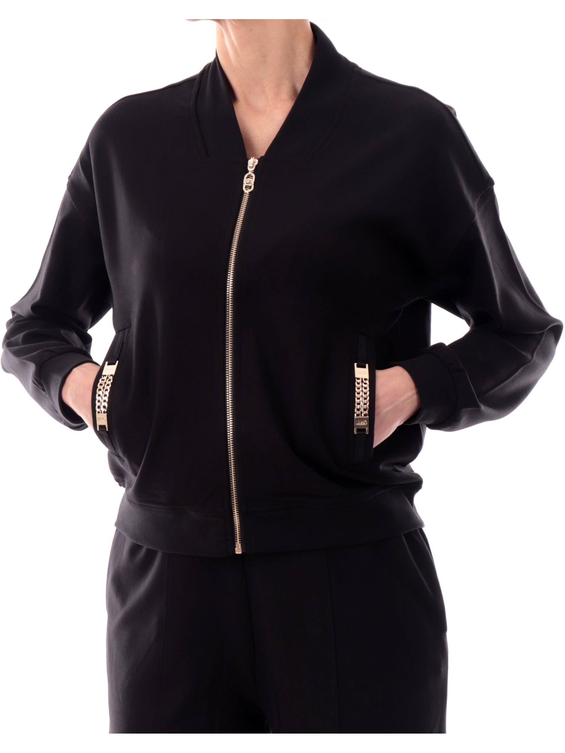 Felpa Liu Jo nera da donna con con catenella oro. Questa felpa Liu Jo, realizzata in morbida viscosa, è caratterizzata dalla chiusura full zip centrale, due tasche laterali con catenella ora ambi lati, polsini e fondo elasticizzati