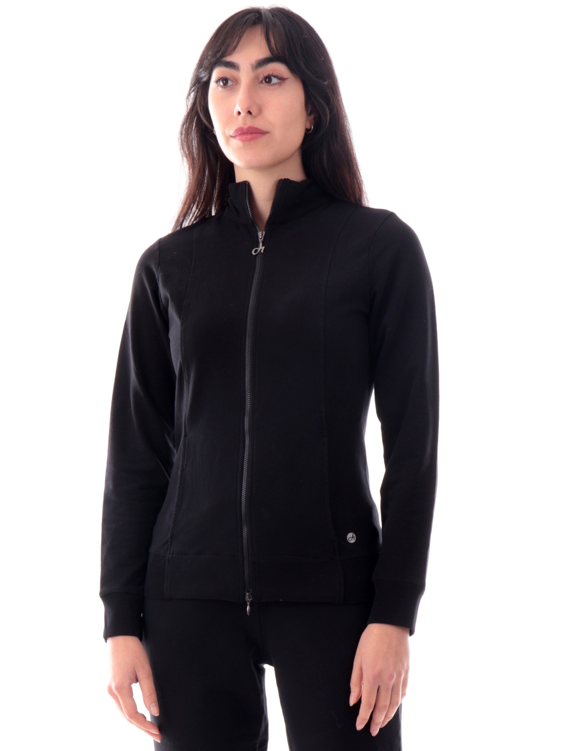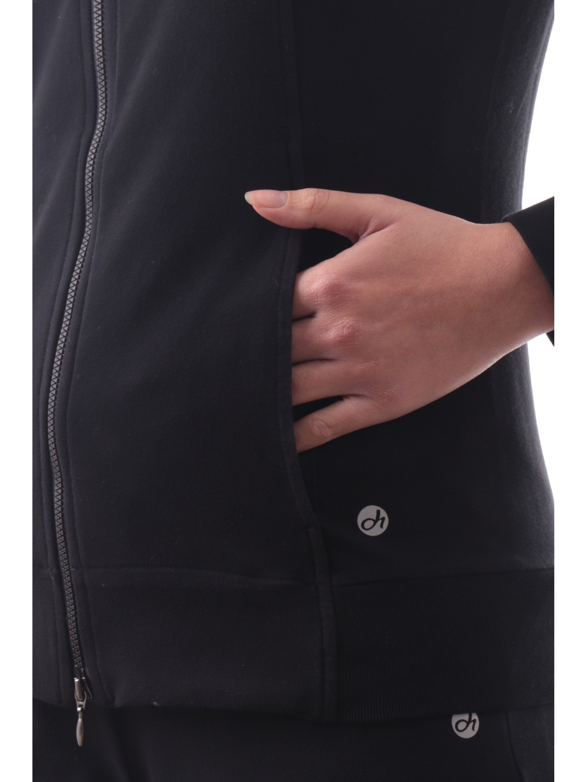 Felpa nera Deha collo alto. Questa felpa nera Deha caratterizzata dal collo alto è realizzata in cotone è perfetta per ogni occasione, la superficie soffice fornisce anche una sensazione di comfort emorbidezza sulla pelle. Ideale all'aperto o per un momento di relax. Questa felpa nera Deha è caratterizzata dalla chiusura centrale full zip co doppio cursore, due tasche laterali aperte, polsini e fondo elasticizzati a costine