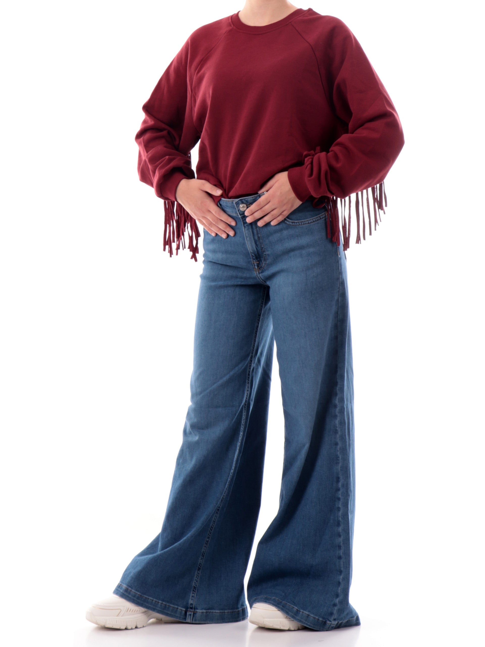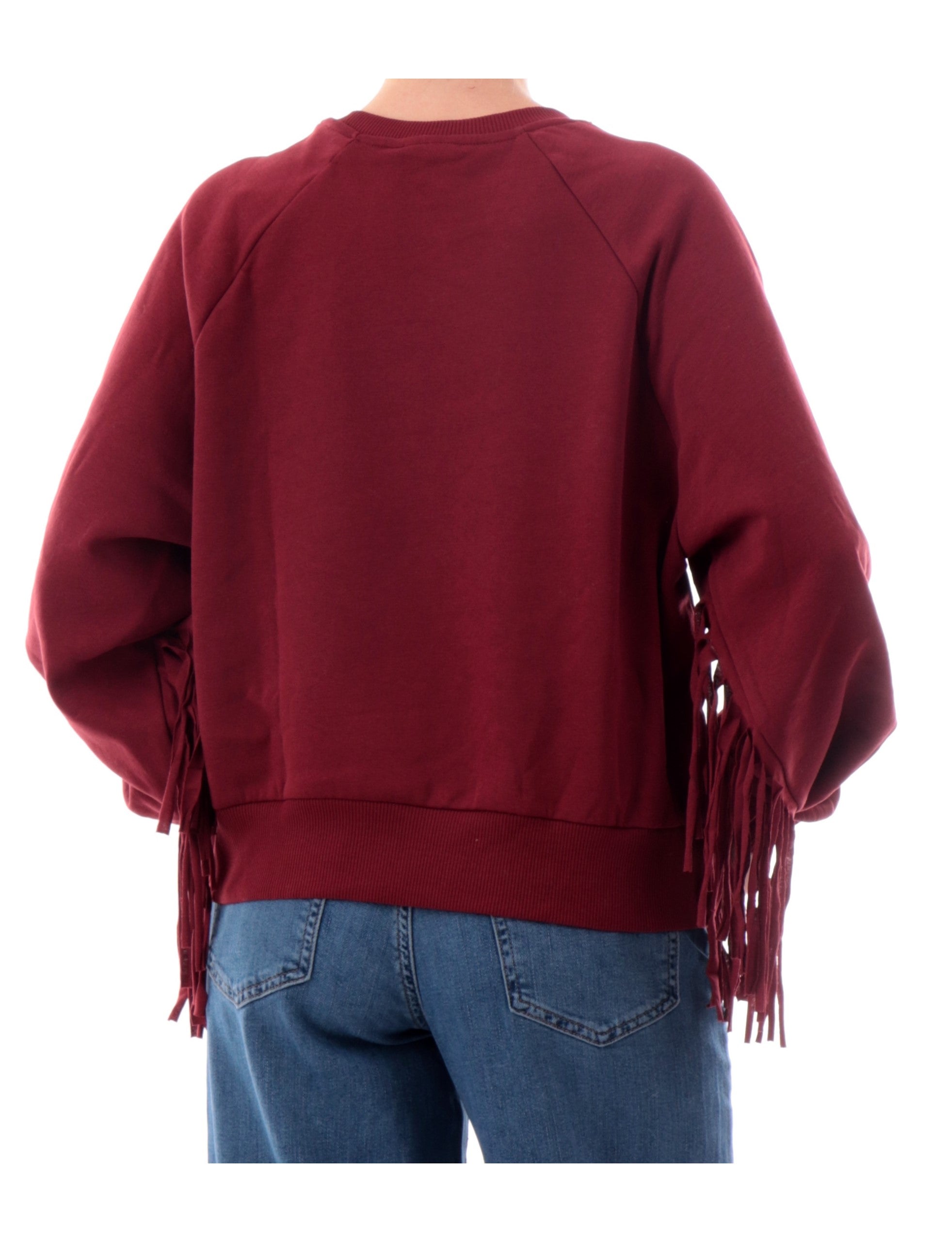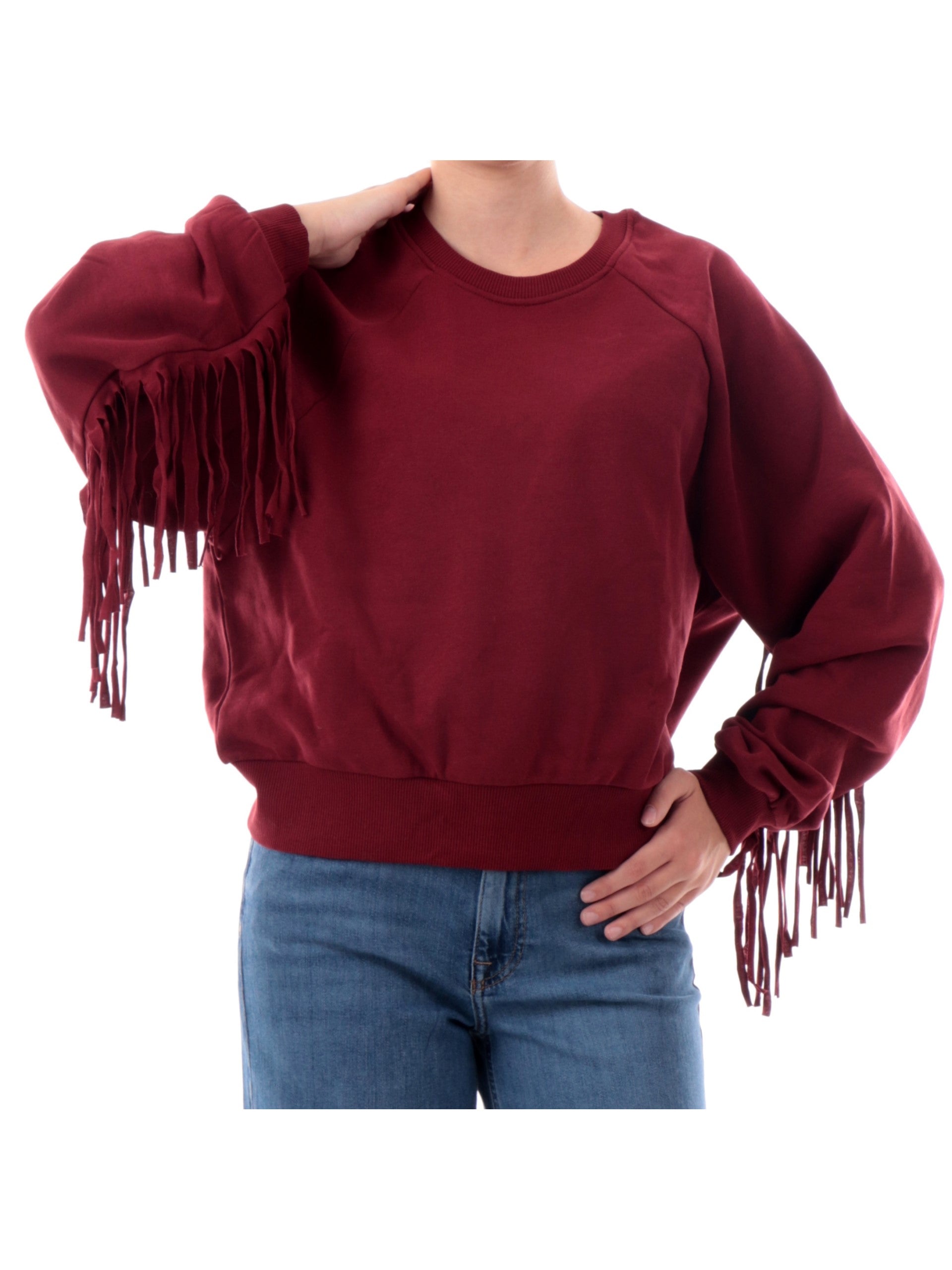 Felpa Only rossa da donna girocollo con frange 15355912, realizzata in cotone. Questa felpa donna Only rossa girocollo ha le maniche lunghe con frange, polsini e fondo elasticizzati.