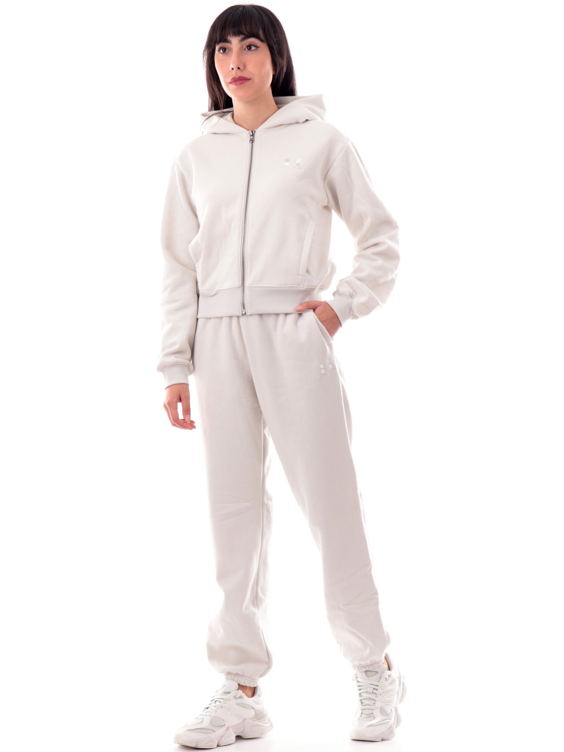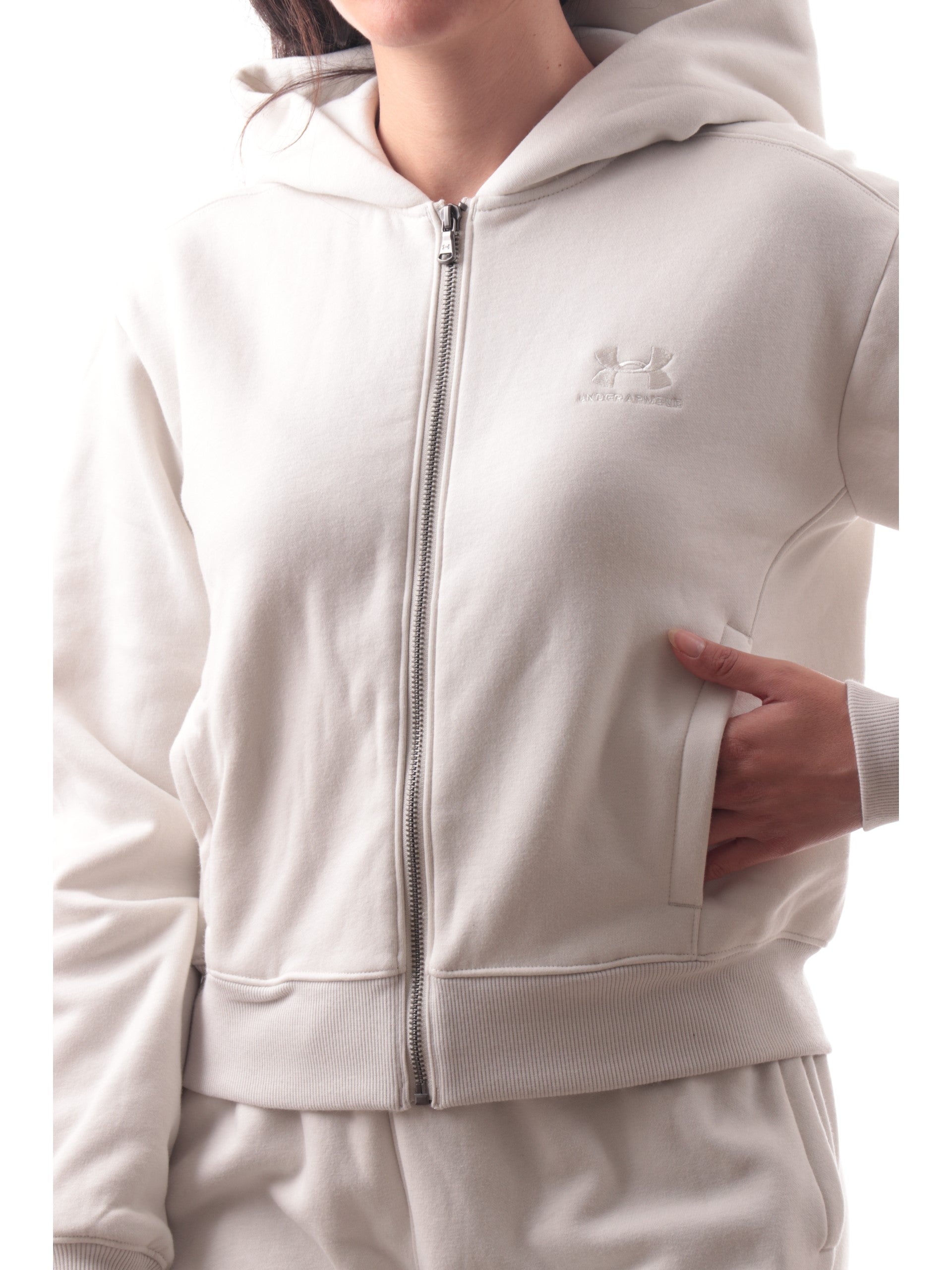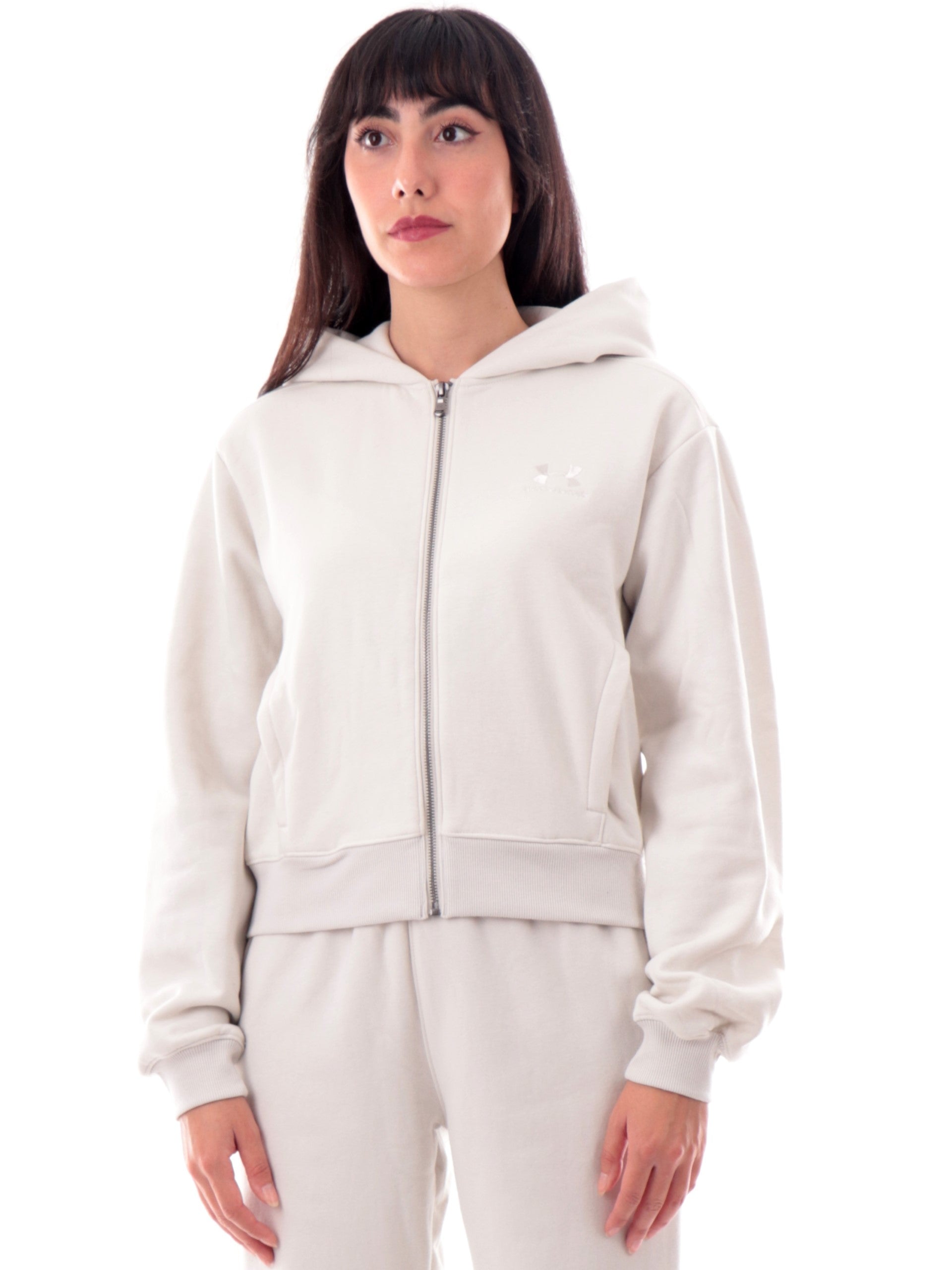 Felpa Under Armour beige felpata da donna full zip con cappuccio 60036740, realizzata in cotone. Questa felpa donna Under Armour beige ha il cappuccio fisso, la chiusura full zip centrale, due taschelaterali aperte, il logo Under Armour ricamato lato cuore, polsini e fondo elasticizzati.