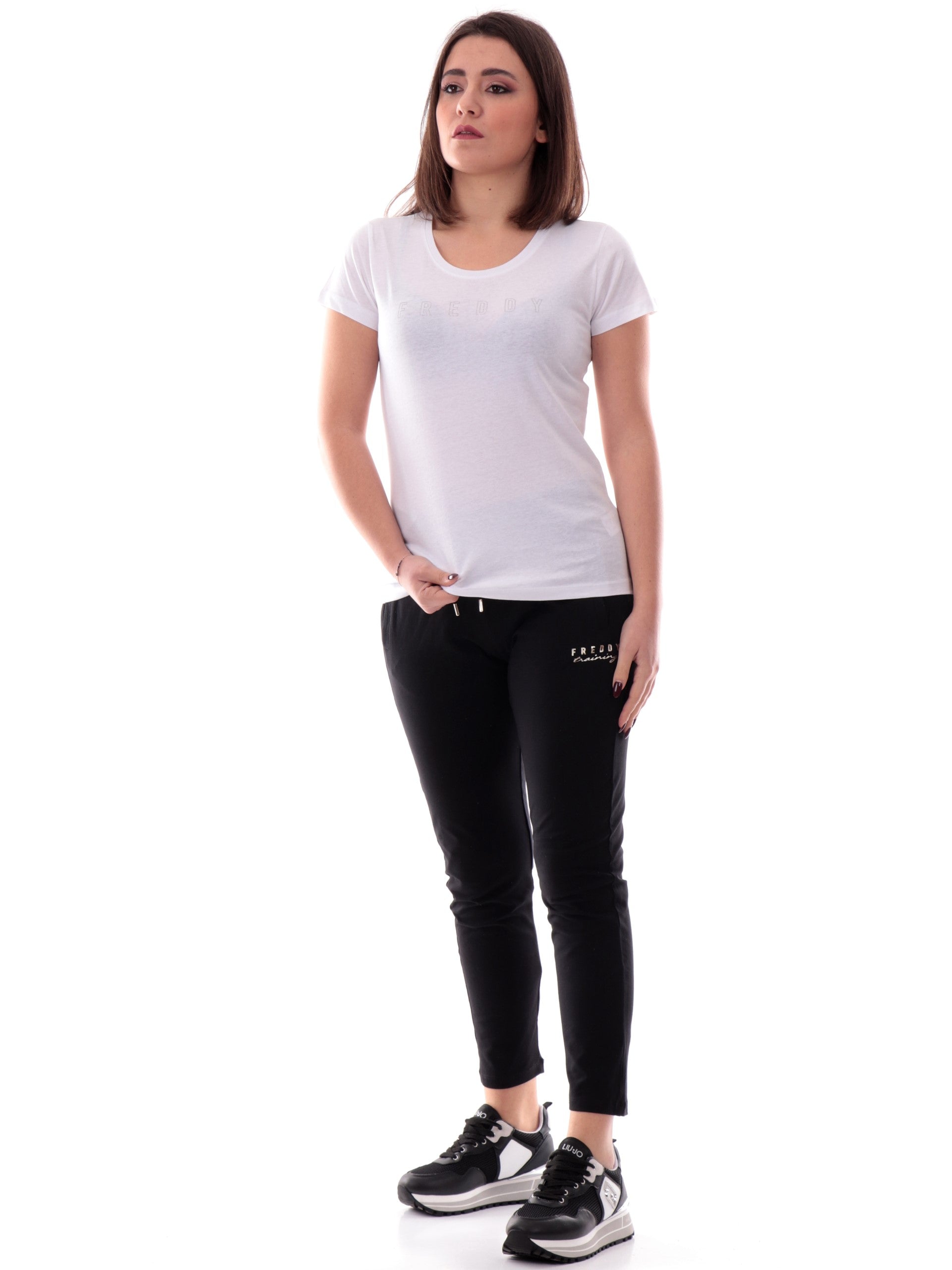 Maglia Freddy bianca da donna logo Freddy con glitter S25WCYLT1, realizzata in 100% cotone. Questa t-shirt Freddy bianca girocollo ha le maniche corte e il logo Freddy sul davanti con glitter.