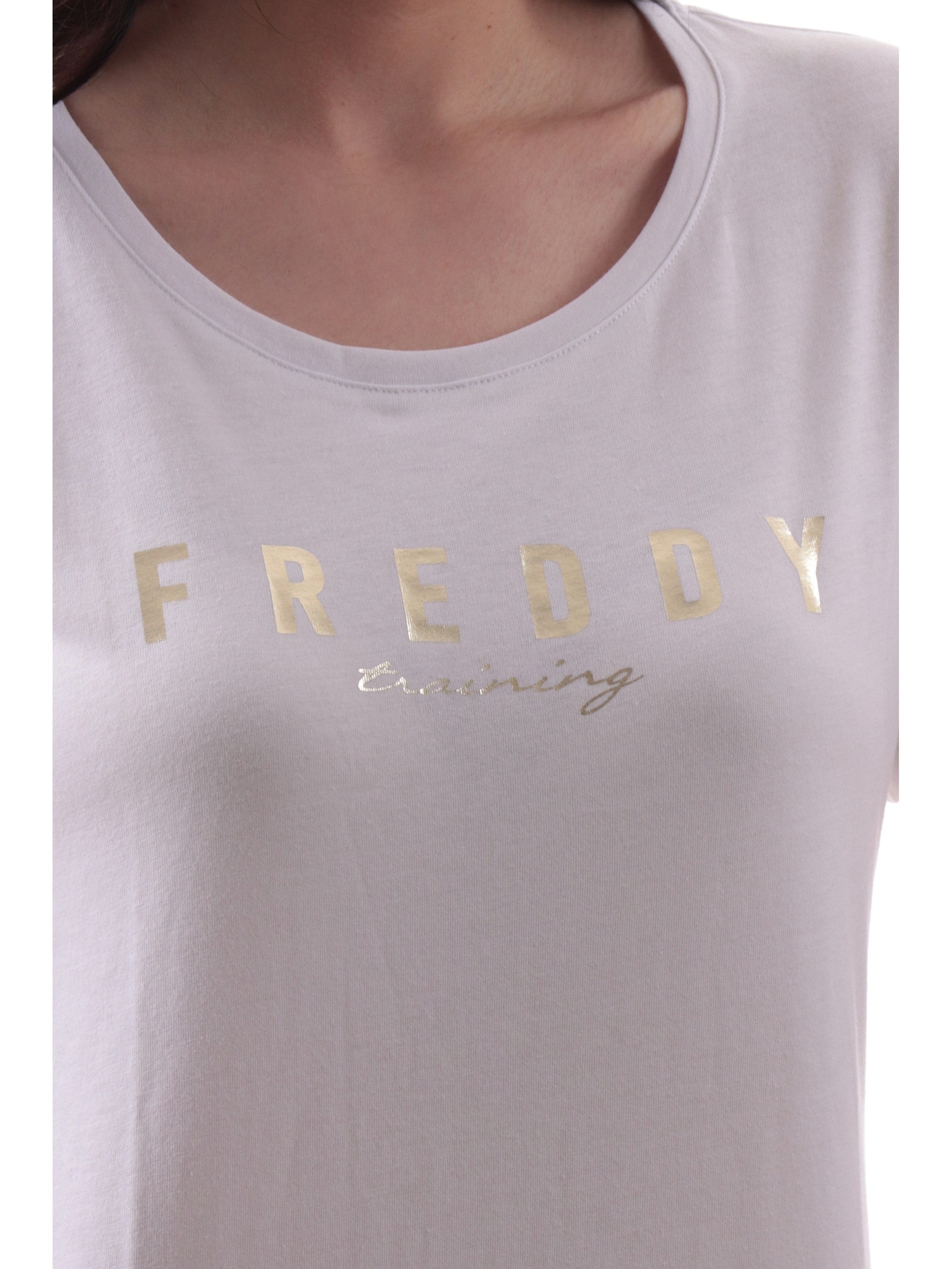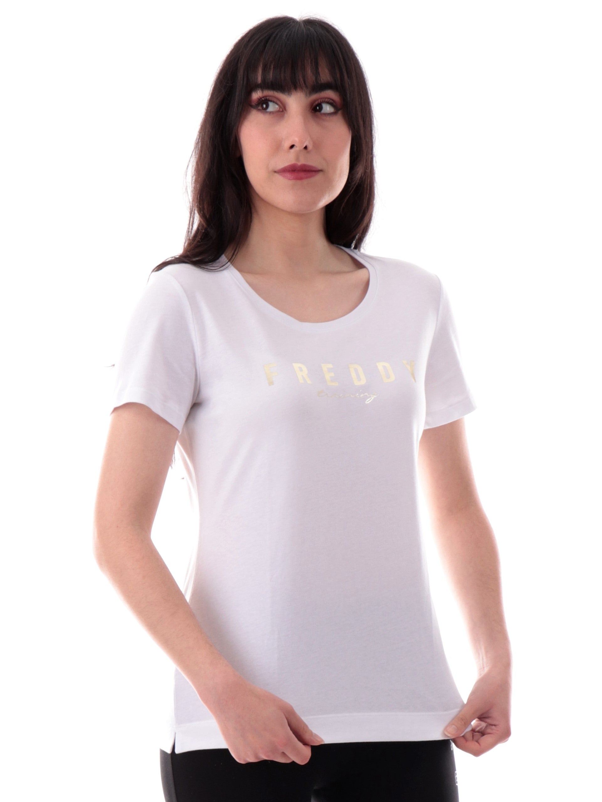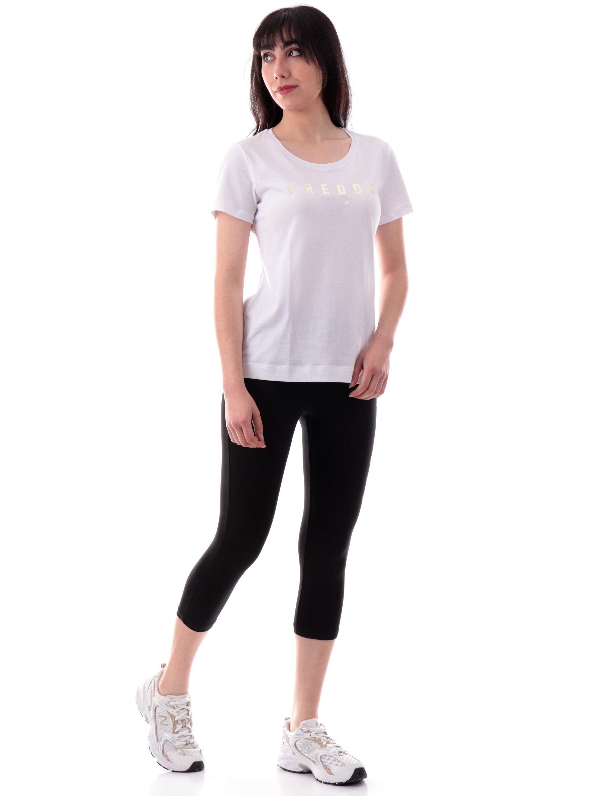 Maglia Freddy bianca girocollo da donna stampa Freddy oro S25WTRT2, realizzata in 100% puro cotone. Questa t-shirt Freddy bianca girocollo ha le maniche corte e il logo Freddy oro sul davanti.