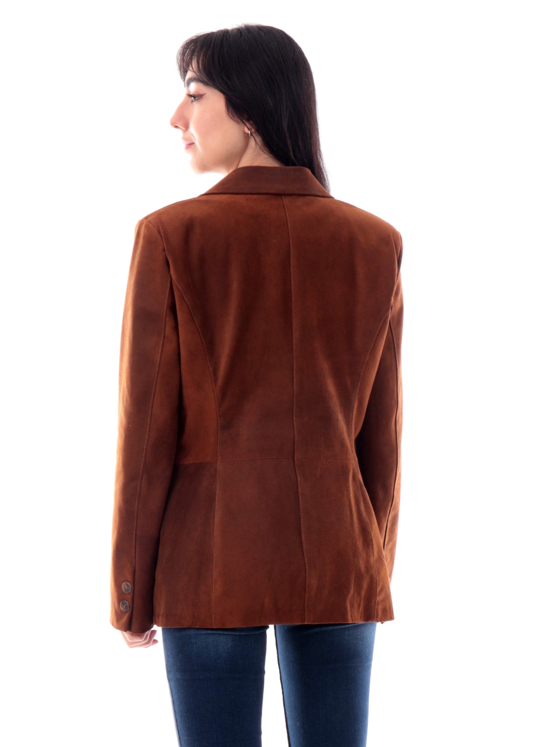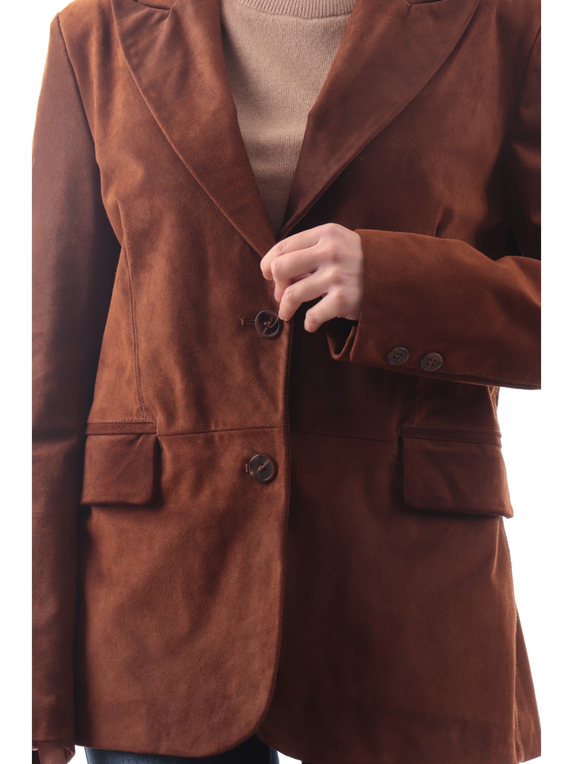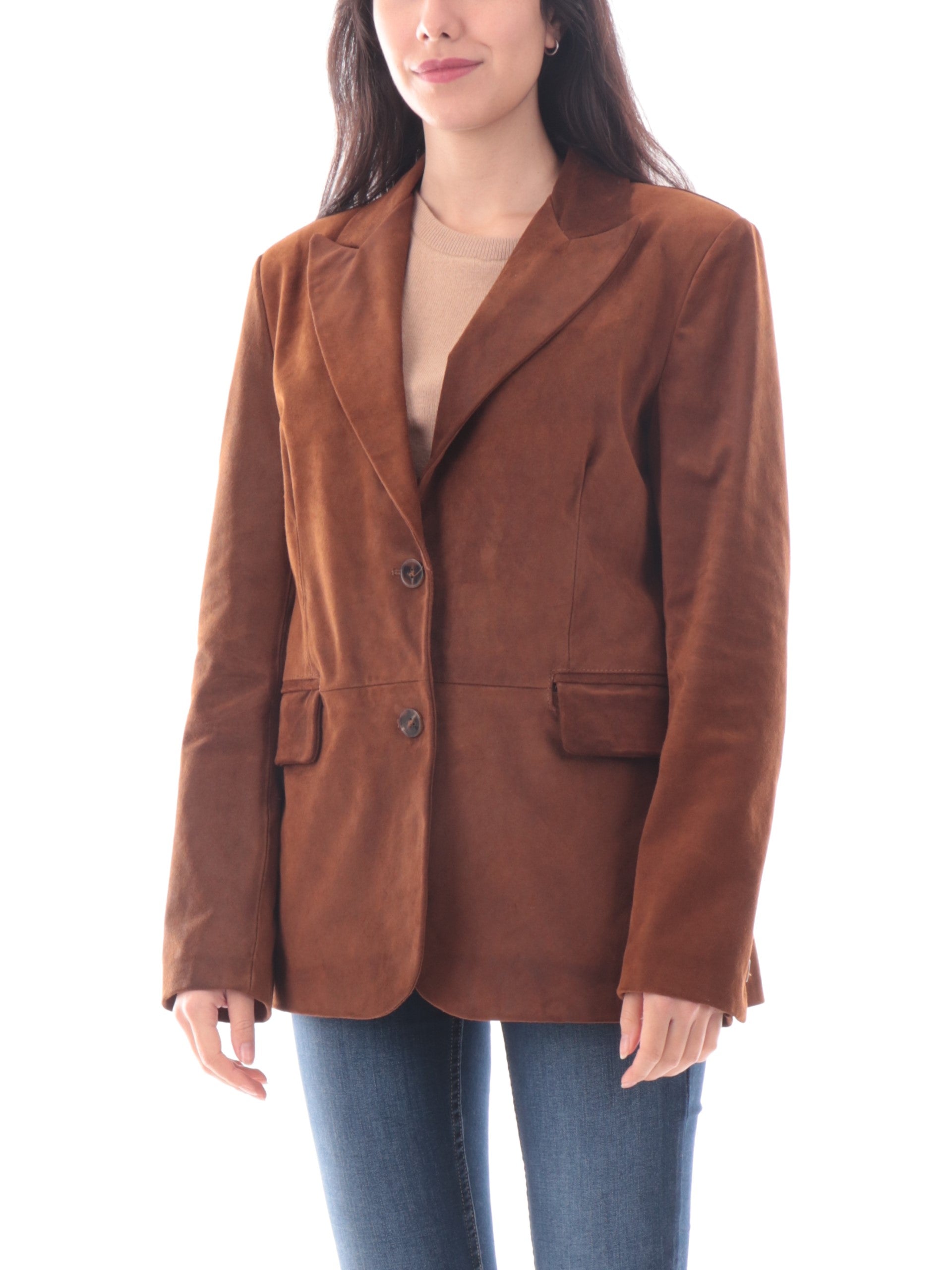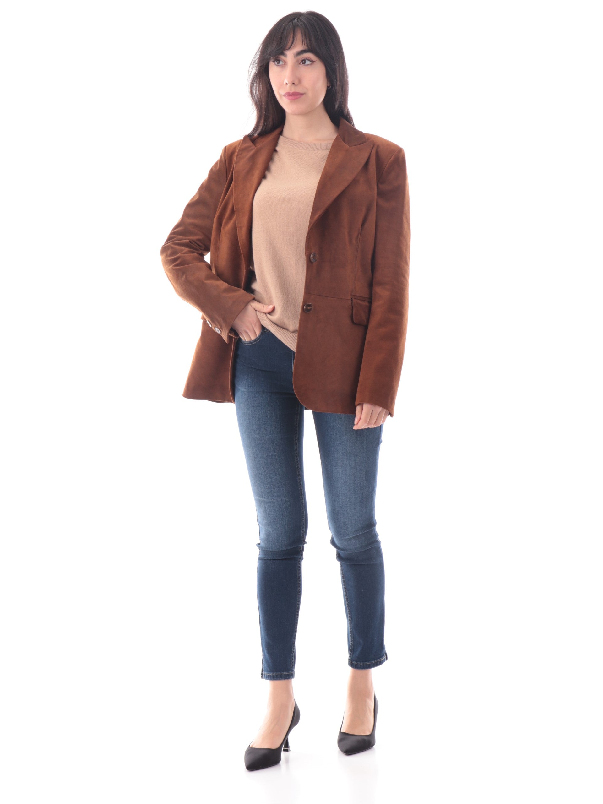 Giacca marrone Vicolo da donna in vera pelle scamosciata. Questa giacca marrone da donna Vicolo è realizzata da vera pelle scamosciata ed è caratterizzata dalla chiusura a due bottoni, polsini regolabili con bottoni e due tasche laterali aperte con patta. Questa gicca in vera pelle si può adattare sia su un look elegante e sia su un look casual