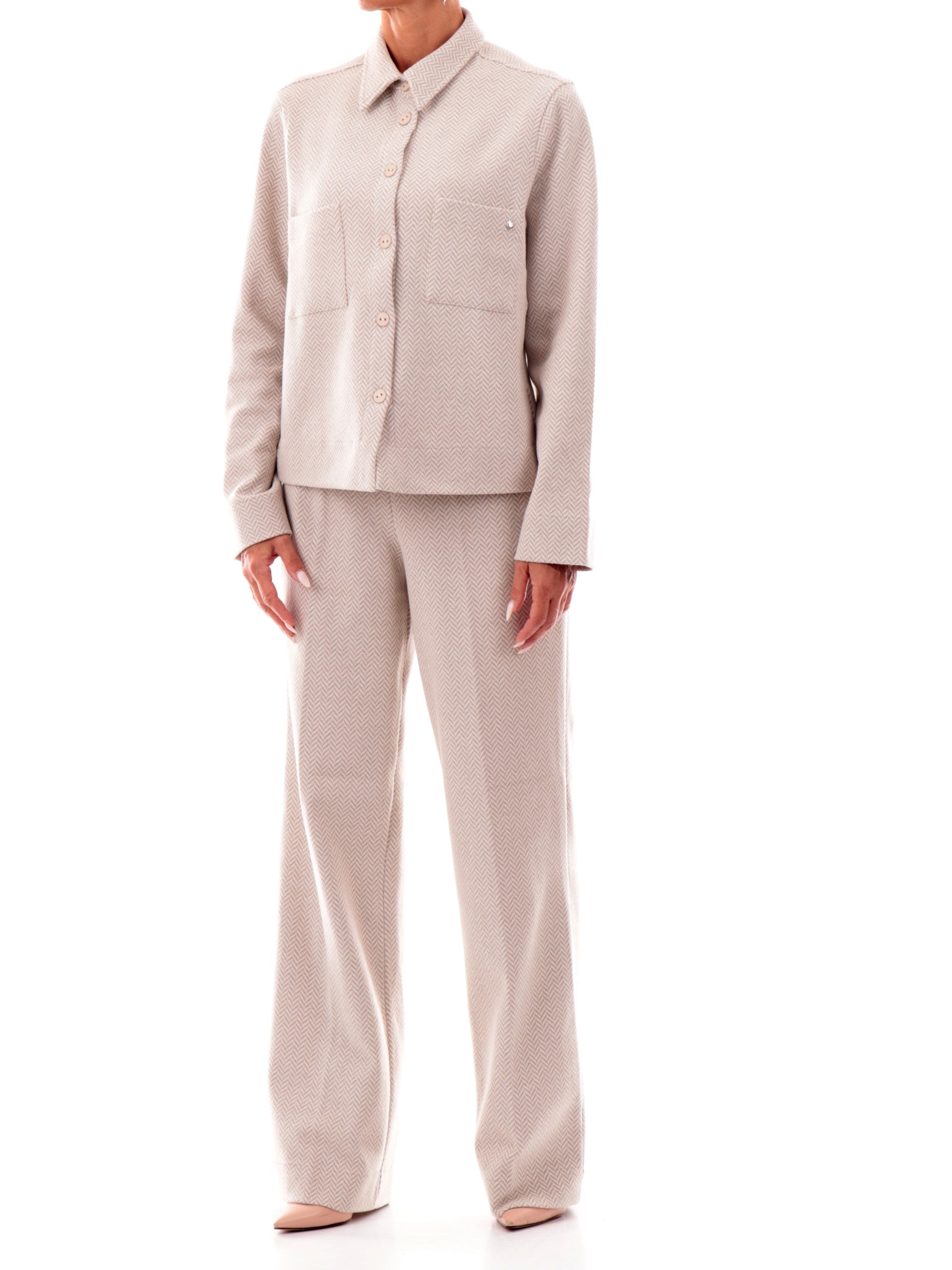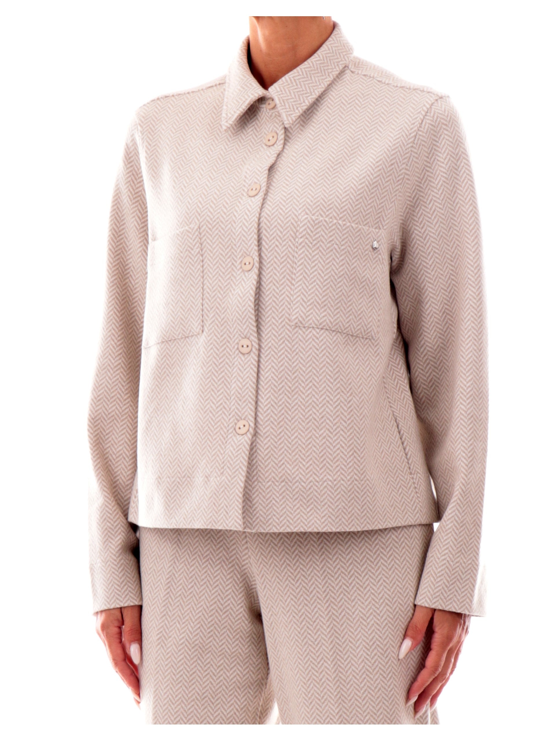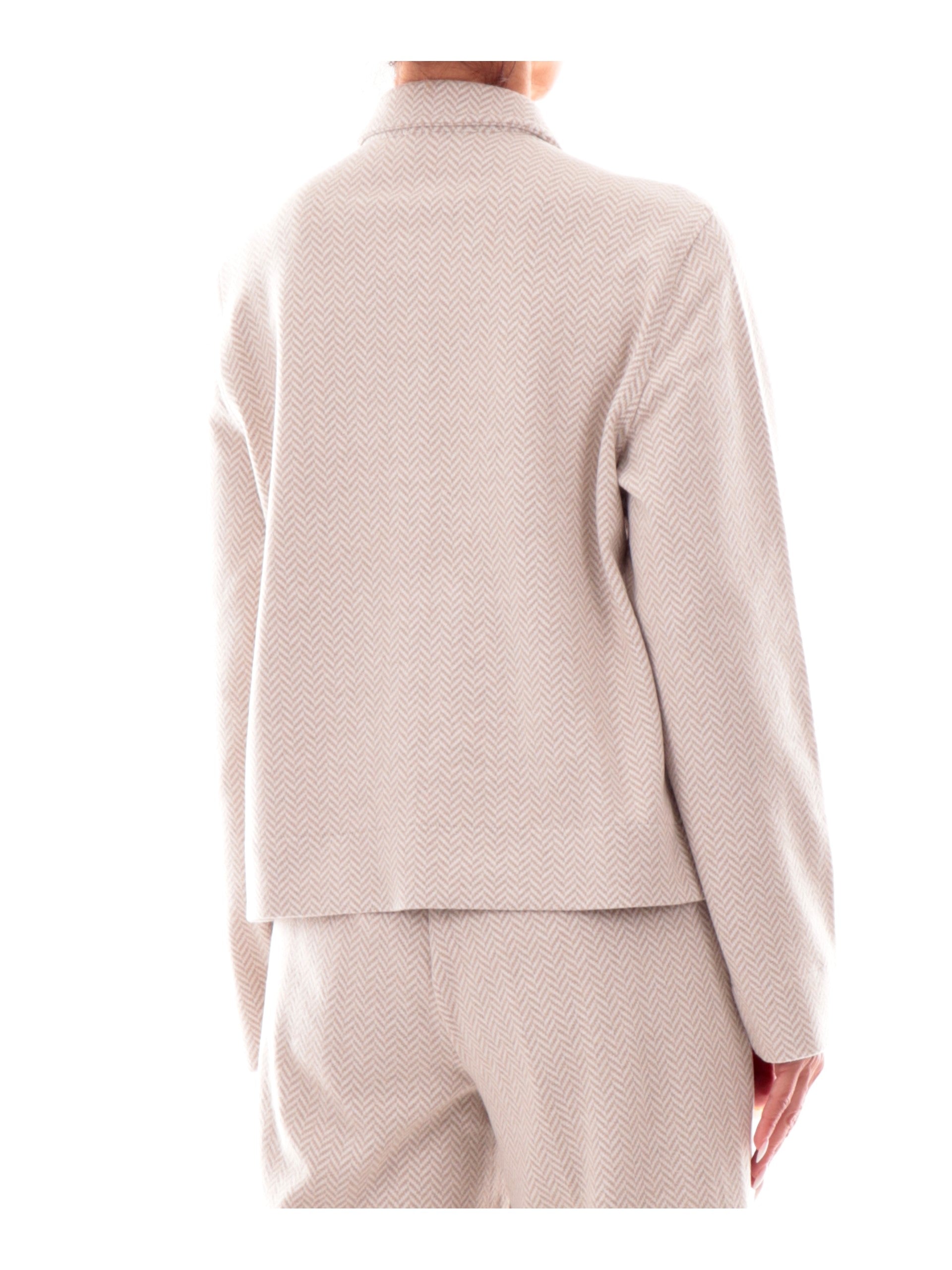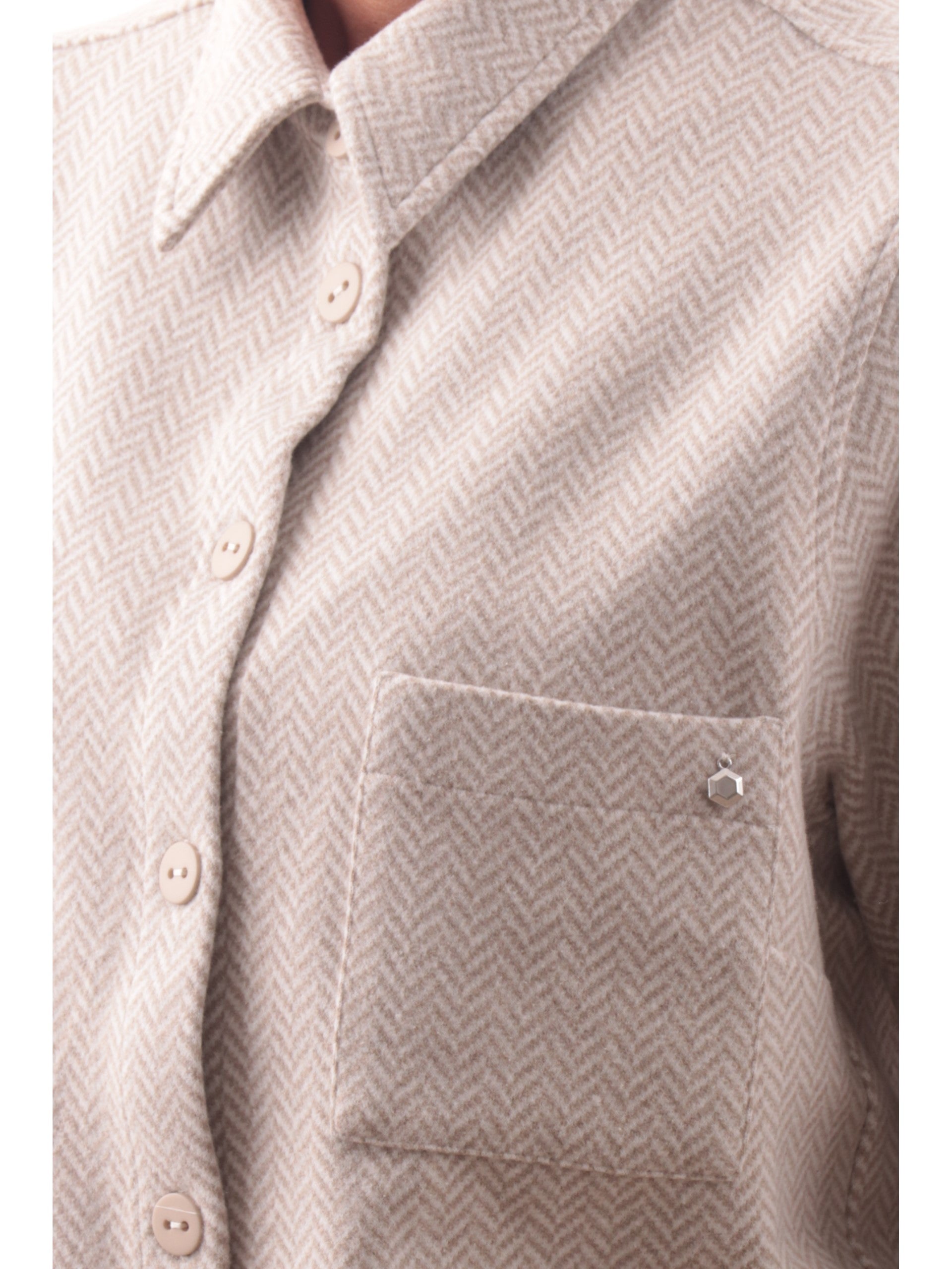 Giacca Ragno bianca da donna con tasche DR38GB, realizzata in cotone. Questa giacca donna Ragno bianca ha il colletto alla francese, la chiusura con bottoni, due tasche frontali a filo, la fantasia geometrica e il ciondolo del brand applicato sul lato sinistro.