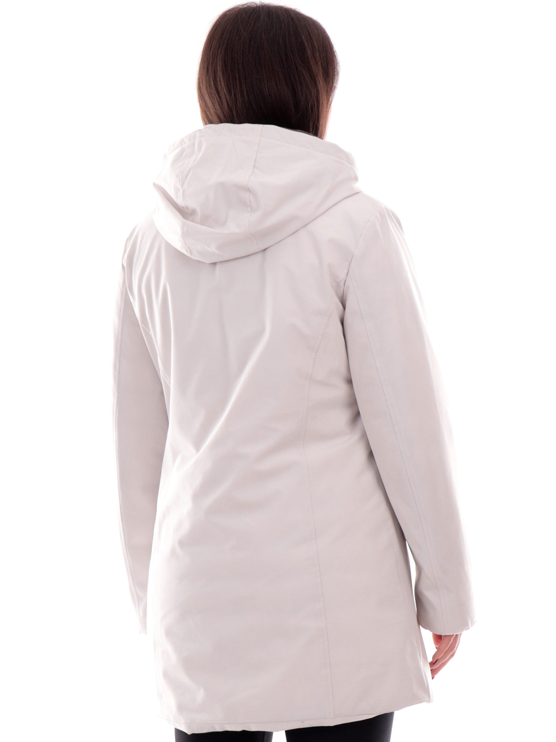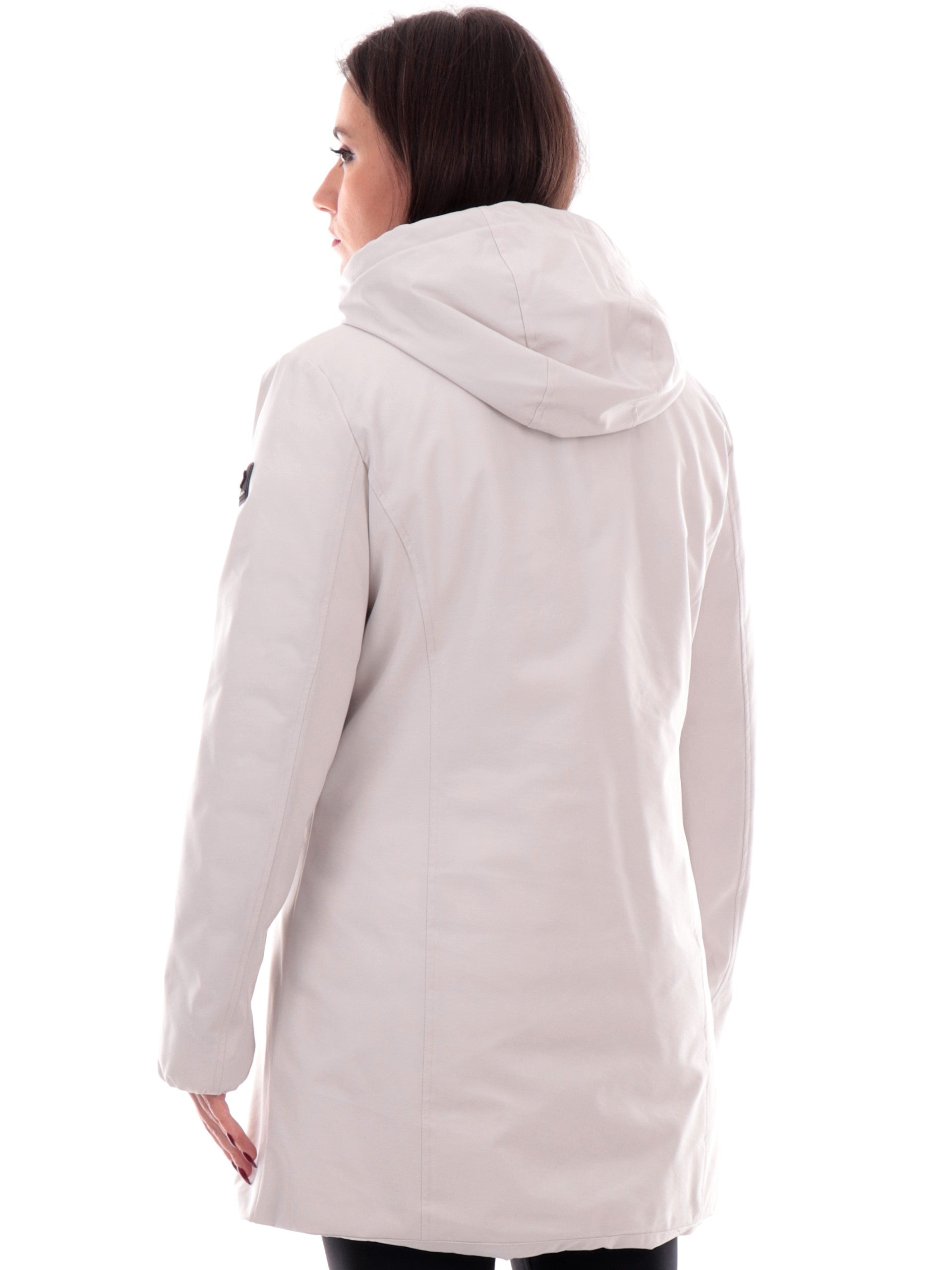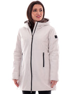 Cappotto Canadian bianco Yorkton Long 4 da donna tessuto tecnico G224381WLG, realizzata con imbottitura eco-friendly. Questa giacca lunga Canadian bianca ha il cappuccio fisso, la chiusura full zip centrale, due tasche laterali termonastrate, il patch del brand applicato sulla manica sinistra a contrasto colore e polsini elasticizzati.