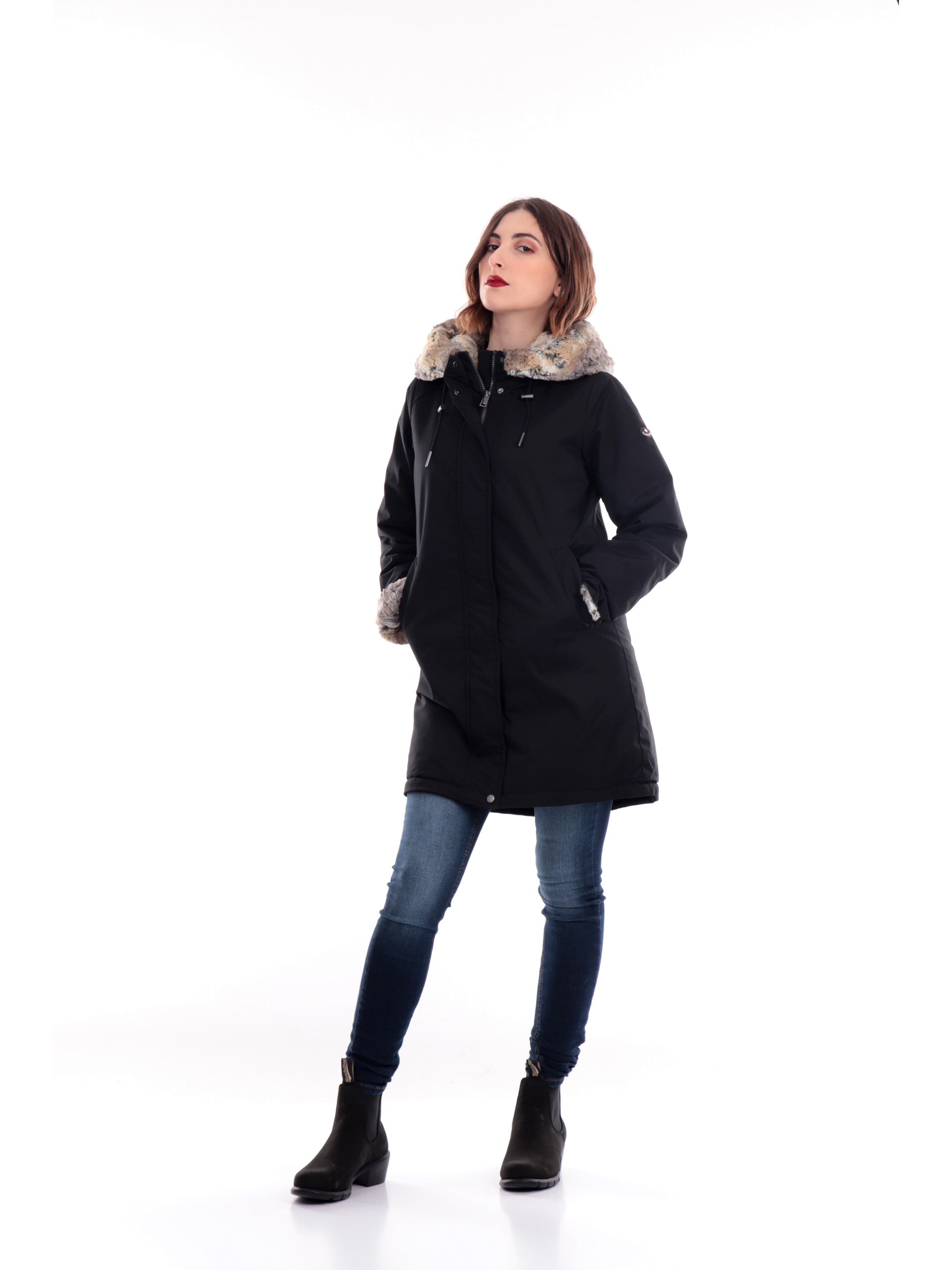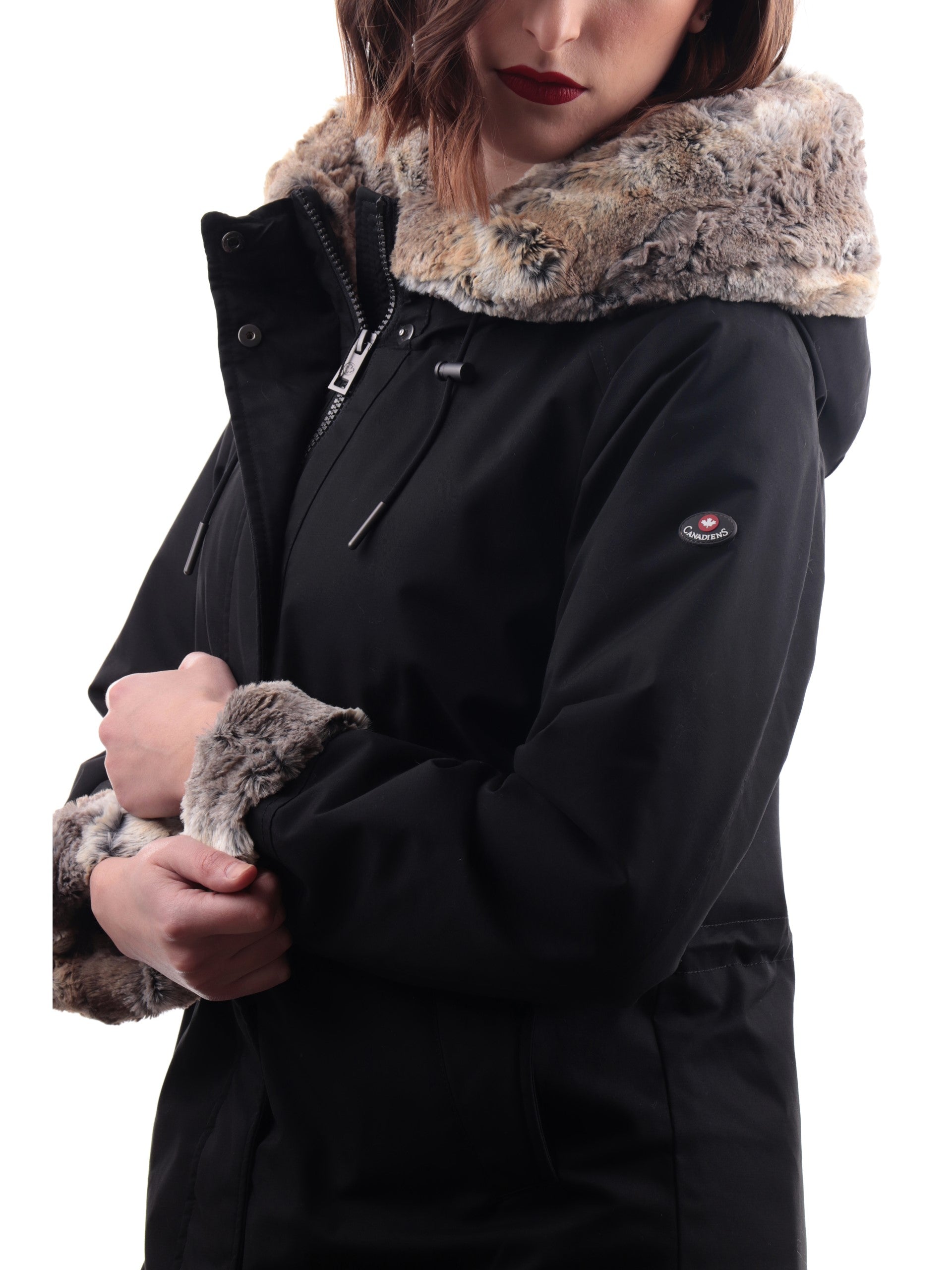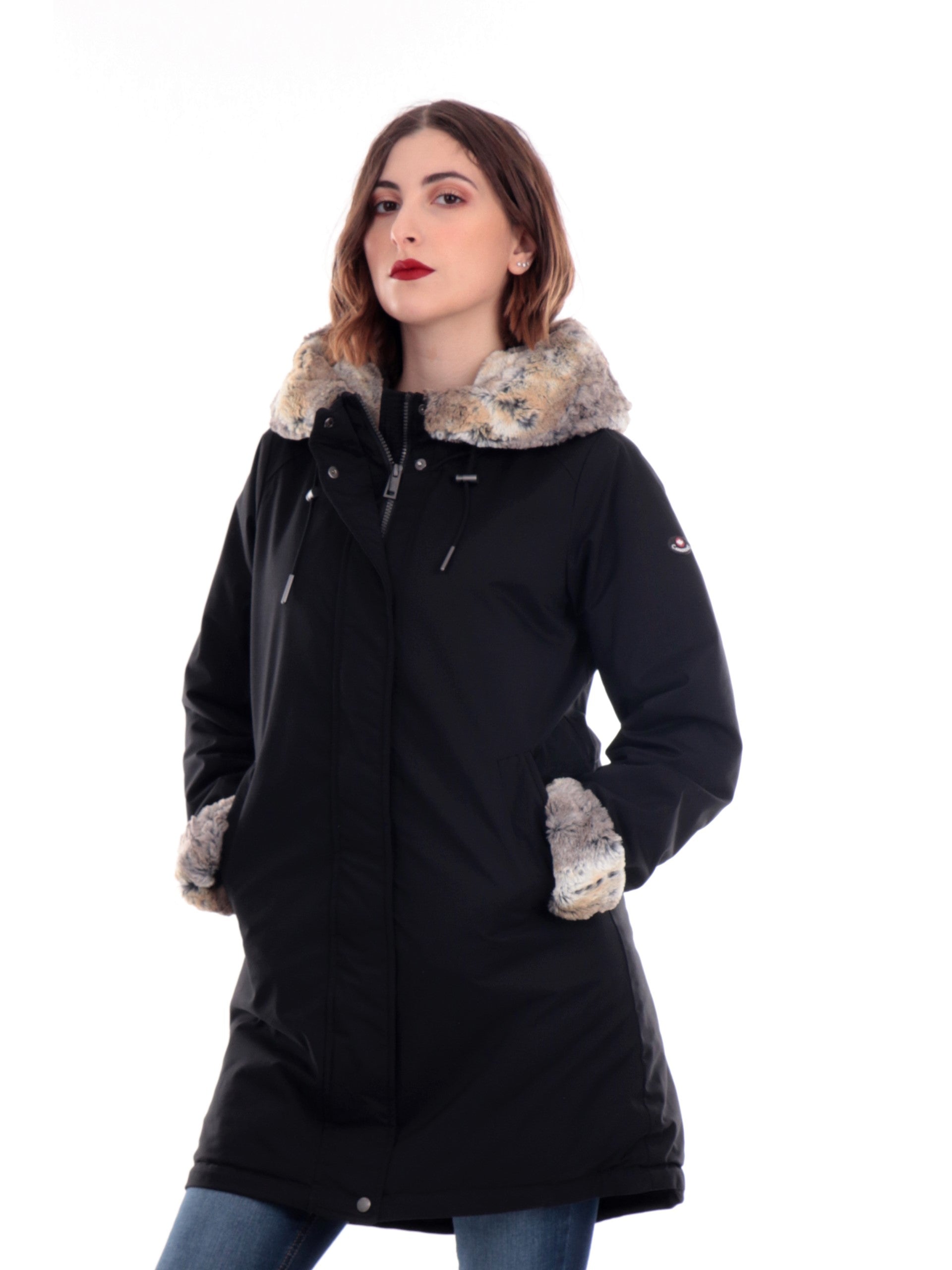 Giacca Canadiens donna nero da donna Audry 3.1 CAP05211N98150099. Questo cappotto Canadiens nero ha il cappuccio fisso con bordatura in pelliccia ecologica regolabile con coulisse, la chiusura full zip doppio cursore nascosta da una patta con bottoni automatici, due tasche laterali con zip, il patch gommato del rand applicato sulla manica sinistra ed il fondo regolare.