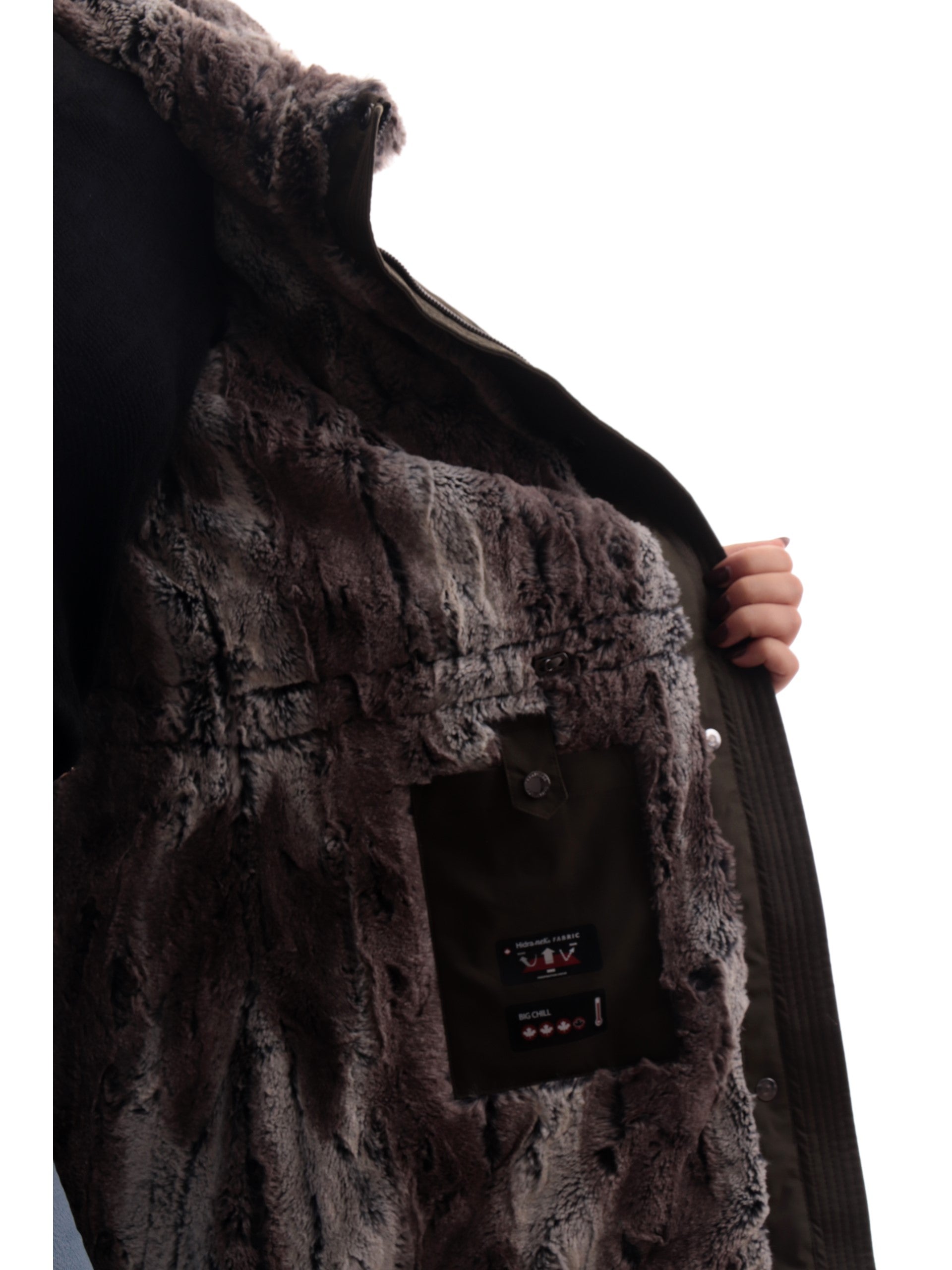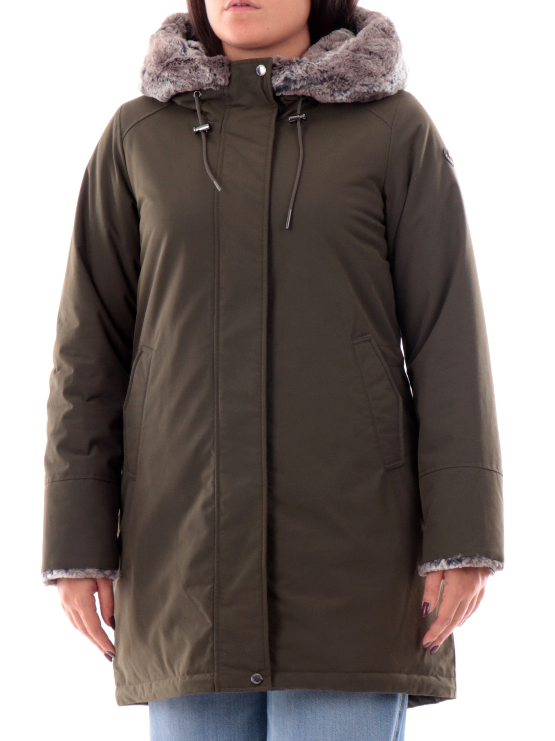 Giacca Canadiens verde militare da donna Audry 3.1 CAP05211N98150099. Questo cappotto Canadiens verde militare ha il cappuccio fisso con bordatura in pelliccia ecologica regolabile con coulisse, la chiusura full zip doppio cursore nascosta da una patta con bottoni automatici, due tasche laterali con zip, il patch gommato del rand applicato sulla manica sinistra ed il fondo regolare.
