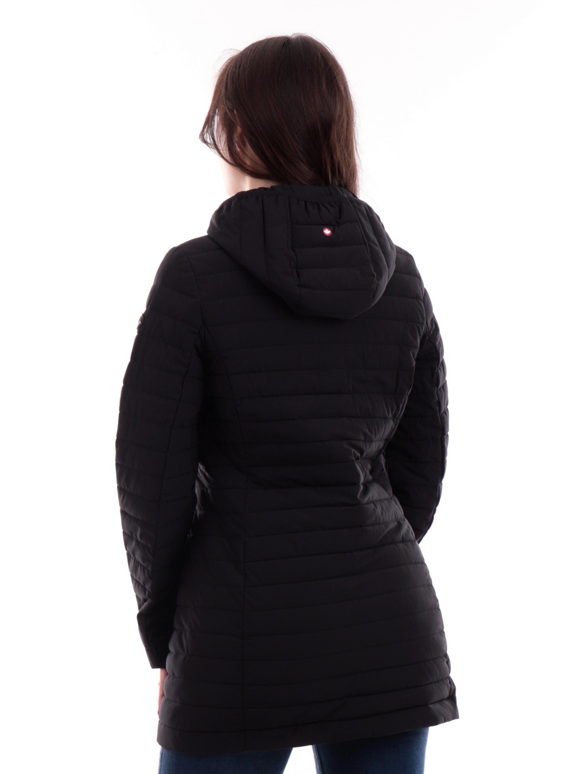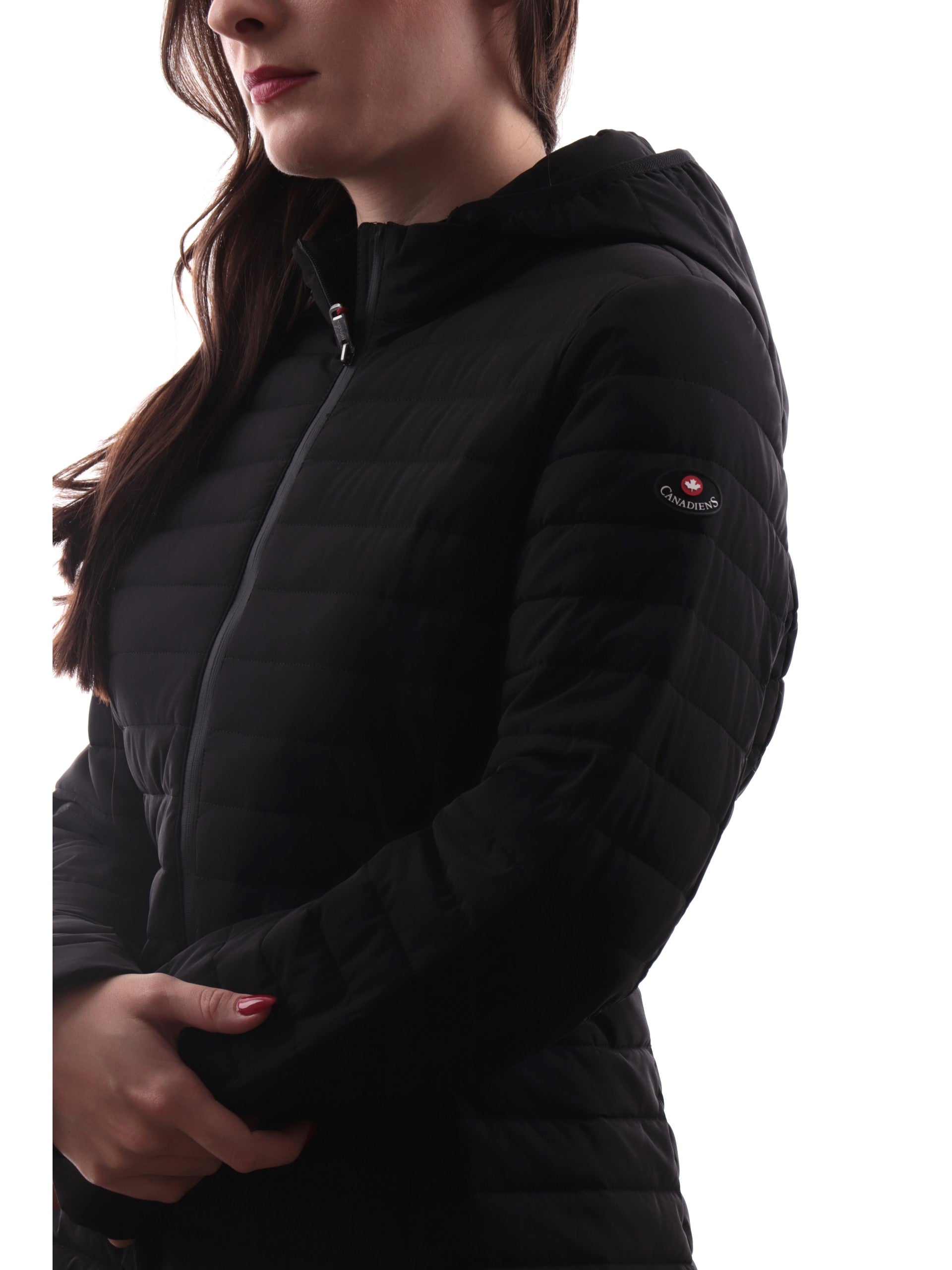 Piumino Canadiens nero da donna realizzato in tessuto trapuntato 0.86 Tech. Questo piumino lungo Canadiens ha il cappuccio removibile con zip , la chiusura full zip centrale, due tasche laterali con zip, i polsini elasticizzati , il fondo regolare e il patch gommato sulla manica sinistra. Questo giacchetto è stato realizzato con un'imbottitura eco-friendly. Le linee trapuntate sagomate rendono questo piumino donna canadiens una giacca invernale femminile e pratica.