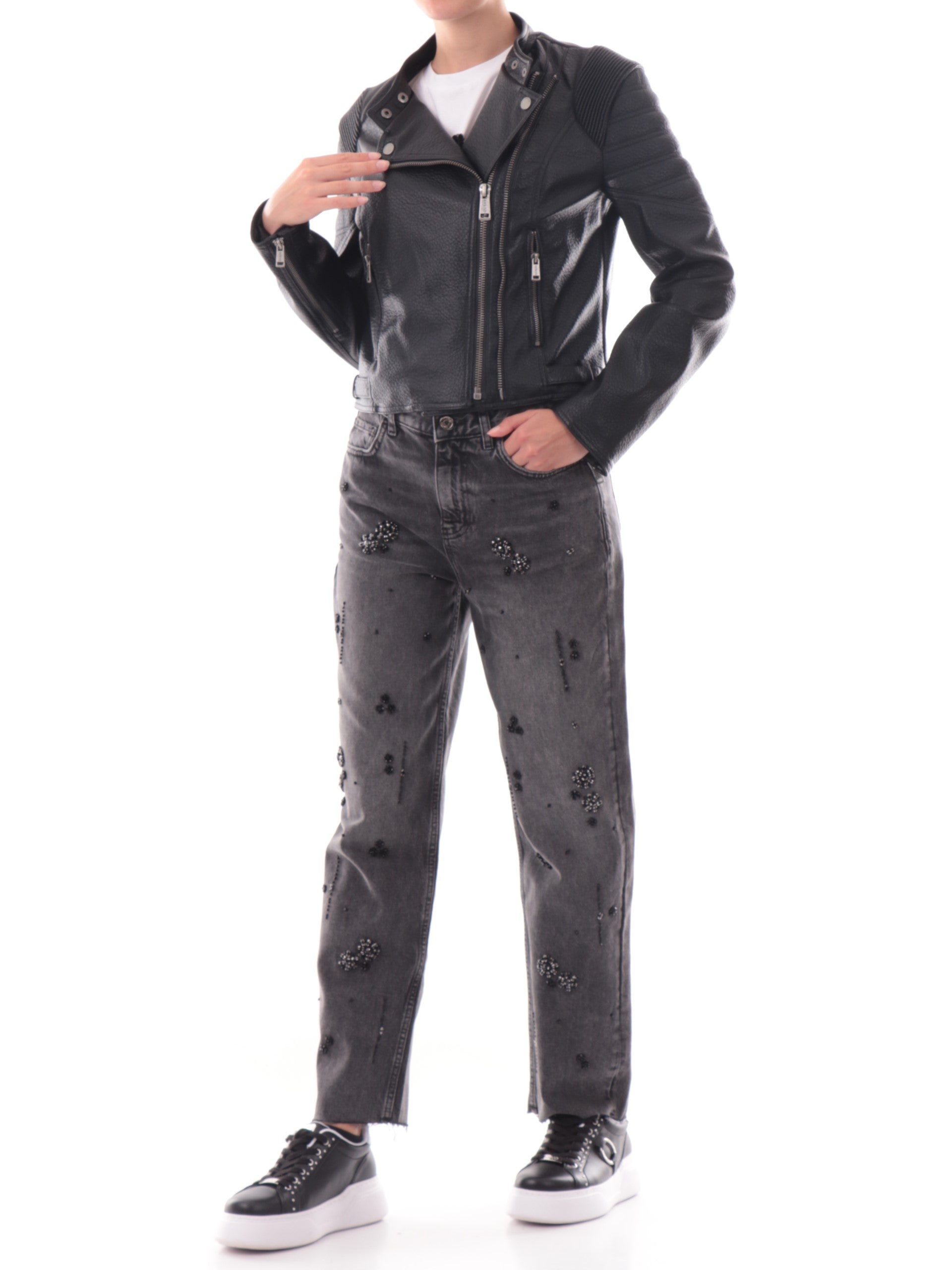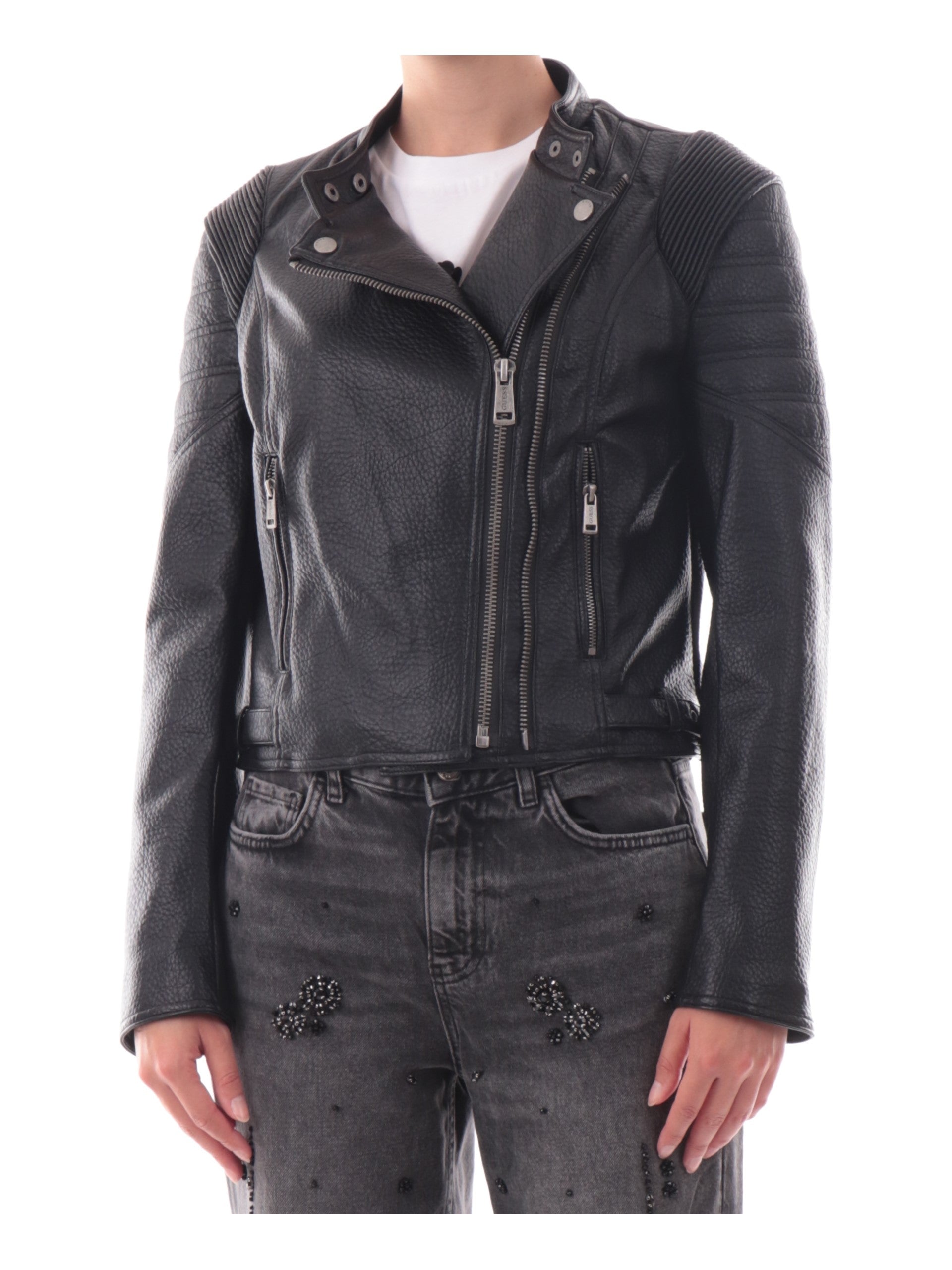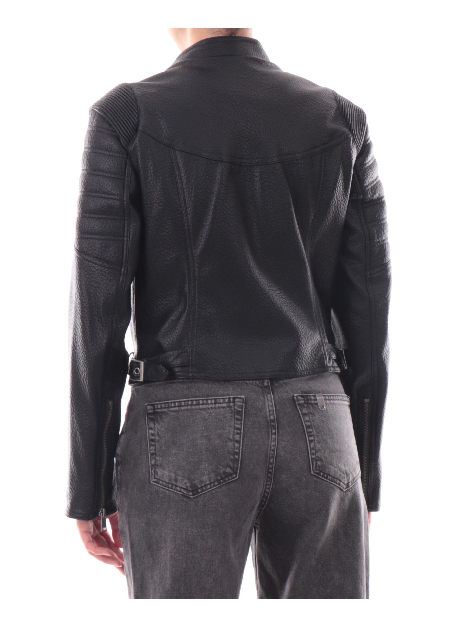 Giacca Guess Nera da donna realizzata in ecopelle chiodo con lavorazione martellata. Giacca Donna Biker Guess martellata con linee audaci e dettagli in metallo lavorato logato.