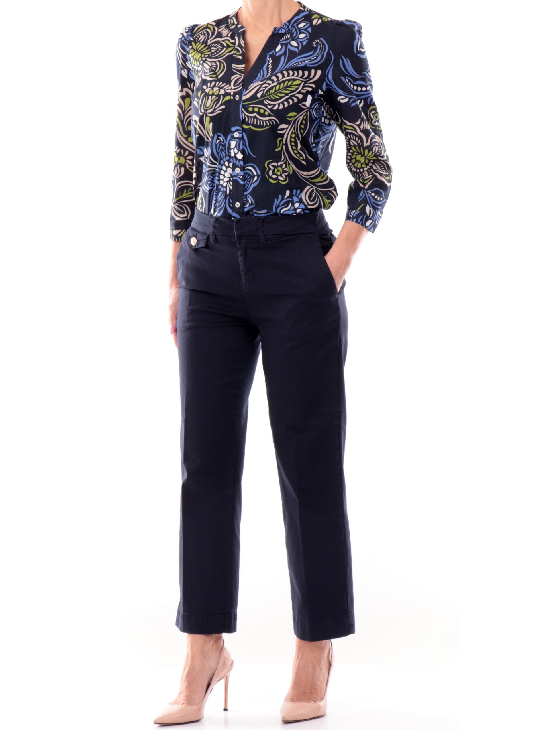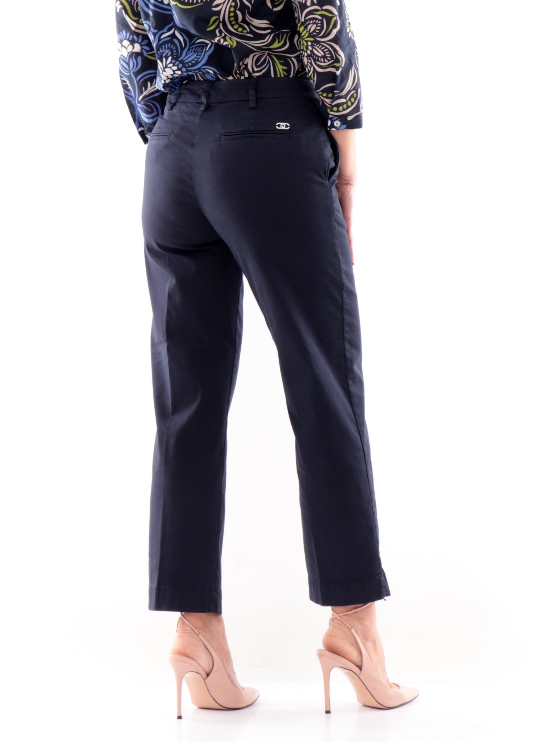 Pantaloni blu Chino Pattine da donna Liu Jo. Questi pantaloni chino, realizzati in cotone, perfetti per la stagione primavera-estate e sono perfetti per qualsiasi tipo di outfit e look. Questi pantaloni blu da donna sono caratterizzati dalla chiusura con bottone più zip, passanti per la cintuta, due tasche oblique aperte più un finto taschino a lato destro, sul retro troviamo due tasche a filo e infine questi pantaloni hanno la gamba dritta