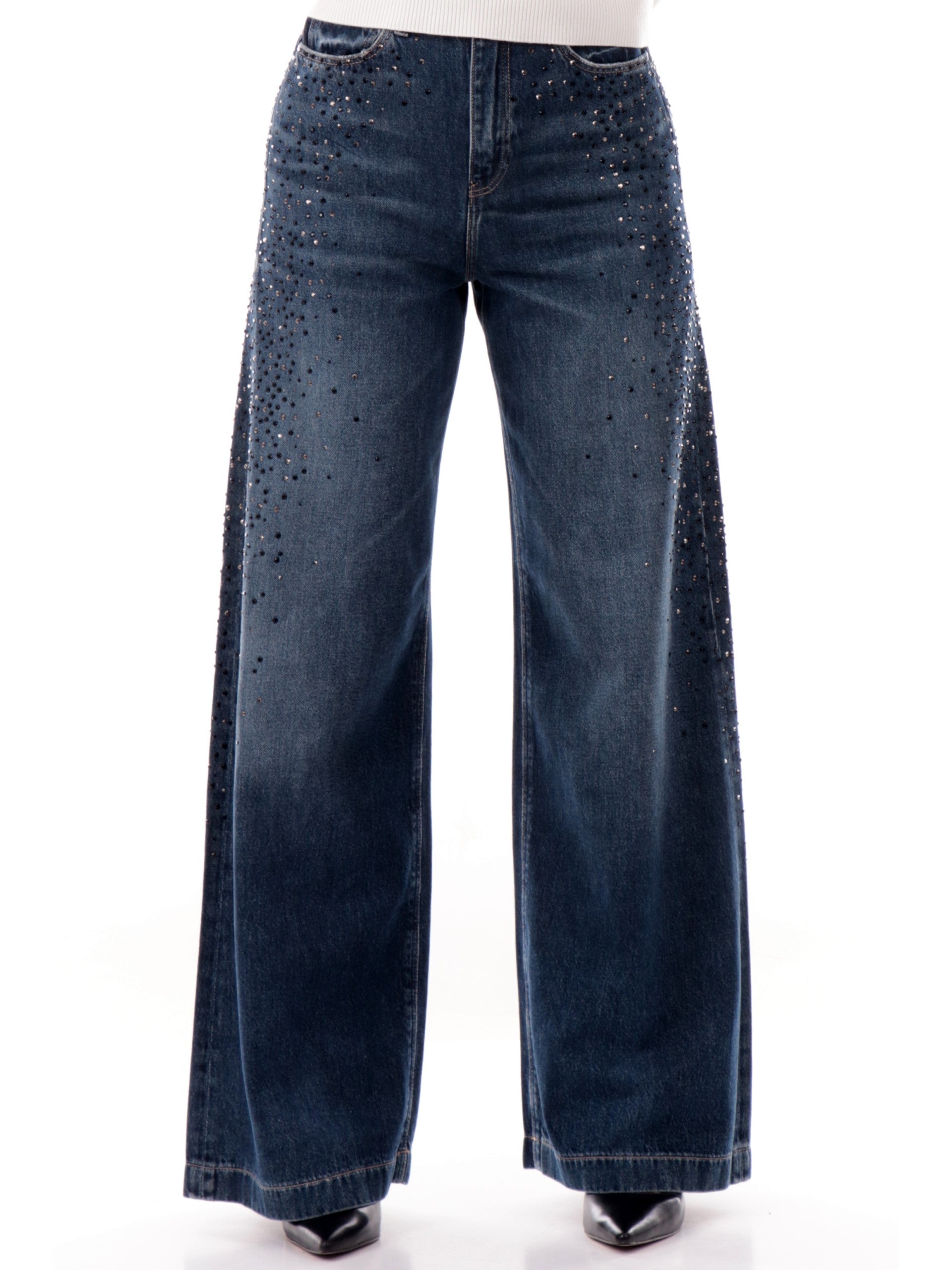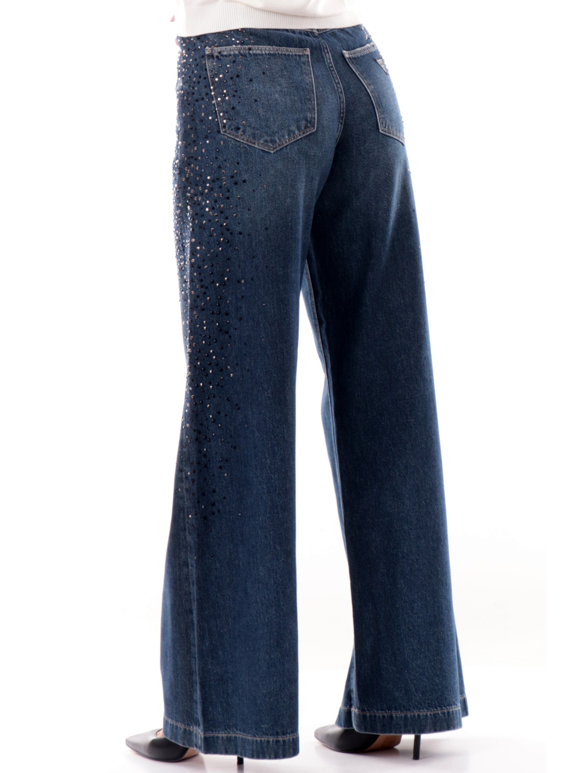 Jeans Guess da donna con strass Bellagio. Questi jeans da donna Guess, realizzati in cotone, sono caratterizzati da cinque comode tasche, di cui una con il logo ricamato sopra, la chiusura con bottone più zip, gamba larga e infine questi jeans Guess sono caratterizzati da strass