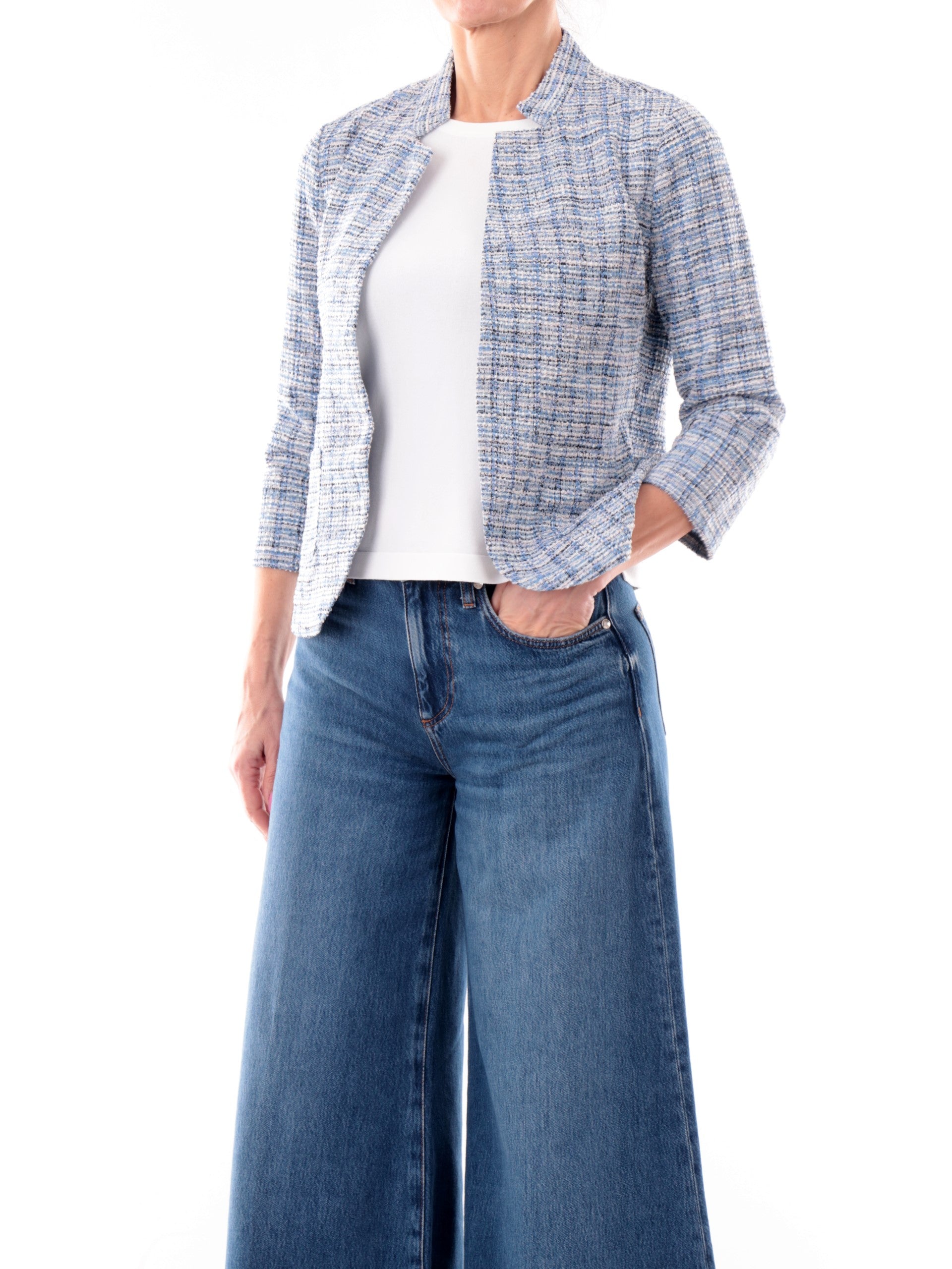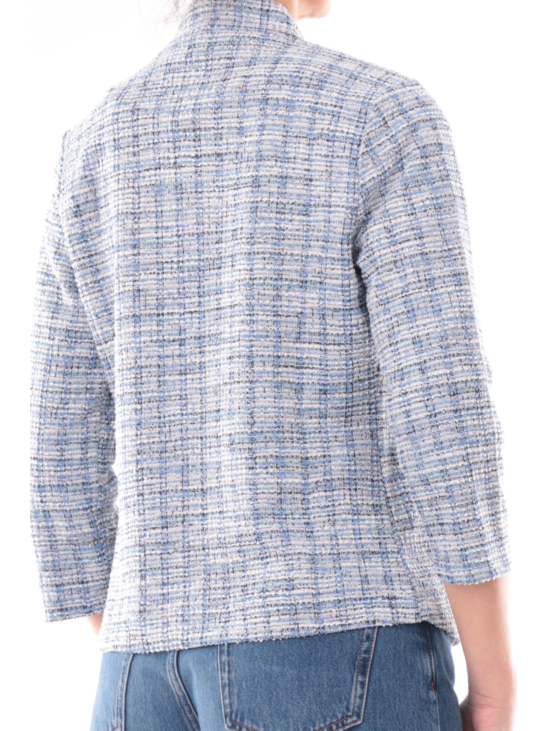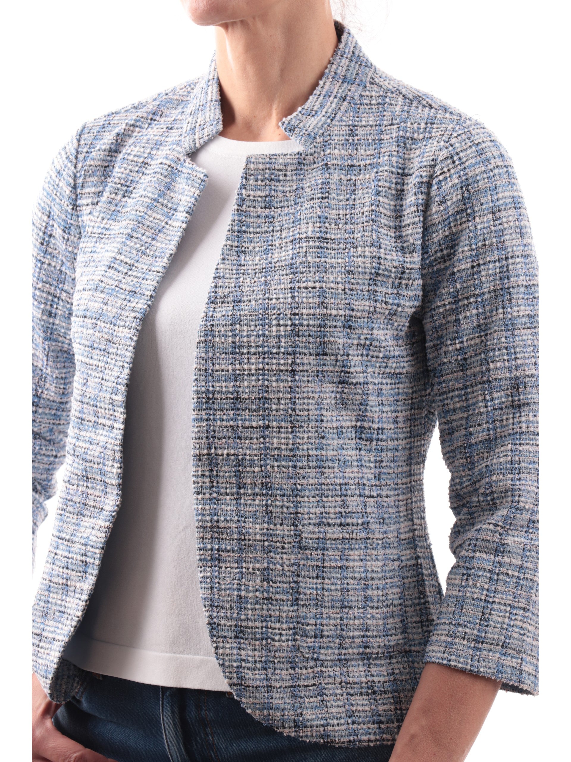 Giacca celeste aperta da donna Anis White in twill e lurex. Questa giacca aperta realizzata in tessuto twill, perfetta per ogni occasioni. Questa giacca versatile in lurex è caratterizzata dal colletto classico, due tasche aperte laterali e maniche a tre quarti