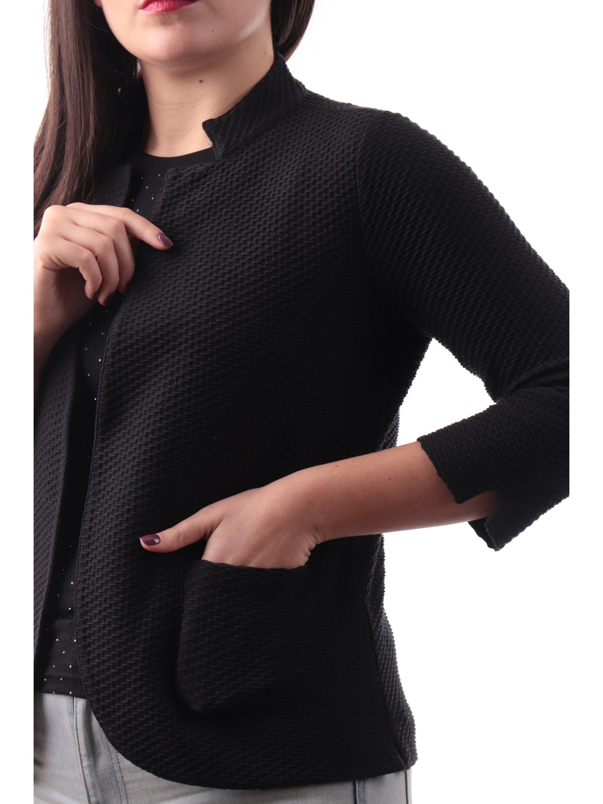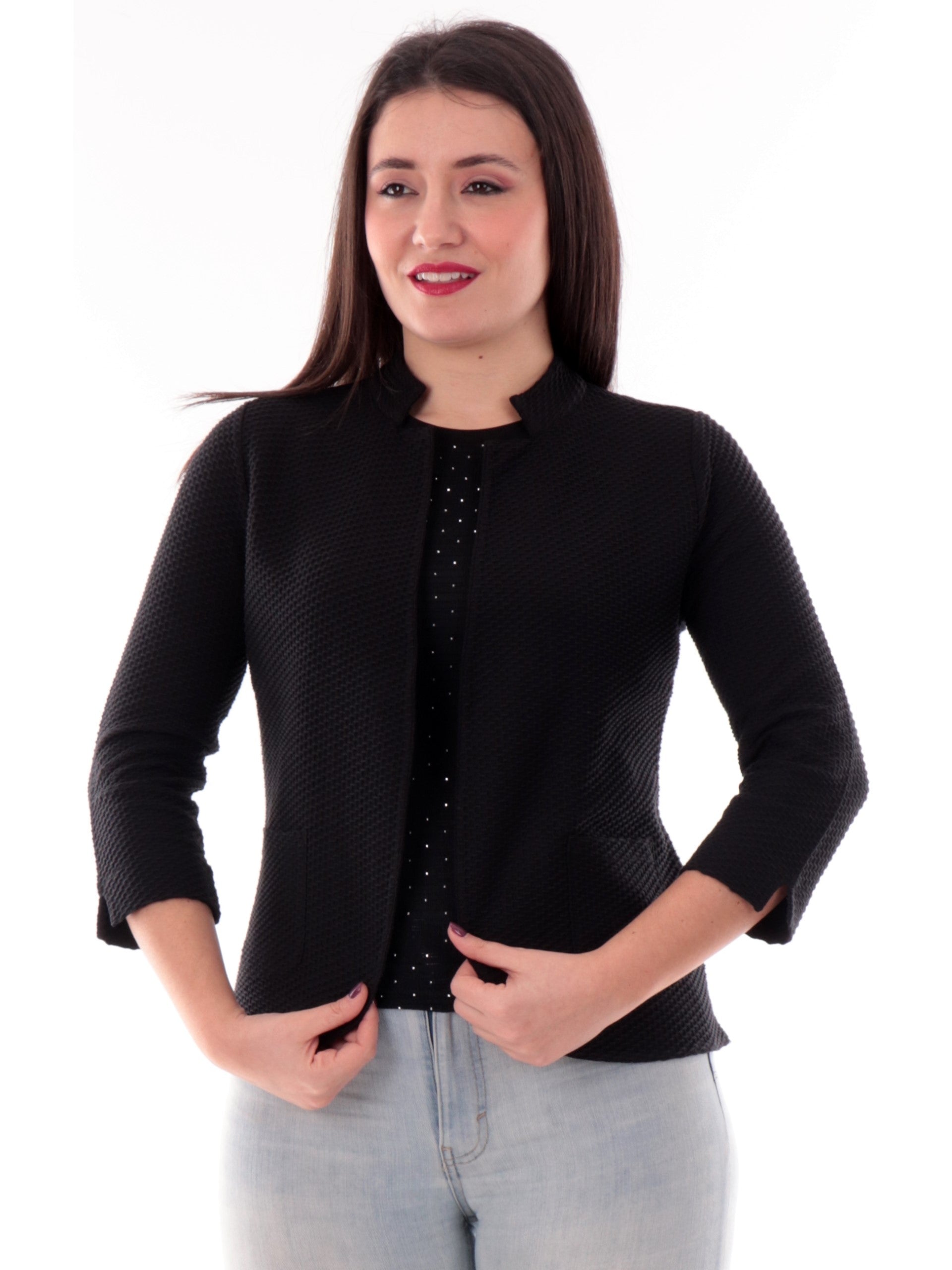 Giacca nera aperta Anis da donna a nido d'ape con maniche a tre quarti. Questa giacca da donna, realizzata in cotone, perfetta per la stagione primavera-estate, è caratterizzata dalla fantasia nido d'ape, sul davanti troviamo due tasche aperte, maniche a tre quarti, spacchi laterali e fondo regolare. Questa giacca Anis è perfetta sia per le occasioni speciali e sia per un look casual