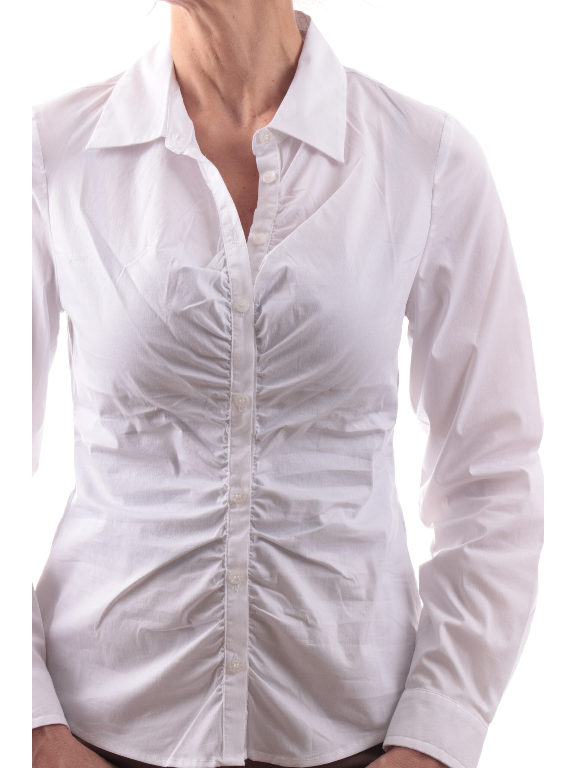 Camicia Guess bianca da donna arricciata Emily Shirred Poplin top. Questa camicia Guess, realizzata in cotone, che la rende morbida e leggera perfetta per la stagione primavera-estate, è caratterizzata dalla chiusura con bottoni, polsini con due bottoni e fondo regolare. Questa camicia bianca da donna è caratterizzata dalla fantasia arricciata sul davanti che la rende elegante e perfetta per un qualsiasi evento